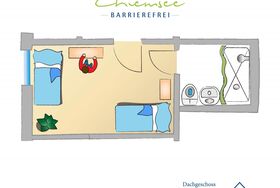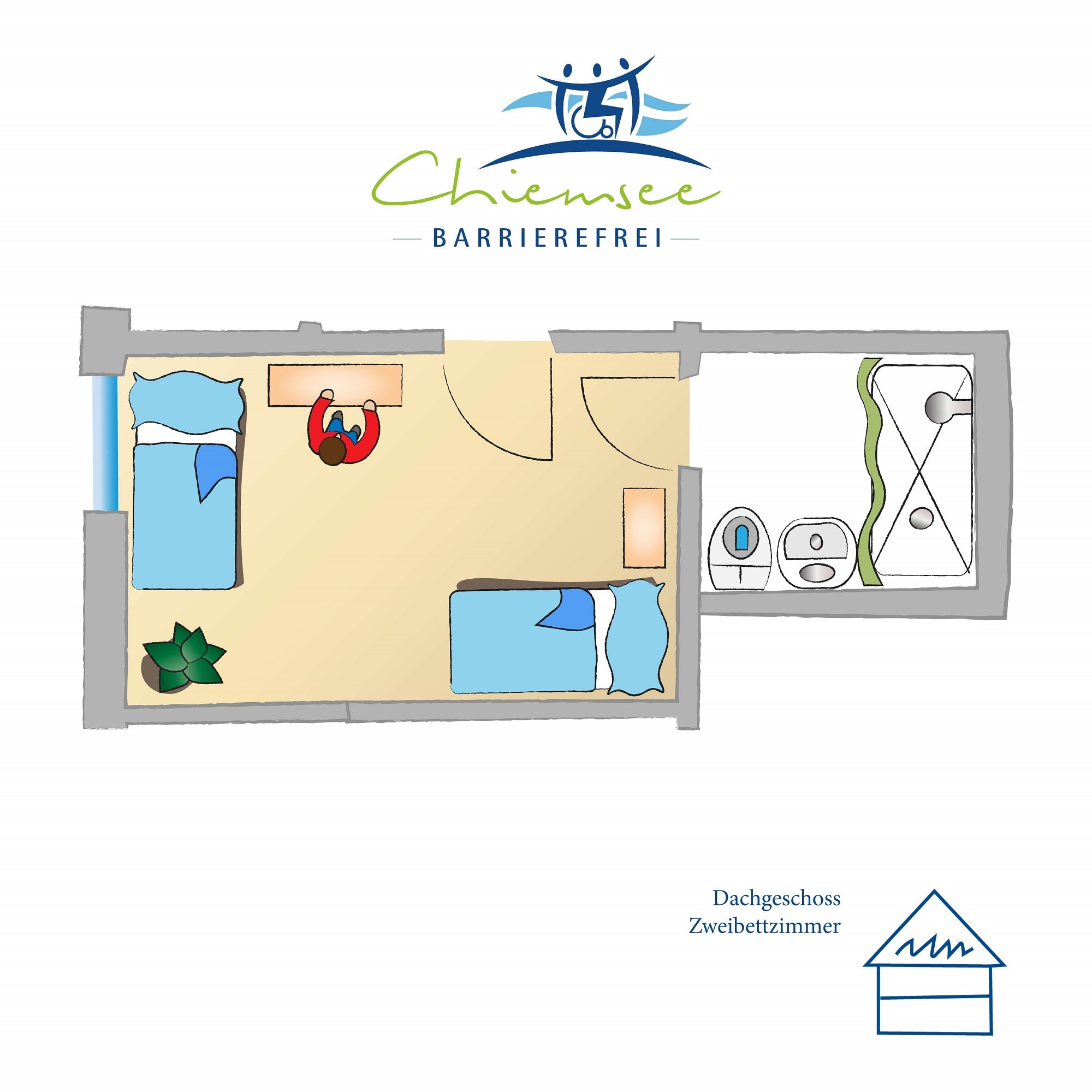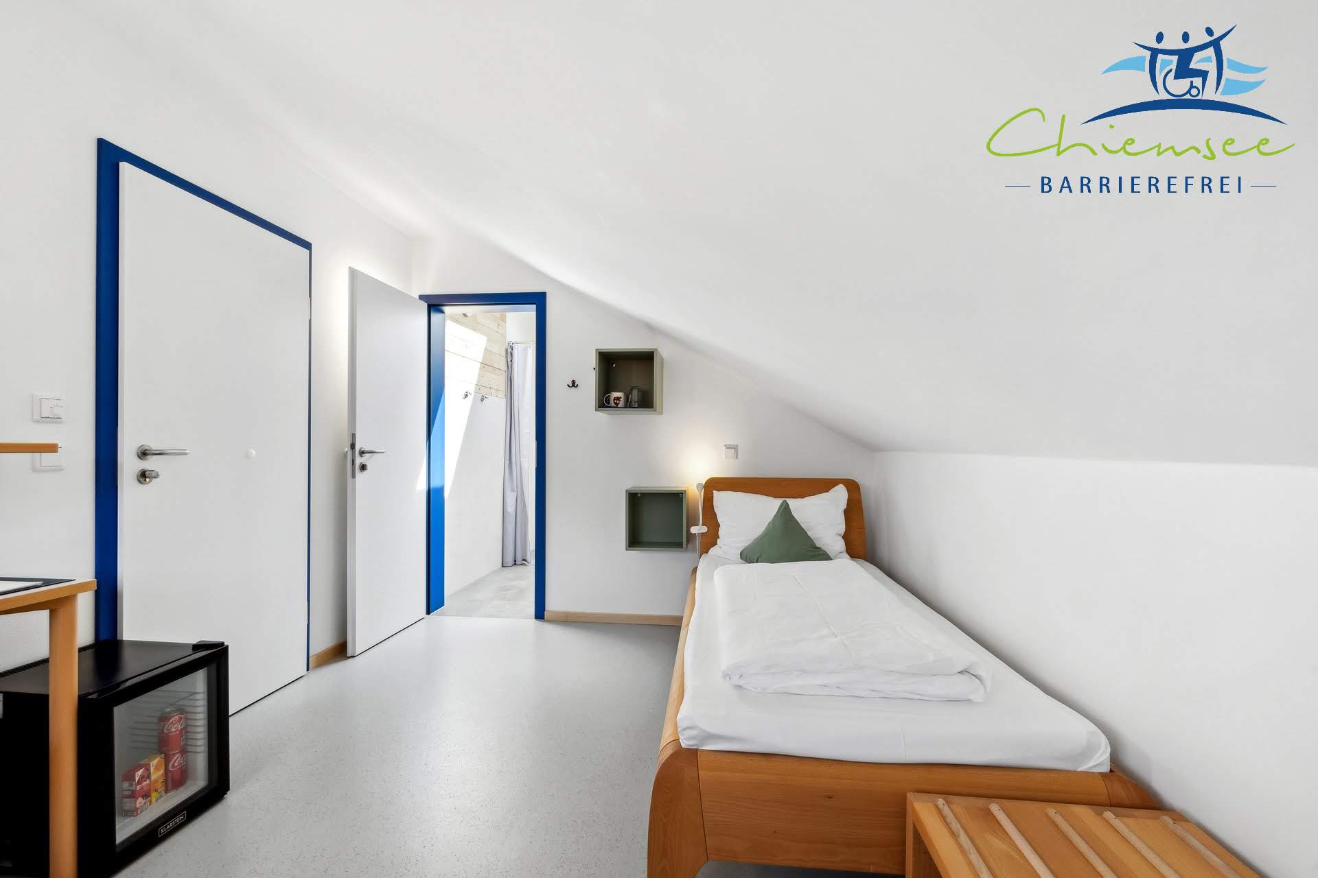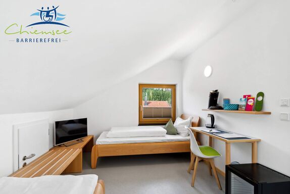 Das Zweibettzimmer hat 17qm, verteilt auf ein Schlafzimmer mit Badezimmer. Es befindet sich im Dachgeschoss des Hauses. Eine Gästemappe mit Ausflugstipps steht bereit. Mit Buchung des Zweibettzimmers haben Sie kostenfreien Zugang zu Fahrrädern, Kettcars, Erlebnisgarten usw. Ein Parkplatz, W-Lan, Bettwäsche, Endreinigung und Handtücherservice sind inbegriffen, auch steht unseren Gästen eine kostenfreie Waschmaschine mit Trockner zur Verfügung. Im Garten finden Sie mehrere Sitzgelegenheiten zum verweilen. Das Zweibettzimmer ist modern und ansprechend gestaltet. Ein kostenfreies Baby-Zustellbett ist erhältlich. Sie können das Zweibettzimmer mit bis zu zwei Personen beziehen. Nutzen Sie unser Zweibettzimmer als Ausgangspunkt für Tagesausflüge zum Chiemsee, in die Alpen und die umliegenden historischen Altstädte. Wir von Chiemsee barrierefrei beraten Sie gerne.