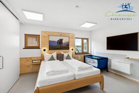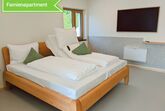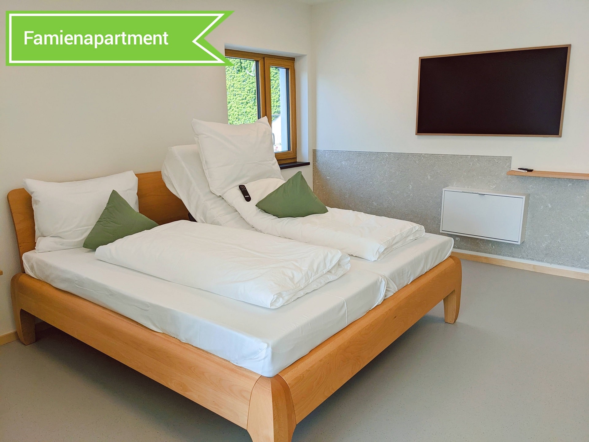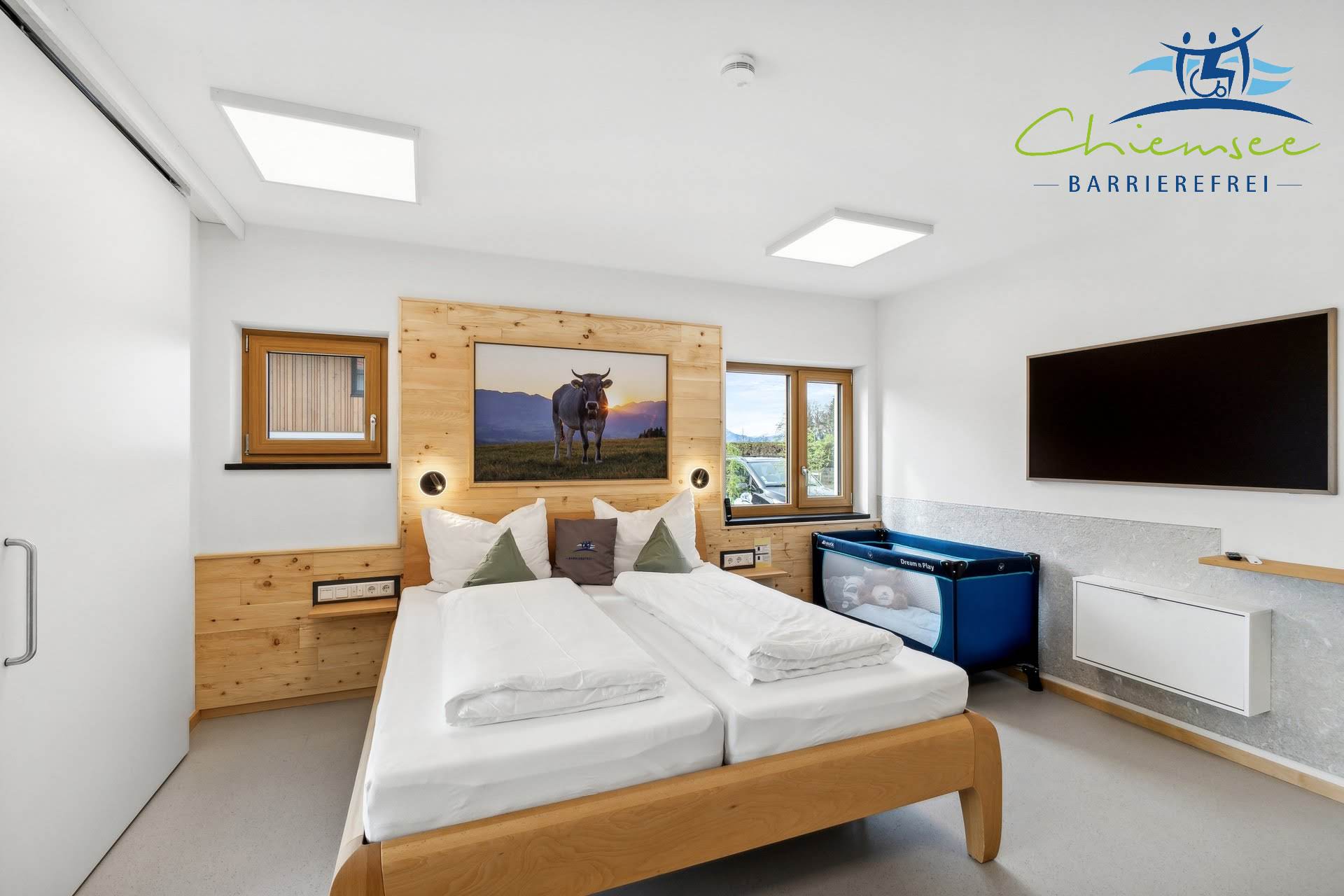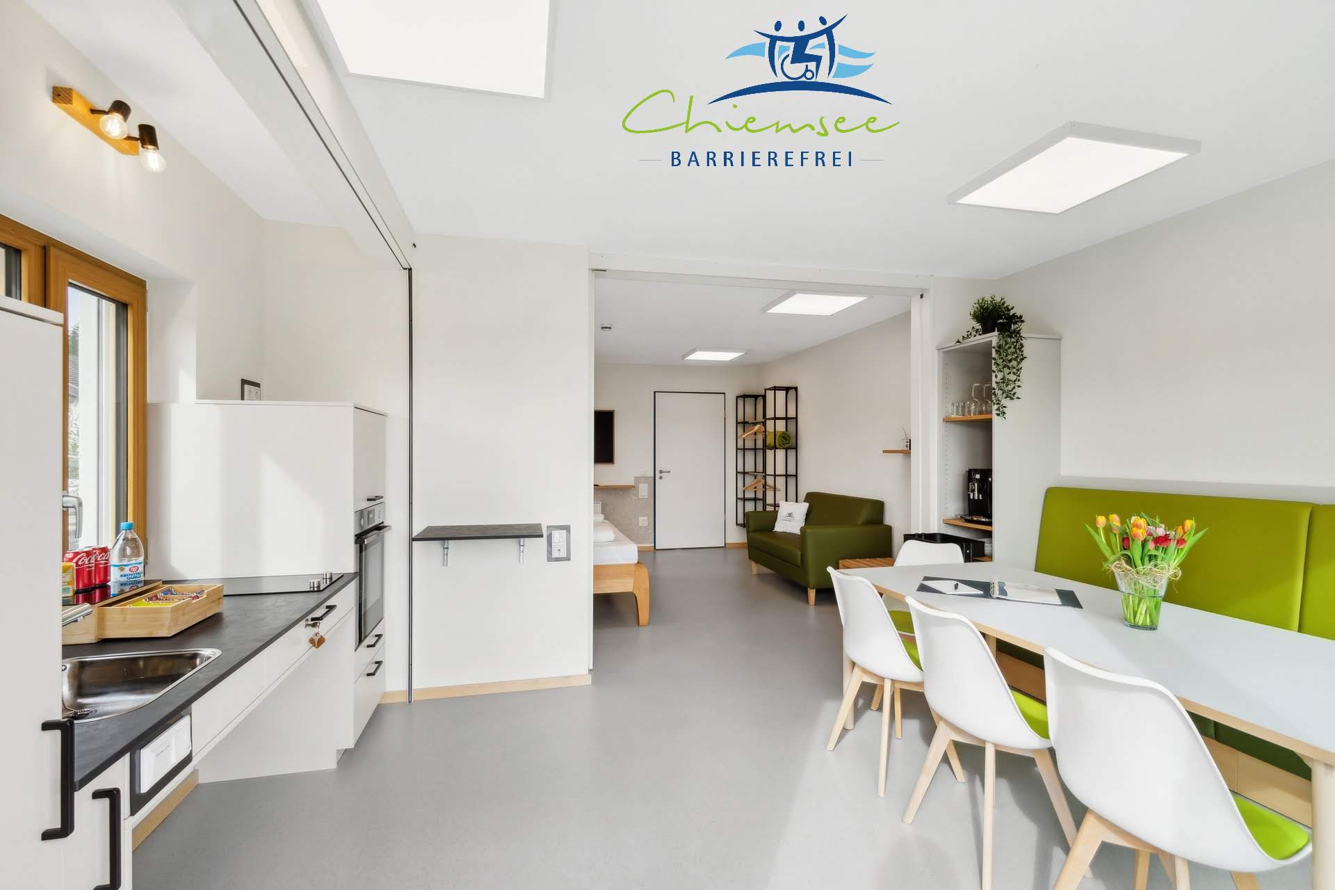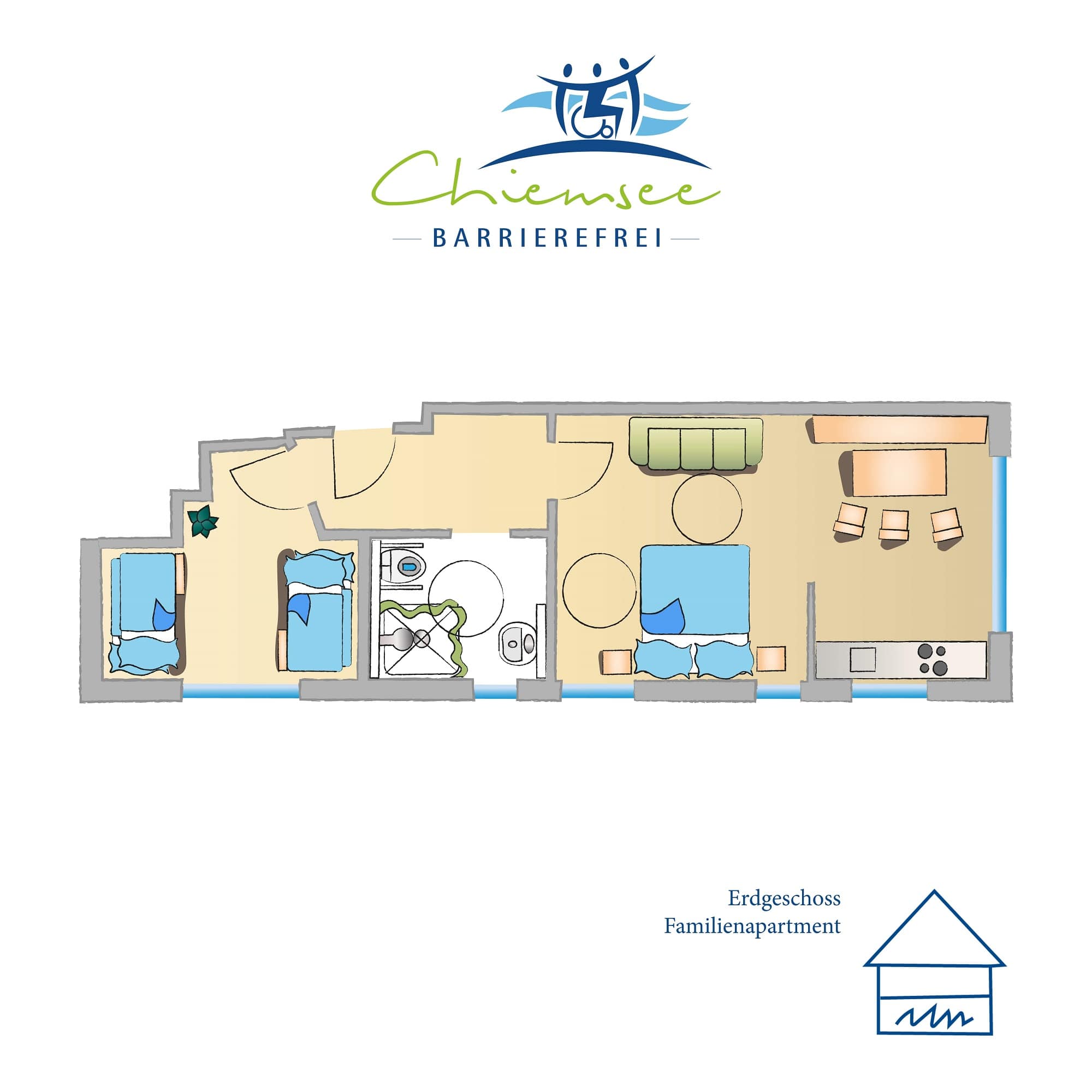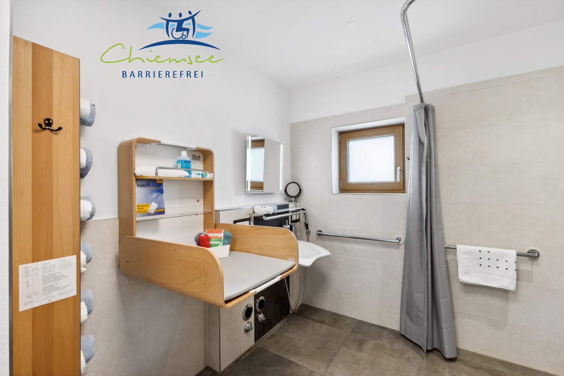 Unser Familienapartment ideal für Familien mit und ohne Behinderungen hat 60qm, verteilt auf zwei Schlafzimmer und einen Koch / Essbereich, sowie Badezimmer. Zudem haben Sie Ihre eigene Terrasse mit Panoramablick. Das Apartment hat eine eigene voll ausgestattete Küche. Es ist komplett nach DIN 18040 barrierefrei für Rollstuhlfahrer nutzbar und befindet sich schwellenfrei im Erdgeschoss. Alle Türen, Terrassentüren und Wendekreise mit 150cm sind auch für breitere E-Rollstühle nutzbar. Alle Informationen sind in leichter Sprache, sowie in Brailleschrift dargestellt. Mit Buchung des Familienapartments haben Sie alle kostenfreie Angebote wie Fahrräder, Kettcars, Klang- / Erlebnisgarten usw. Selbstverständlich alles barrierefrei zugänglich. Ein Parkplatz, W-Lan, Bettwäsche, Endreinigung und Handtücherservice inklusive, auch steht unseren Gästen eine kostenfreie Waschmaschine mit Trockner zur Verfügung (nicht körperlich barrierefrei zugänglich). Das Familienapartment ist modern und ansprechend gestaltet. Im Doppelbett ist ein elektrisch höhenverstellbarer Lattenrost verbaut. Das erleichtert das Ein- / Aussteigen. Zusätzlich benötigte Pflege- / Assistenzhilfsmittel können auf vorherige Anfrage bereitgestellt werden. Auch ein kostenfreies Baby-Zustellbett ist erhältlich. Eine Babywickelliege ist verbaut. Sie können das Familienapartment mit bis zu sechs Personen beziehen. Haustiere sind vorbehaltlich willkommen. Nutzen Sie unser Familienapartment als Ausgangspunkt für Tagesausflüge zum Chiemsee, in die Alpen und die umliegenden historischen Altstädte. Wir von Chiemsee barrierefrei beraten Sie gerne.
