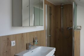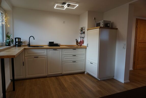 Die Ferienwohnung hat einen offenen Wohn- und Essbereich, eine sehr gut ausgestattete Küche inkl. Geschirrspüler, Kaffeemaschine, Mikrowelle, Wasserkocher und einem Induktionskochfeld (Grundausstattung wie Salz, Pfeffer, Filtertüten vorhanden). Ausgestattet mit einem großem Schlafzimmer mit Doppelbett, einem großzügigen Bad mit Dusche, einem TV und WLAN. Die Außentreppe hat einen integrierten kleinen Balkon mit gemütlicher Bank.