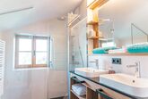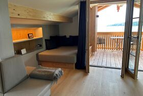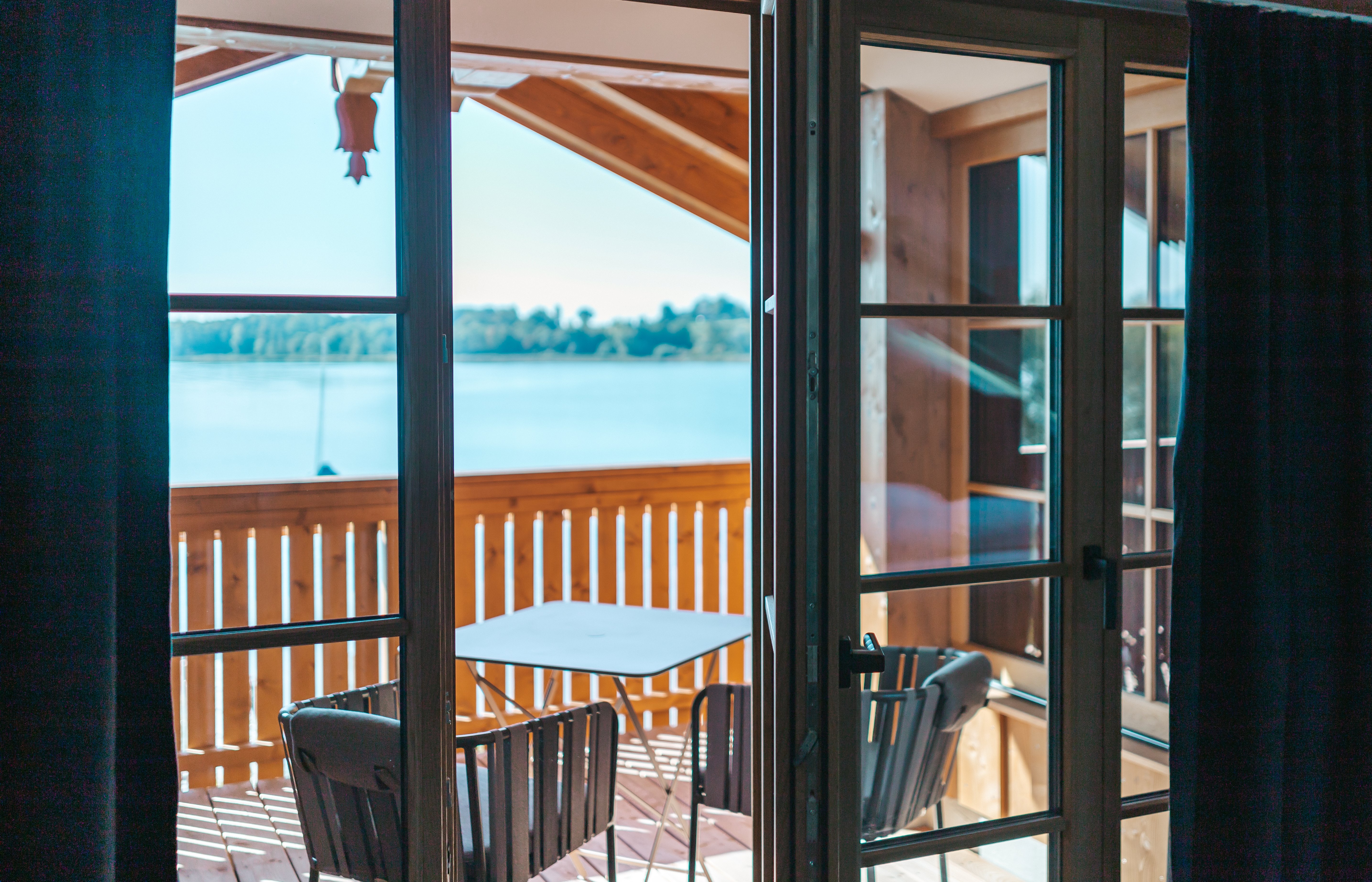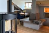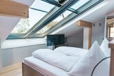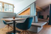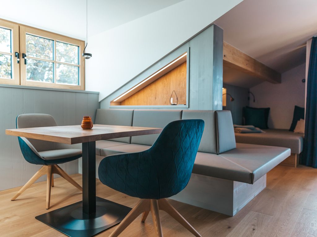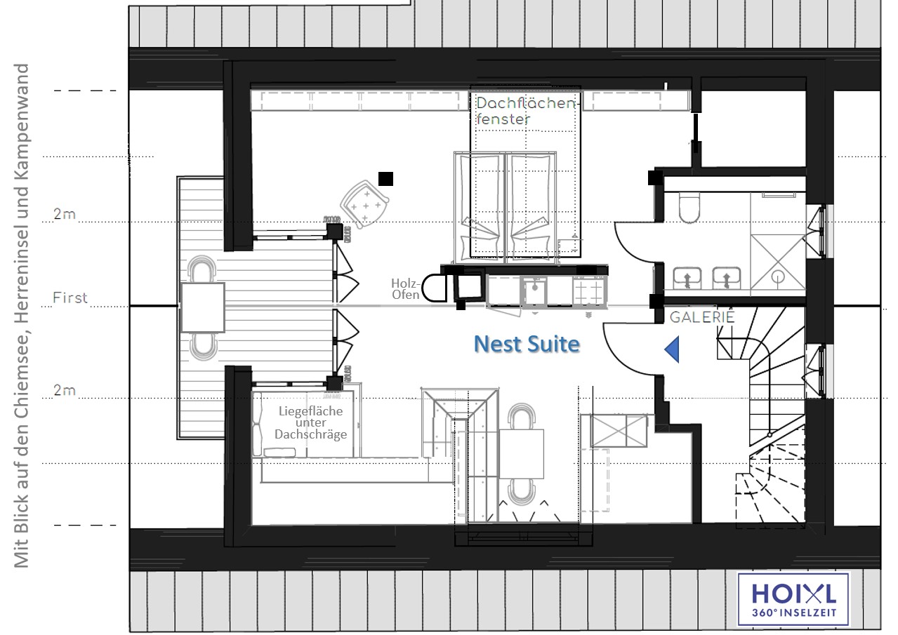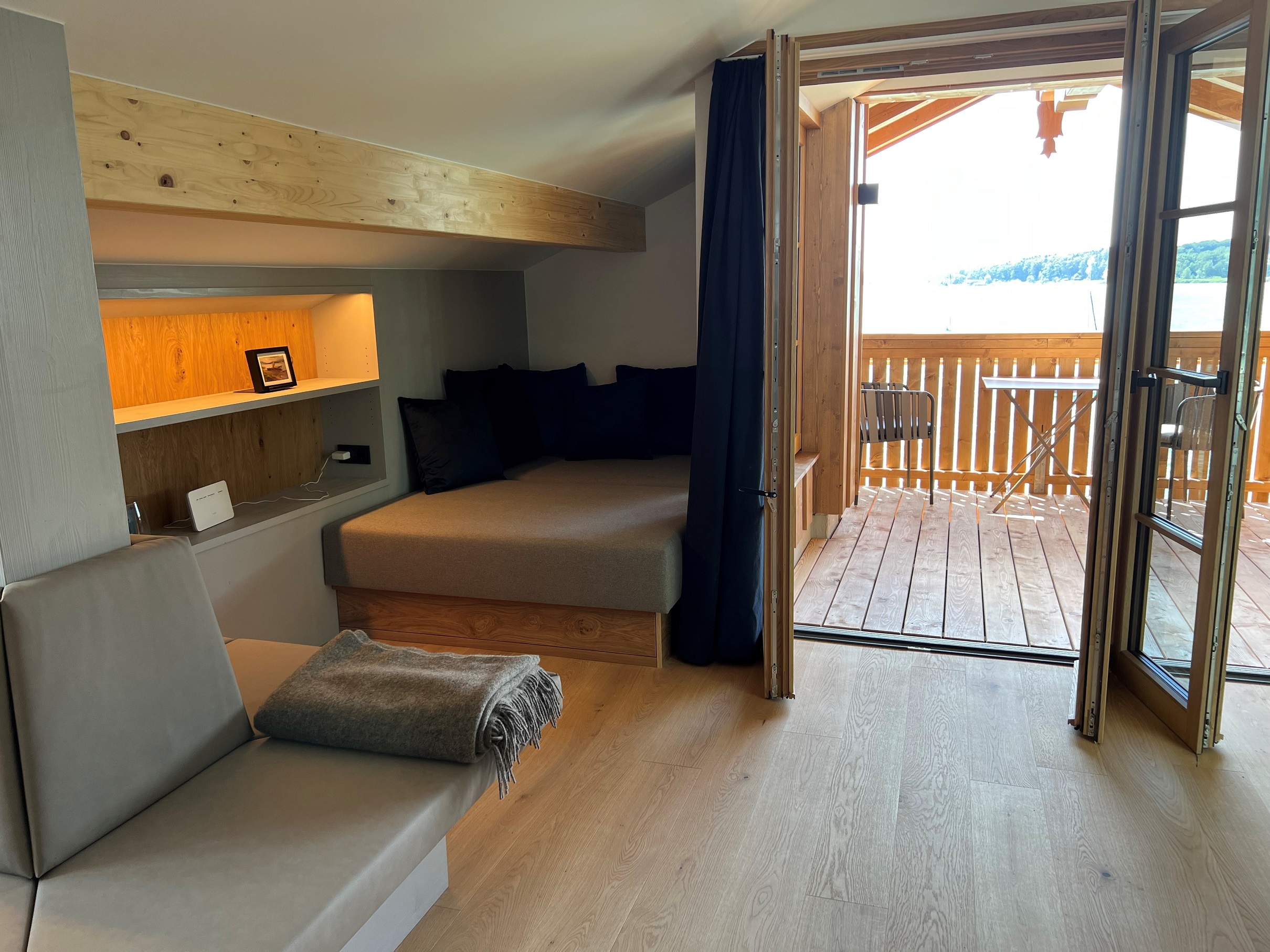 Die Nest Suite schmiegt sich wie ein Adlerhorst direkt unter das Dach des Hoixl Gütls. Von dem geborgenen und wettergeschützten Sitzplatz haben Sie einen erhabenen Ausblick über den See hinüber zur Herreninsel bis in die Berge.