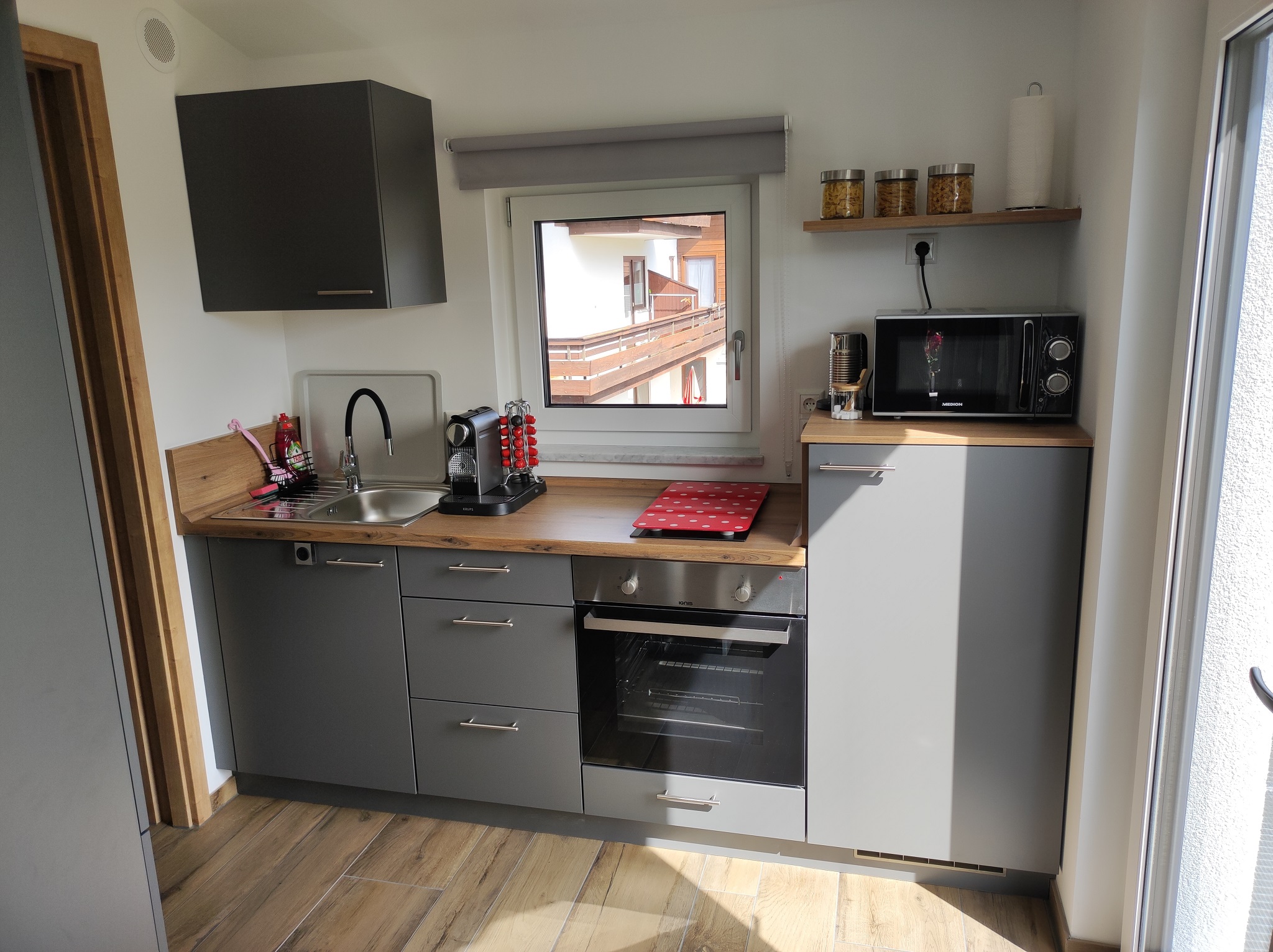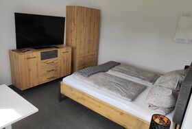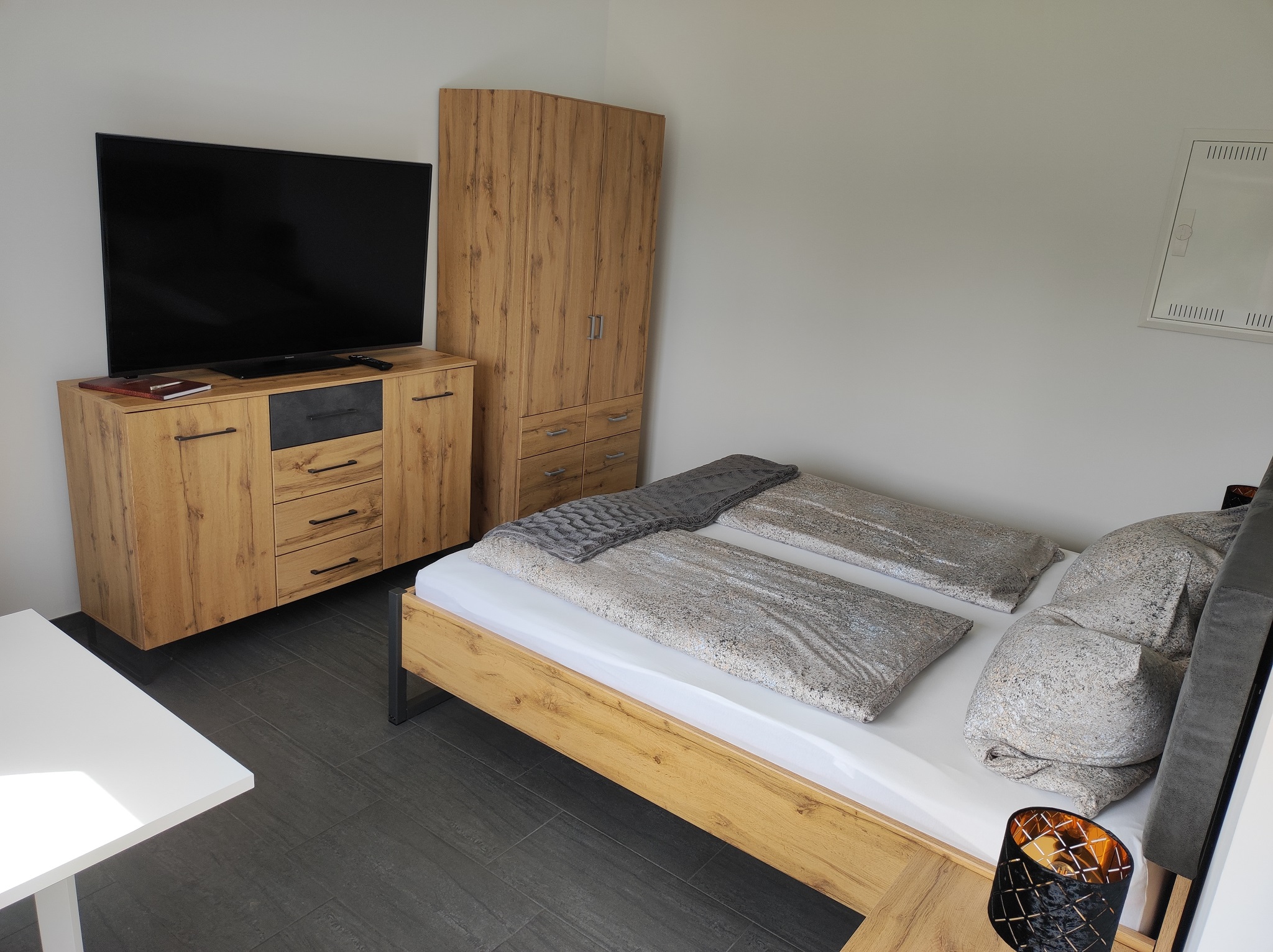 Die helle und freundliche Ferienwohnung liegt in der 1. Etage. Über die Außentreppe auf der Nordseite kommt man zur separaten Eingangstür. Ausgestattet ist das Apartment mit einem gemütlichen Doppelbett, großem Kleiderschrank und einem Flachbild Fernseher. Die kleine Küche im Eingangsbereich lässt keine Wünsche offen. Direkt angrenzend ist das modern gestaltete Badezimmer mit Fenster. Auf dem Balkon genießen Sie die Ruhe und den herrlichen Blick auf die Bergkette. In der gesamten Unterkunft können Sie das W-Lan kostenfrei nutzen.