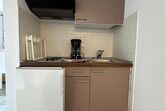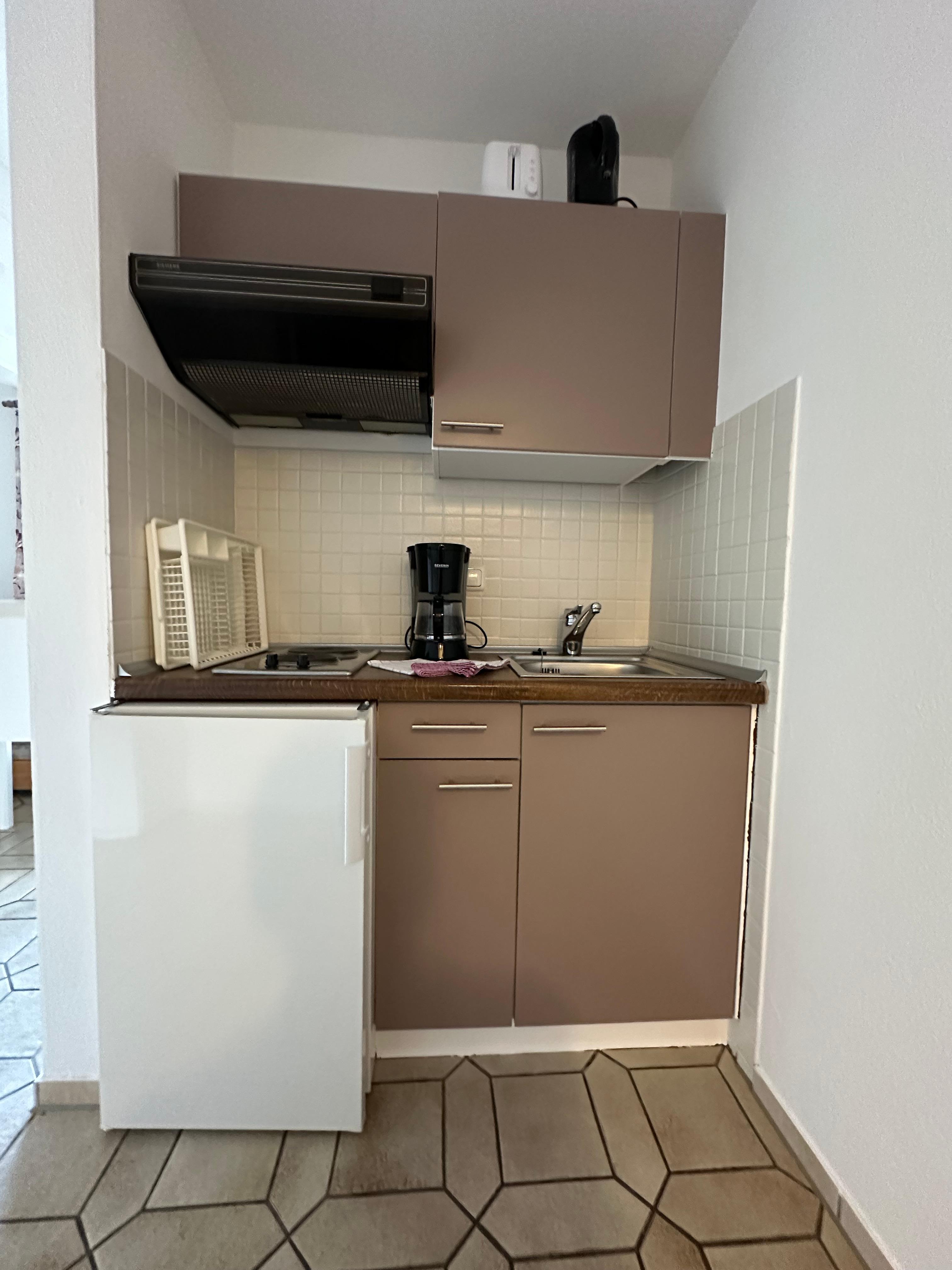Gefrier-/Kühlkombination, Kaffeemaschine und Spüle. Alle Küchenutensilien für den täglichen Bedarf
