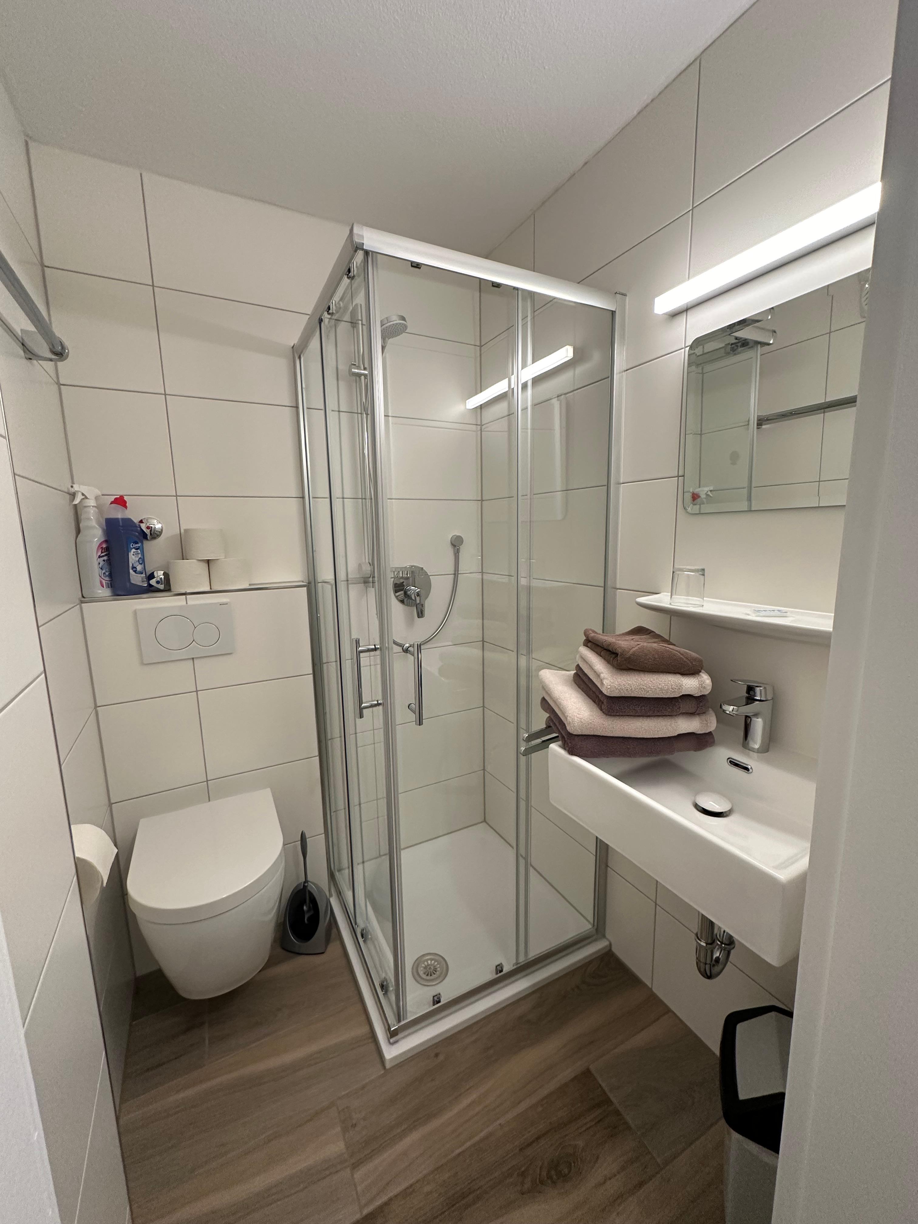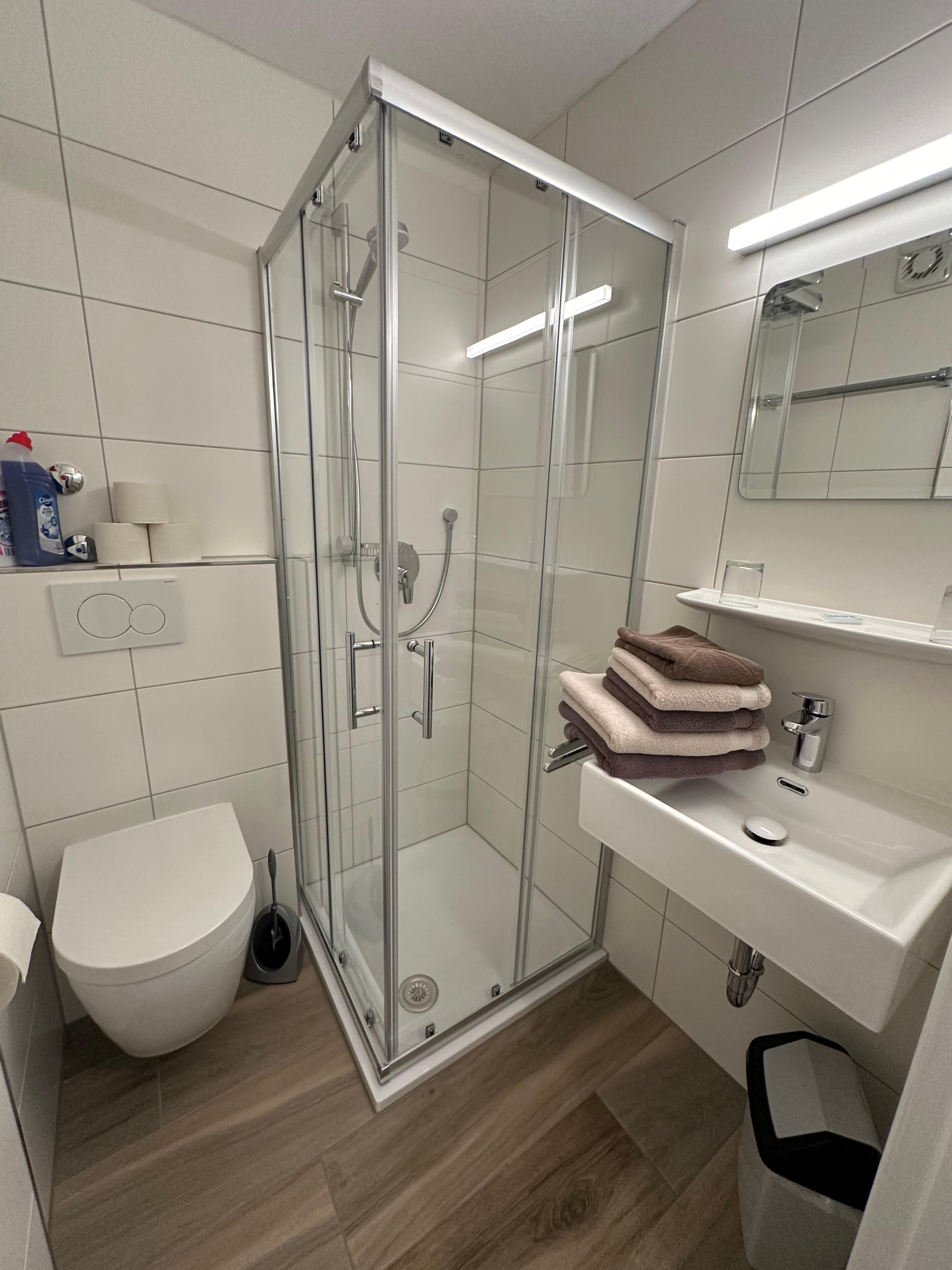 sind vorhanden. Im eigenen Bad finden Sie Dusche/WC und Waschbecken. Die Handtücher werden