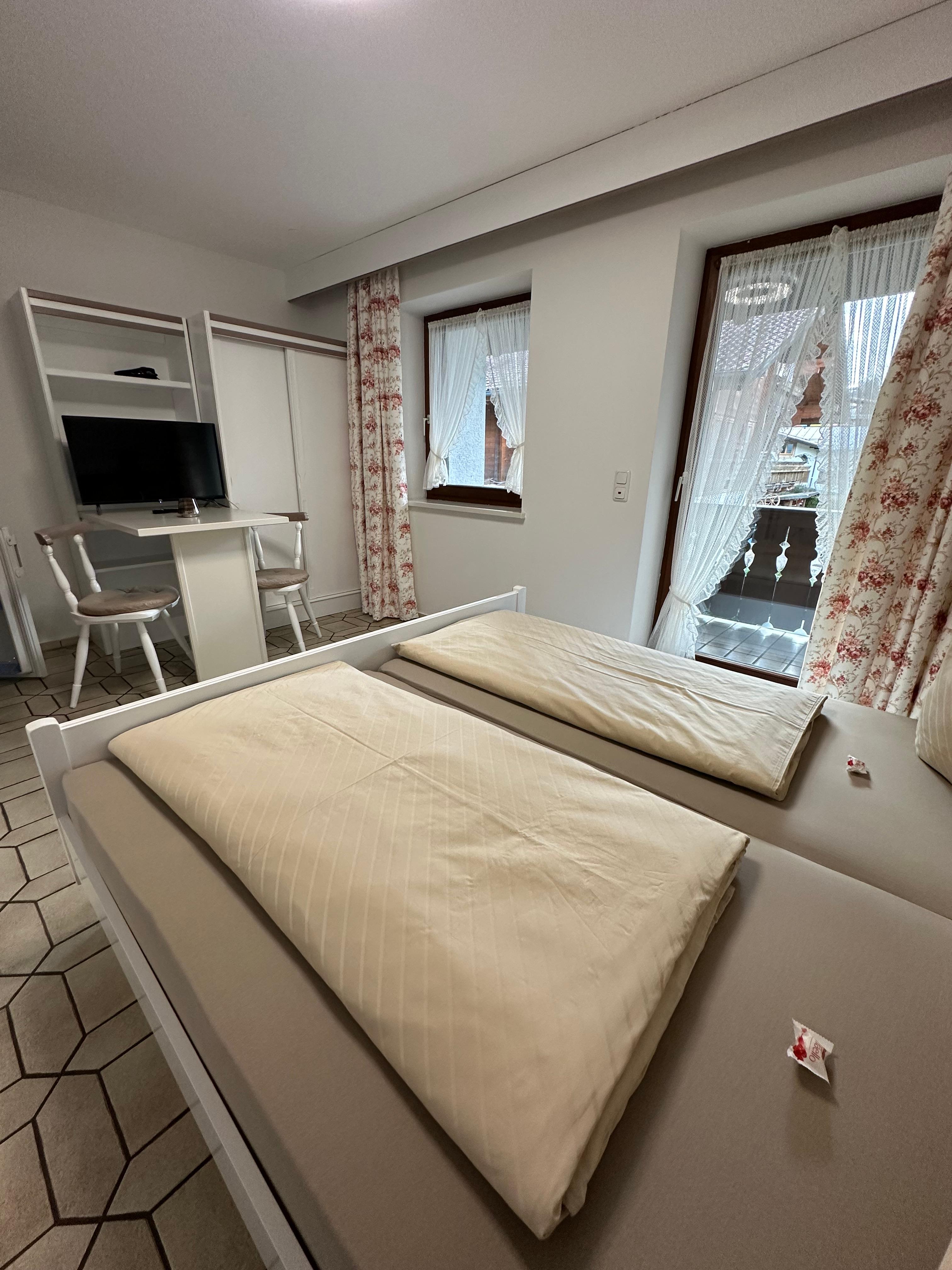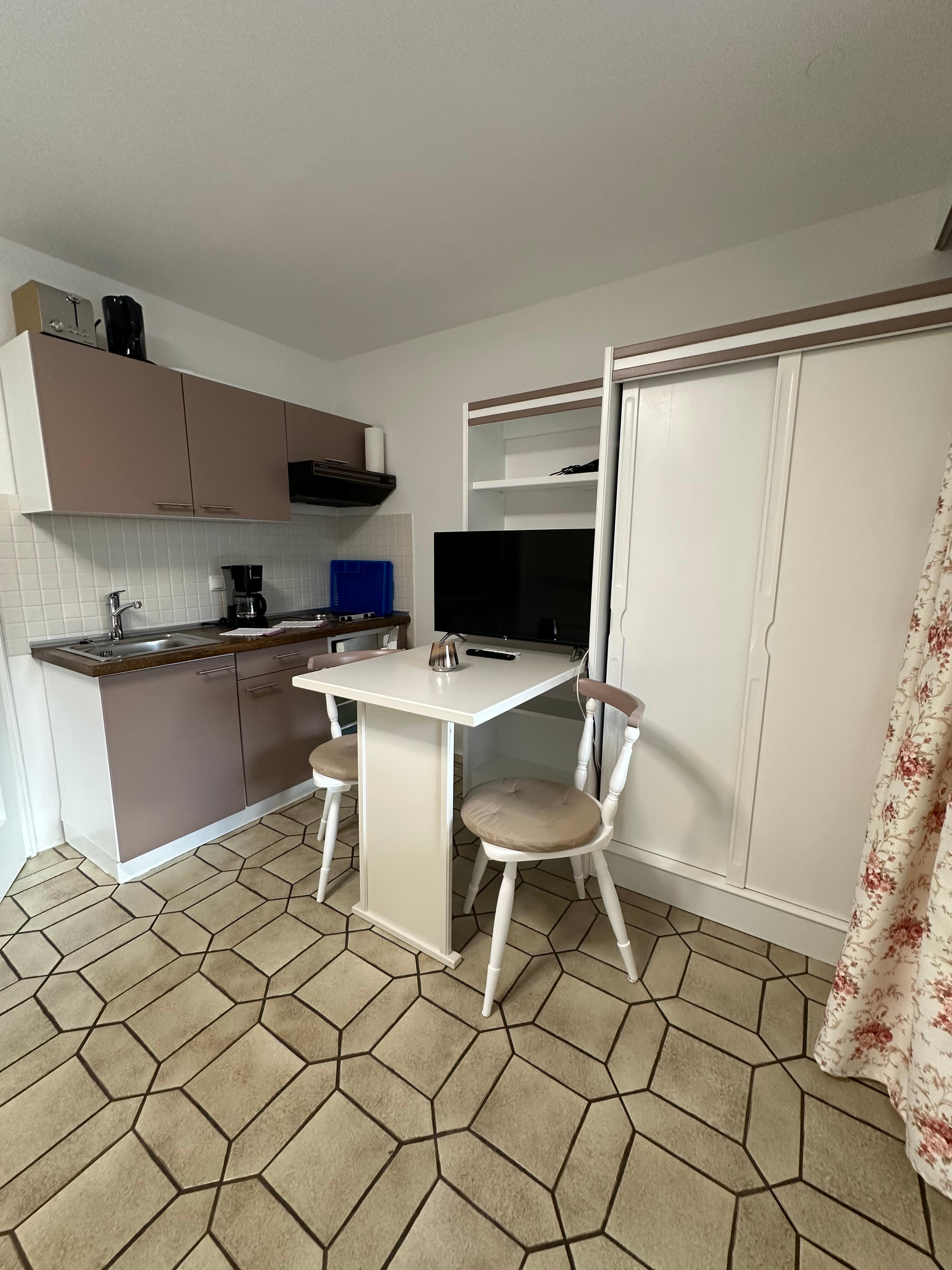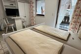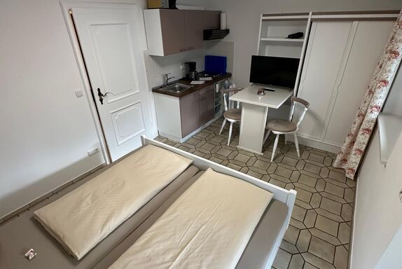 Unsere kleinste Wohnung im ersten Stock verfügt über einen Wohn-Schlafraum (All-in-One-Room) mit praktischer Küchenzeile und Kabelanschluss, Kabel-TV und WLan. Der helle Essbereich für zwei Personen ist praktisch und