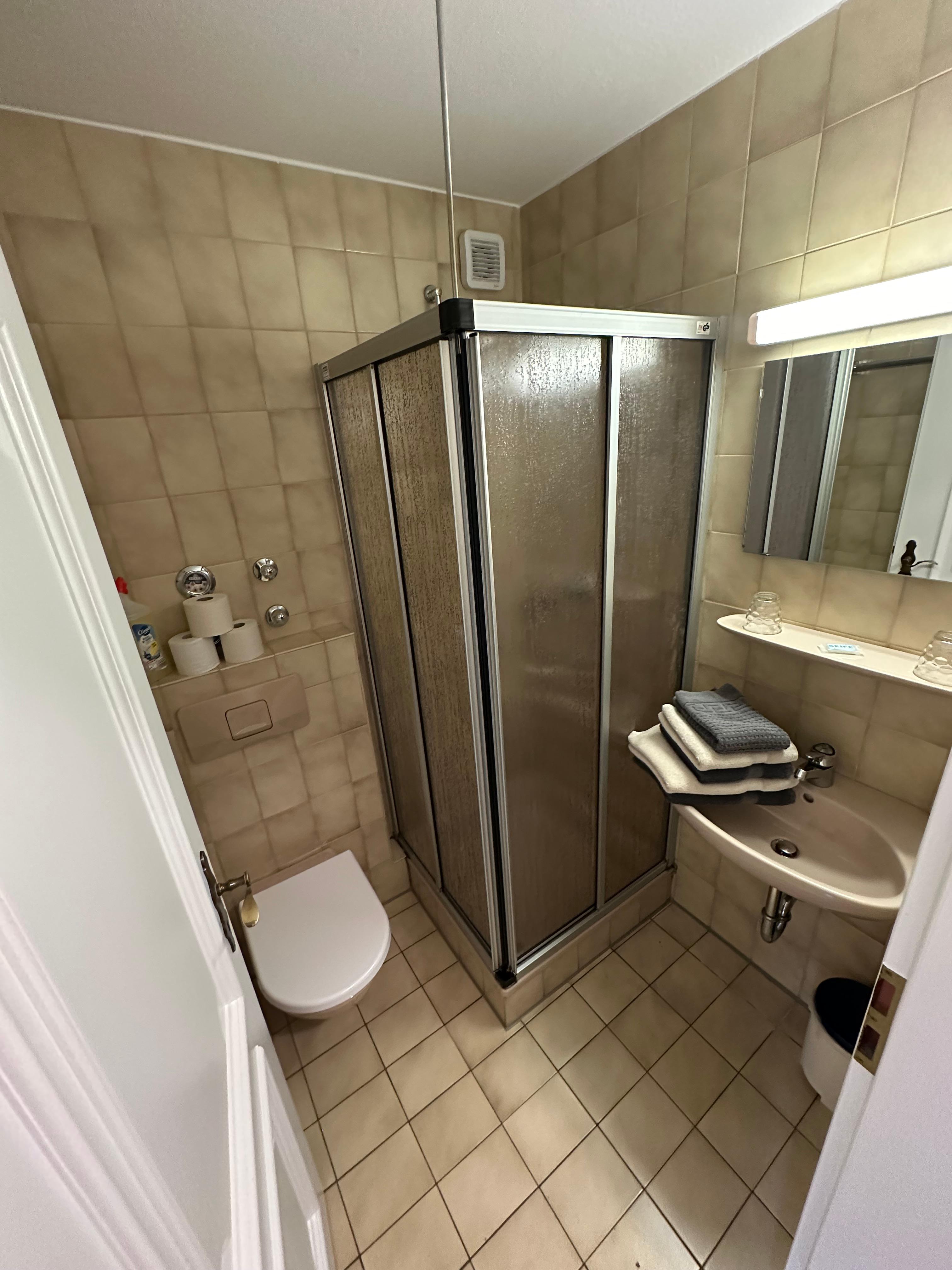 Alle Küchenutensilien für den täglichen Bedarf sind vorhanden. Im kleinen privaten Badezimmer finden Sie Dusche/WC