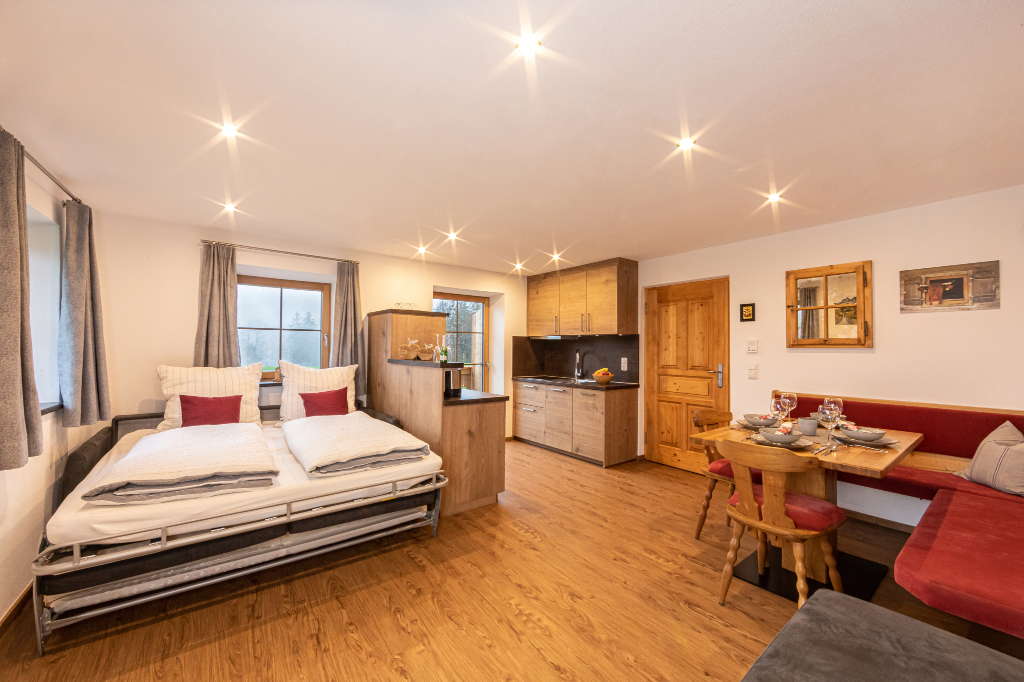 Die geschmackvoll, modern eingerichtete 40qm große Ferienwohnung für 2-4 Personen bestehend aus:einer Wohnküche mit gemütlicher Eckbank, Couch mit zusätzlicher Schlaffunktion, Flachbildfernseher, Garderobe.Küchenausstattung: Geschirrsüler, Backofen mit Mikkrowellenfunktion, Wasserkocher, Eierkocher, Filterkaffeemaschine, Herd, Toaster, Dunstabzug, Teller, Gläser, Besteck, Kochgeschirr, Geschirrtücher.einem Schlafzimmer mit Masivholz- Doppelbett, Kleiderschrank, Nachtkästcheneinem renoviertem Badezimmer mit Dusche,WC, FöhnDer Südbalkon bietet einen herrlichen Blick auf den Watzmann, Kehlstein, hoher Göll und den Jenner.Die gesamte Ferienwohnung ist modernster Fußbodenheizung ausgestattet.