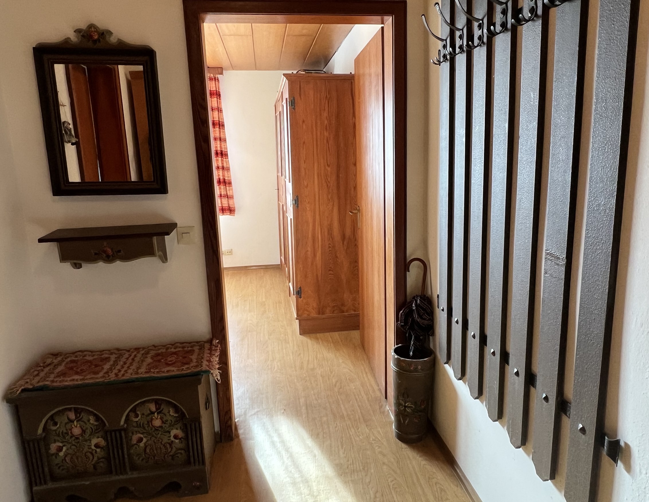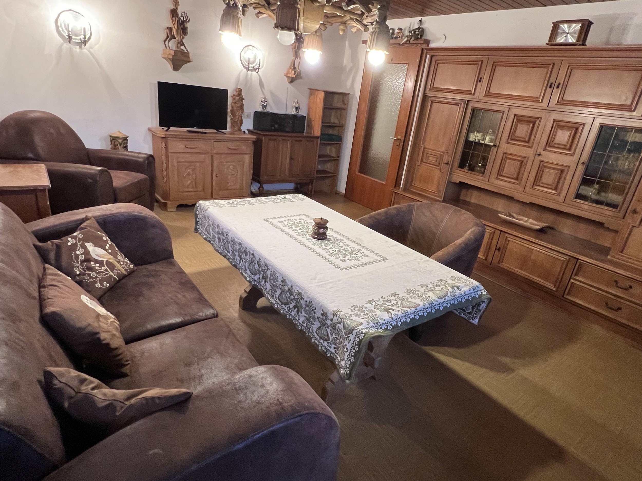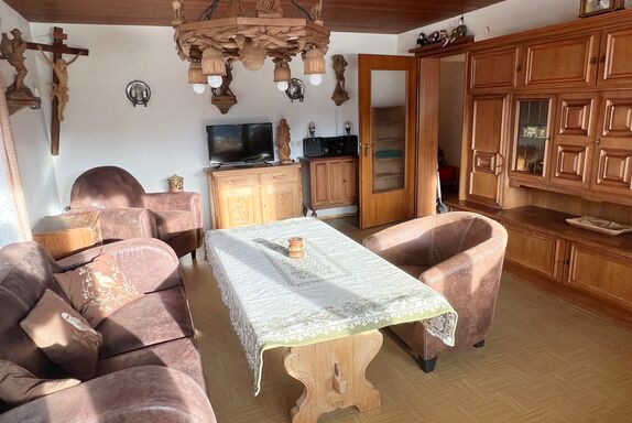 Die Ferienwohnung Sonnenseite verfügt über einen separaten Hauseingang über den Freisitz (Balkonterrasse) Sie ist mit ebenerdiger Dusche/WC, handbemalten Massivholzmöbeln im Schlafzimmer und mit Schnitzereien im Wohnzimmer ausgestattet. Eine Vollholzküche sorgt für Gemütlichkeit. Die Küche hat Kühlschrank, Backofen, Cerankochfeld, Kaffeevollautomat, Kaffeemaschine, Mikrowelle, Toaster,  Wasserkocher und ist gut ausgestattet. Das Schlafzimmer verfügt über drei Schränke, Kommode und separates Waschbecken. ebenerdig. Eine eigene Garderobe sorgt für Ordnung. Deutsches Sat-TV, WLAN-Internet, Terrasse Auf dem Freisitz blicken Sie über das Reit im Winkler Tal. Eine Hundebetreuung für meine Hausgäste zum Sonderpreis ab 55,00 Euro / Tag.