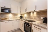 • Küche mit E-Herd, Geschirrspüler, Kühlschrank, Kaffeemaschine, Mikrowelle, Toaster und Wasserkocher