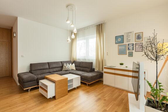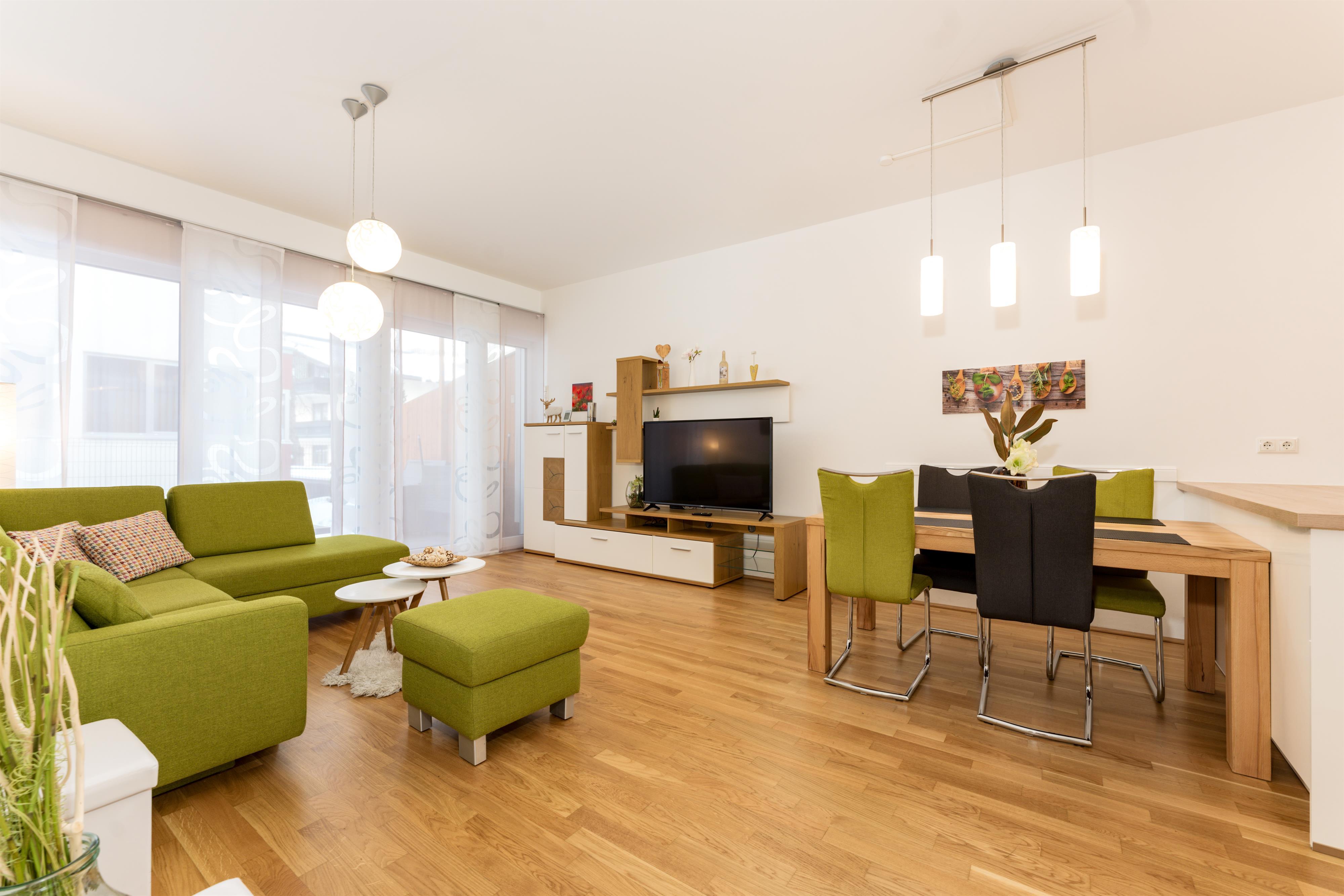 Top 2: 60 m² App. im Erdgeschoss für 2-4 Personen, voll ausgestattete Wohnküche mit Esstisch, Schlafsofa für 2 Personen und TV, 40 m² Terrasse mit Lounge- und Gartenmöbel, ein separates Schlafzimmer mit Doppelbett und TV, ein Badezimmer mit Dusche, eine separate Toilette, 1x Tiefgaragenparkplatz.