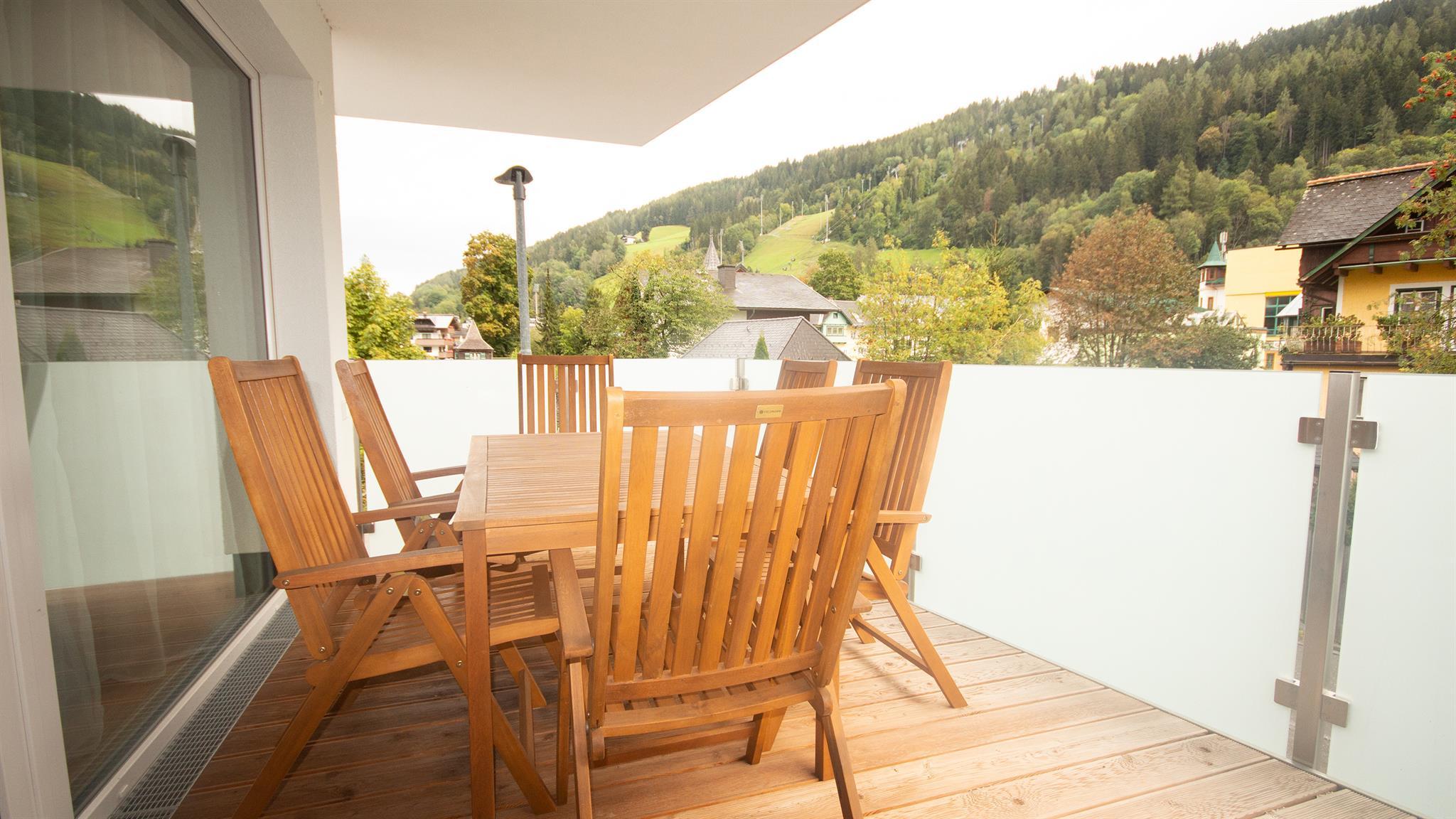Top 4: 87m² App. im 1. Obergeschoss für 4-6 Personen, großzügiger Wohnraum mit komplett und hochwertig ausgestatteter Küche, Esstisch, Schlafsofa für 2 Personen und TV, 10m² Balkon mit Balkonmöbel und tollem Ausblick auf den Planai Zielhang, zwei separate Schlafzimmer mit Doppelbett, ein en-suite Badezimmer mit Badewanne, Waschtisch sowie ein separates Badezimmer mit Regendusche und Waschtisch, eine separate Toilette ist vorhanden. Skibox mit Skischuhheizung und 1 Tiefgaragenparkplatz.
