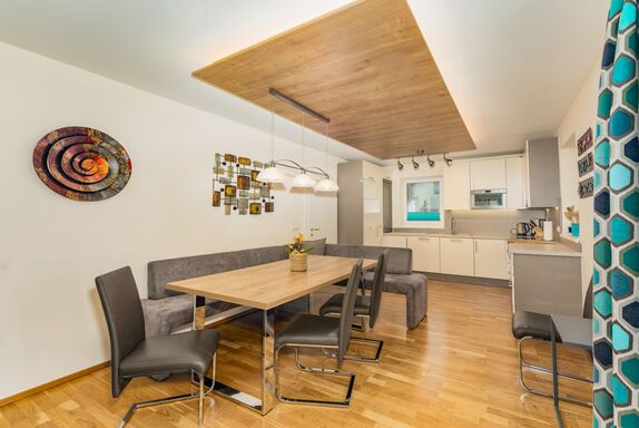 Sie wünschen eine zentrale Lage (5 Gehminuten in das Zentrum), möchten aber dennoch Ihren Sommer- oder Winterurlaub mit viel Ruhe und Sonne verbinden, dann ist das Appartement Alpenglocke genau das richtige Feriendomizil für Sie. Die Innenausstattung überzeugt mit viel Moderne, Tradition und Komfort und vermittelt folglich Wohlfühlfaktor pur. Auf 2 Etagen - 115m² Wohnfläche bietet das Appartement alles was das Herz begehrt. Eine großzügige Wohnküche, 4 SEPARATE Schlafzimmer, 2 Badezimmer sowie einen großen Balkon mit traumhaftem Ausblick auf die Berge. In Richtung Süden befindet sich eine großzügige Sonnenterrasse mit Gartengarnitur und einem Garten, der Sonnenschein den ganzen Tag garantiert. Auf der Rückseite des Hauses erwarten Sie eine weitere Sonnenterrasse und ein Garten mit Grill, Tisch und Stühlen für die Nachmittags- oder Abendsonne im Sommer.