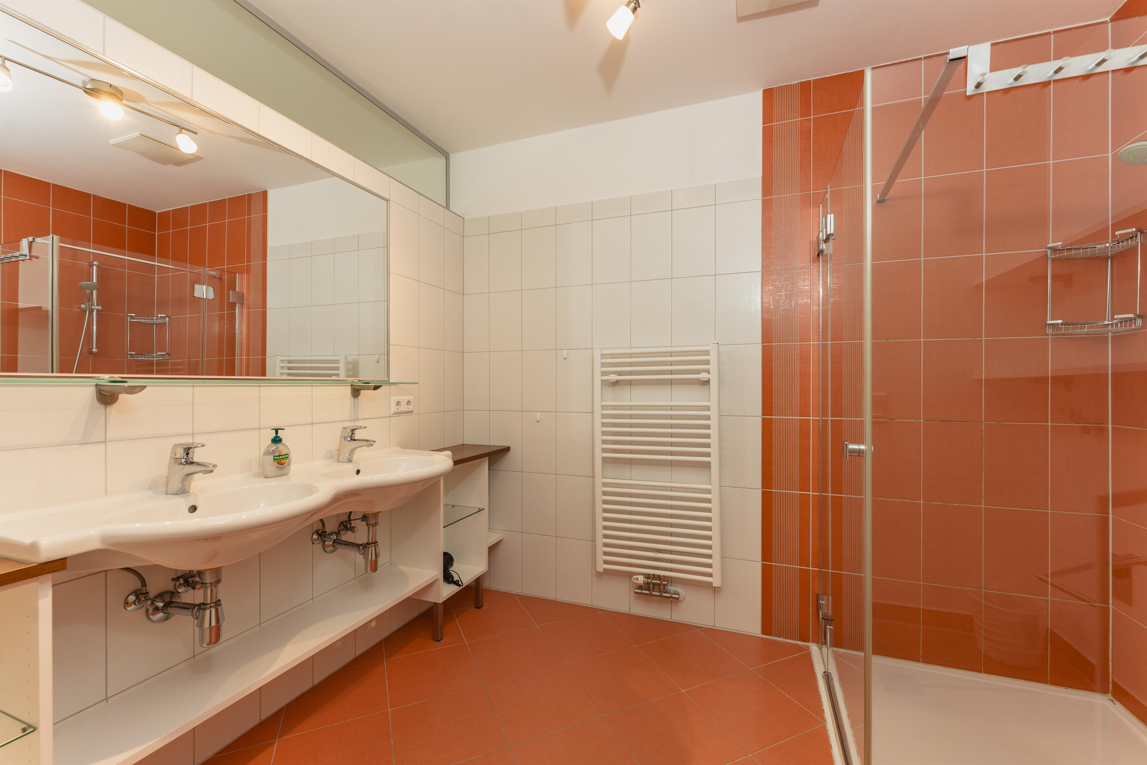 - 1 Badezimmer mit Dusche, Doppelwaschbecken & einem separaten WC im Vorraum