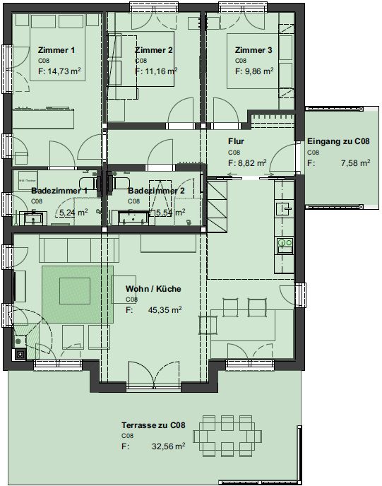 • Großzügige Terrassen, Balkone oder Privatgärten ausgestattet mit Outdoormöbel und Grill