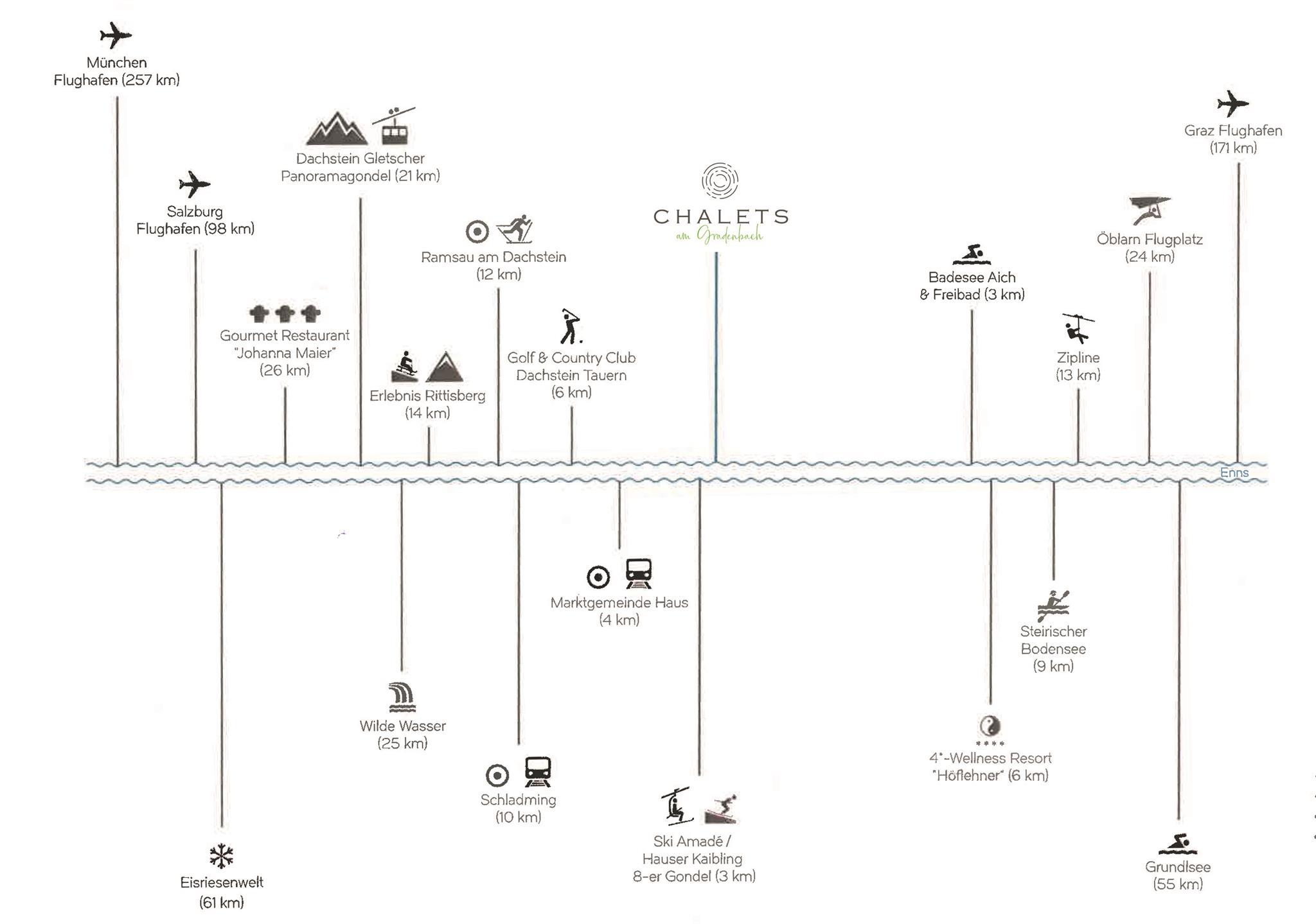 Die exklusive Lage der Naturchalets am Gradenbach in Weissenbach bei Haus– umgeben von Wald, Wiesen & Wasser, eingebettet zwischen dem imposanten Dachstein Massif und den Schladminger Tauern mit Blick auf den Hauser Kaibling, ist wie geschaffen für eine Auszeit wie es Ihnen gefällt. Nahtlos in die alpine Naturlandschaft integriert und garantieren eine Auszeit in absoluter Freiheit. Für die einen ist es ein Naturerlebnispark in all seinen Facetten, für die anderen ein Ort, der so viel in kurzer Entfernung zu jeder Jahreszeit bietet und eine Vielfalt an Freizeitangeboten mit Erlebnisfaktor.