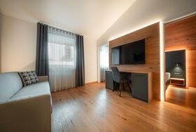 Hightlight: Eingebaute Waschmaschine mit Trocknerfunktion direkt im Appartement, 55 4K UHD LED TV, eigene Matratze bei Liegesofa - mit nur einem Handgriff verwandelt sich das Sofa in eine große Liegefläche mit eigener Matratze