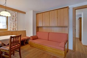 Komfortabel eingerichtetes Familienzimmer. Wohnraum und Schlafraum getrennt, die Couch im Wohnraum kann zu einem Stockbett umfunktioniert werden. Holzböden, Massivholzmöbel, Sitzecke, Du/WC, Waschtisch, Sat-TV wahlweise im Schlaf- oder Wohnraum