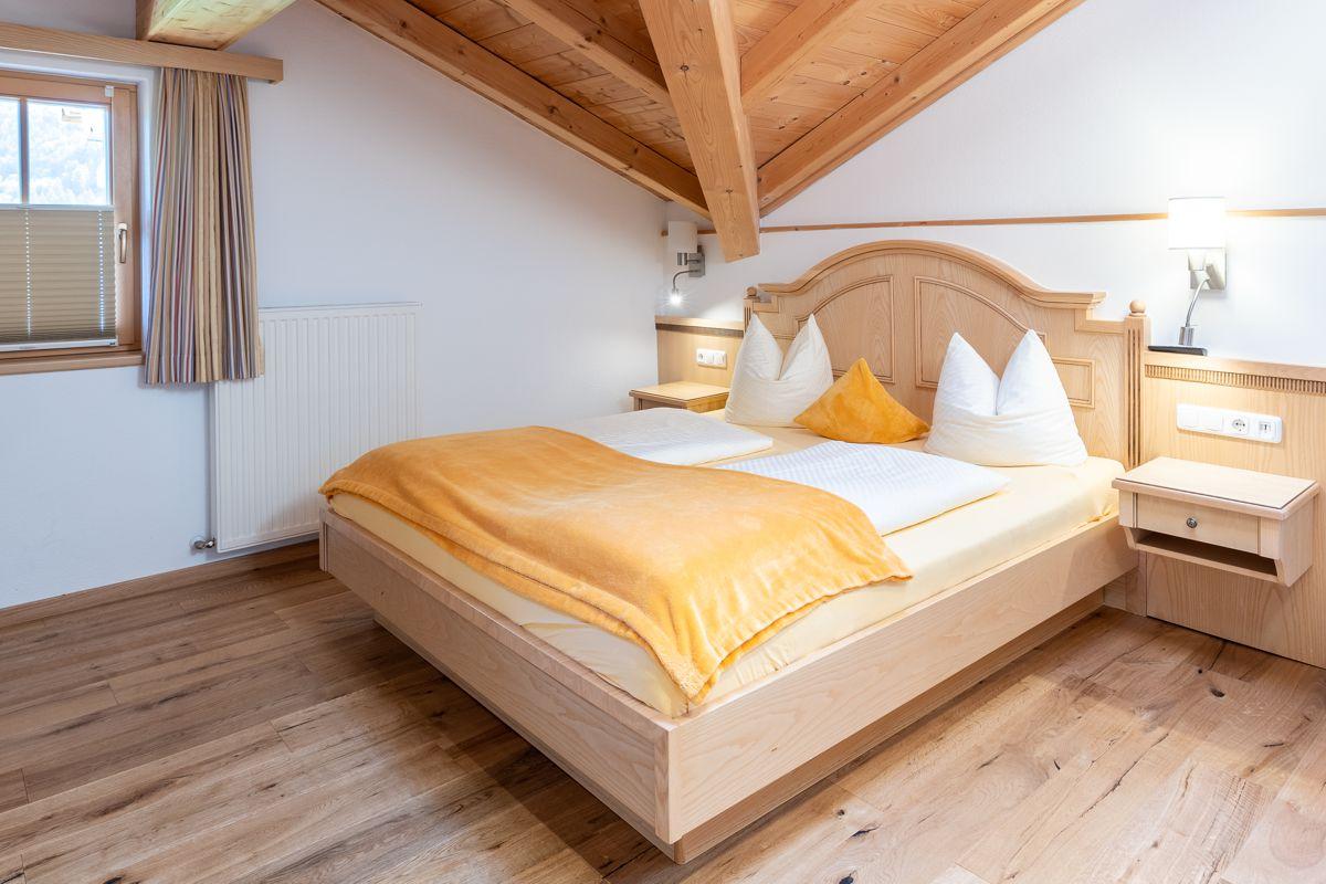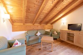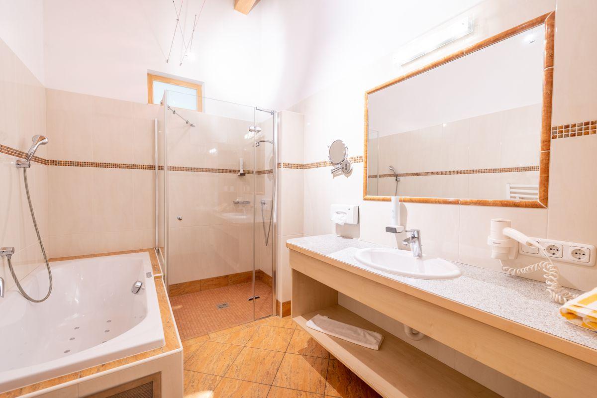 Bauernhofurlaub deluxe in einer unserer Familiensuiten: Wohnraum, Schlafraum und zusätzlich ein getrennter Kinderschlafraum bieten Platz für eine bis zu 6 köpfige Familie. Zusätzliche Extras in dieser Einheit sind eine Sitzecke mit Kachelofen und eine Whirlbadewanne.