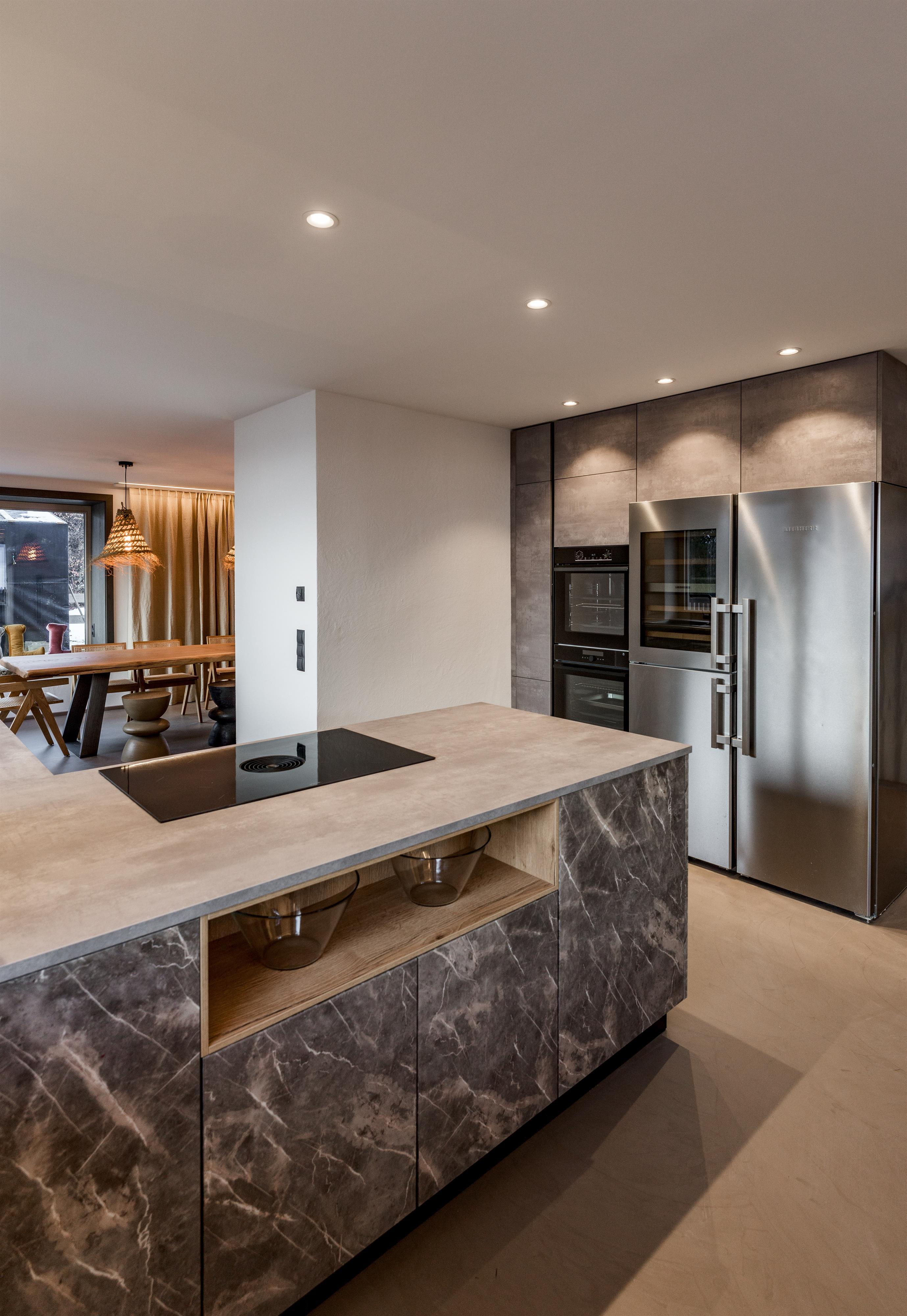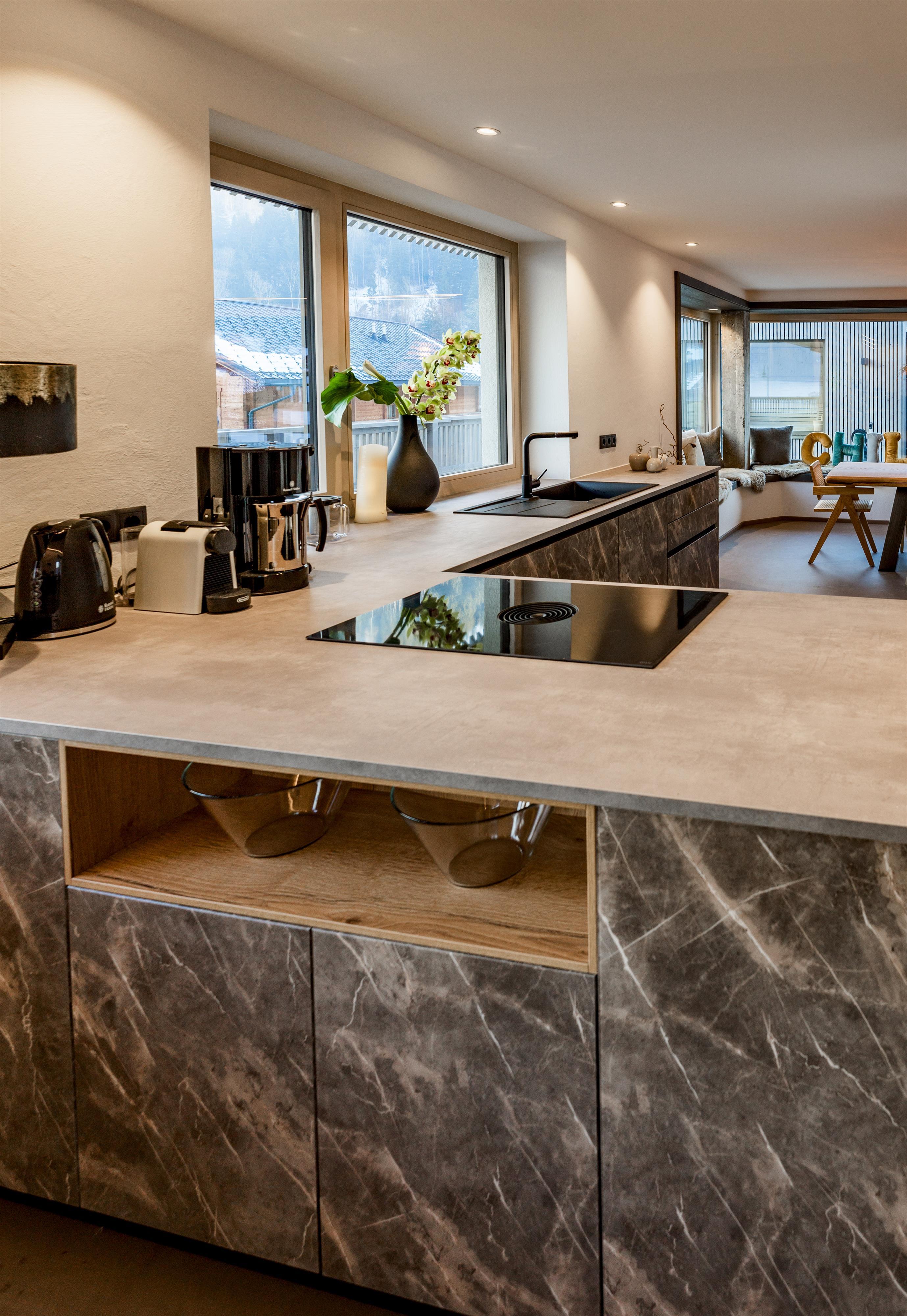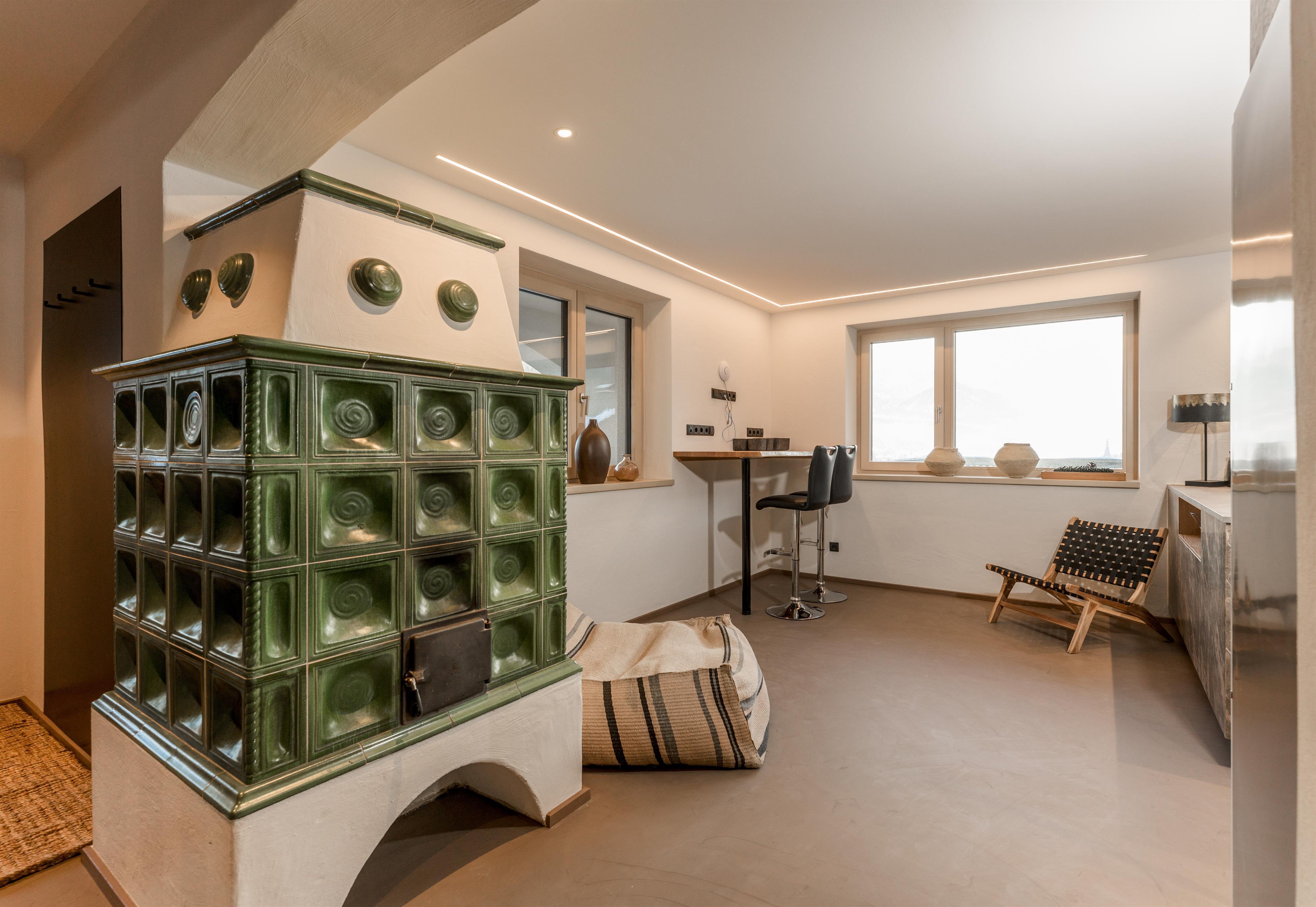 • Eat & Meet & Chill Area mit komplett ausgestatteter Küche, großer Esstisch, XXL Couch, Kachelofen, Medientisch und Smart TV