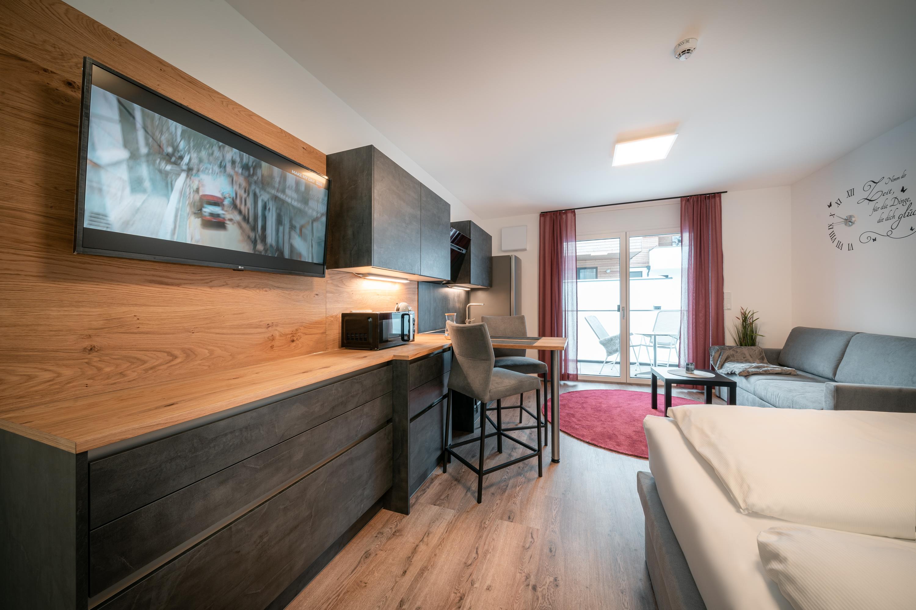 11 Appartements – von Garden, Studio, Comfort, Superior und Penthouse – jedes mit Balkon oder Terrasse, jedes ruhig, ein bis zwei Schlafzimmer, komplett ausgestattete Küchen, Tiefgarage, Skiraum, Radraum, W-Lan… das ist der Conrad – Komfort!