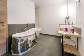 Doppelzimmer 20 qm, Boxspringbett, offenes Bad mit Dusche, Balkon oder freistehende Badwanne, WLAN, Kabel TV, täglich Spa -, Indoor Pool Nutzung, Frühstücksbuffet, im Winter Skiraum, im Sommer Almsee und Gartenanlage inklusive.