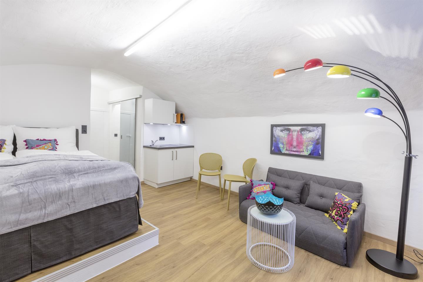 Der GREEN ROOM ist ein exklusives Studio mit einzigartigem Flair. Auf ca. 30m² genießt man den freien Blick auf die Festung oder eine angenehme Dusche direkt vor dem Stein des Kapuzinerbergs. Das Studio verfügt über ein 9m² großes Badezimmer mit beheizter Dusche, WC und einem Waschtisch. Das Wohn-Schlafzimmer umfasst ein Boxspring – Doppelbett, einen Tisch mit 2 Stühlen, sowie einen Lesesessel mit Stehlampe. Die kompakte Küche ist mit Mikrowelle, Kühlschrank, Ceran- Kochfeld und Cremesso Kaffeemaschine voll ausgestattet.
