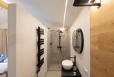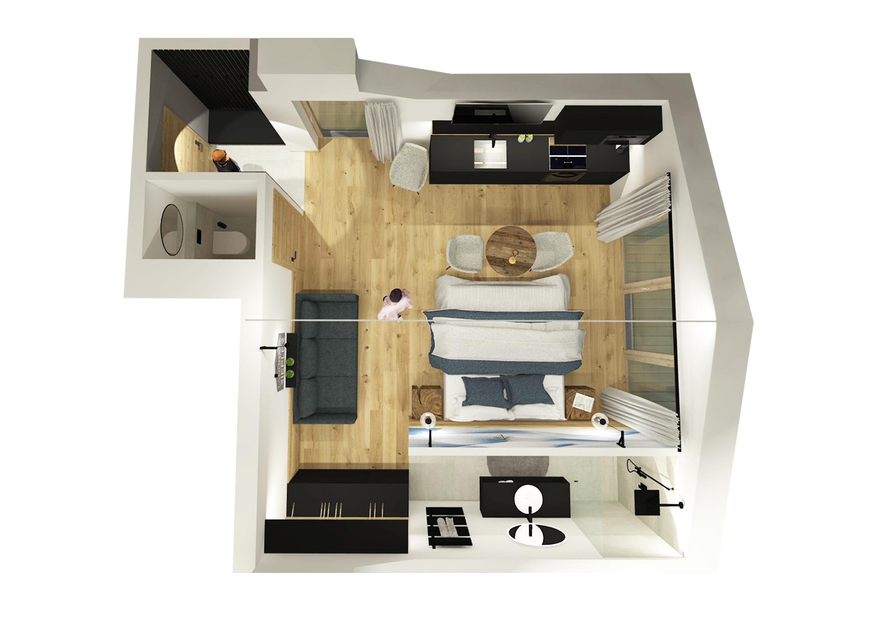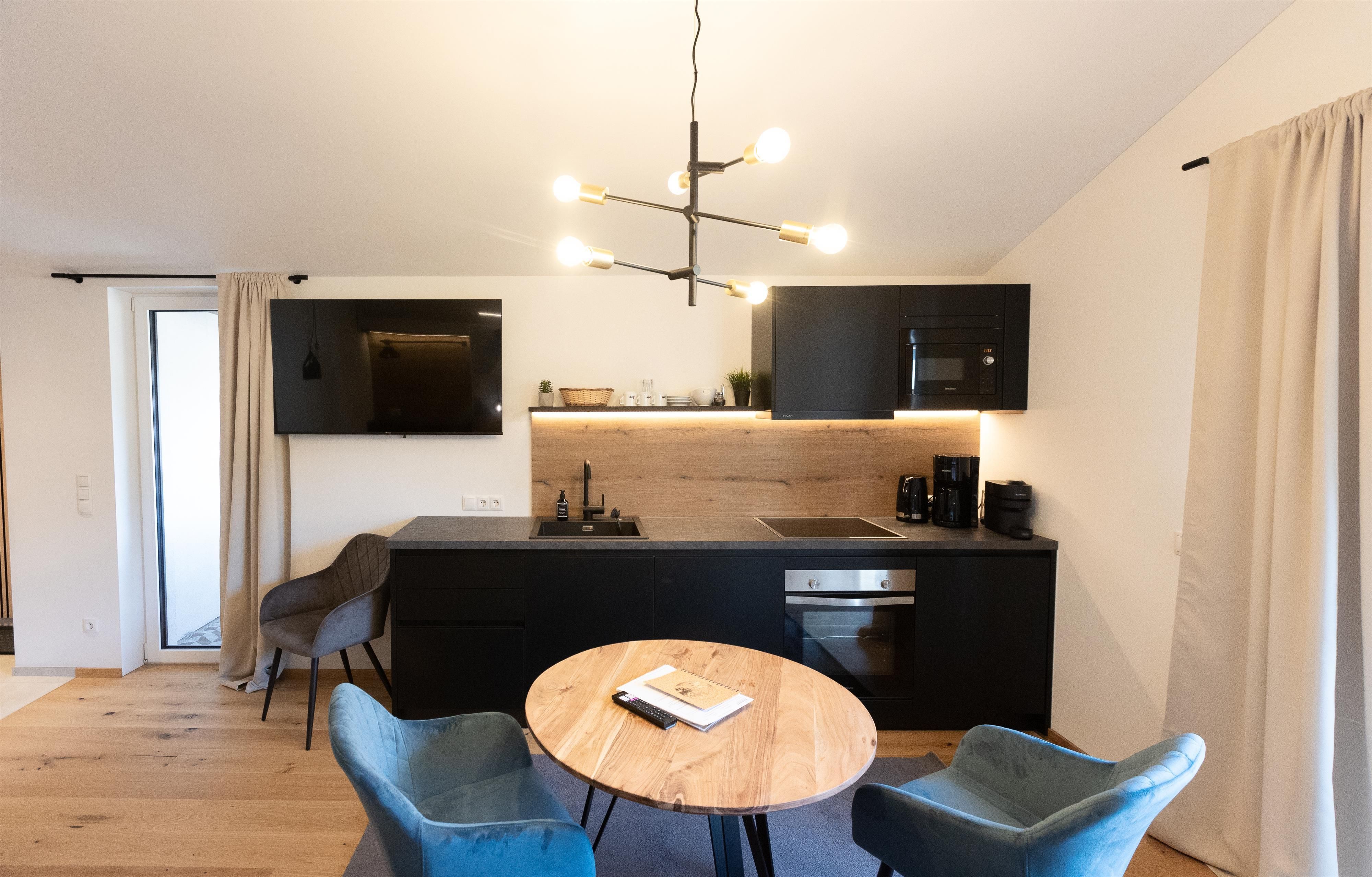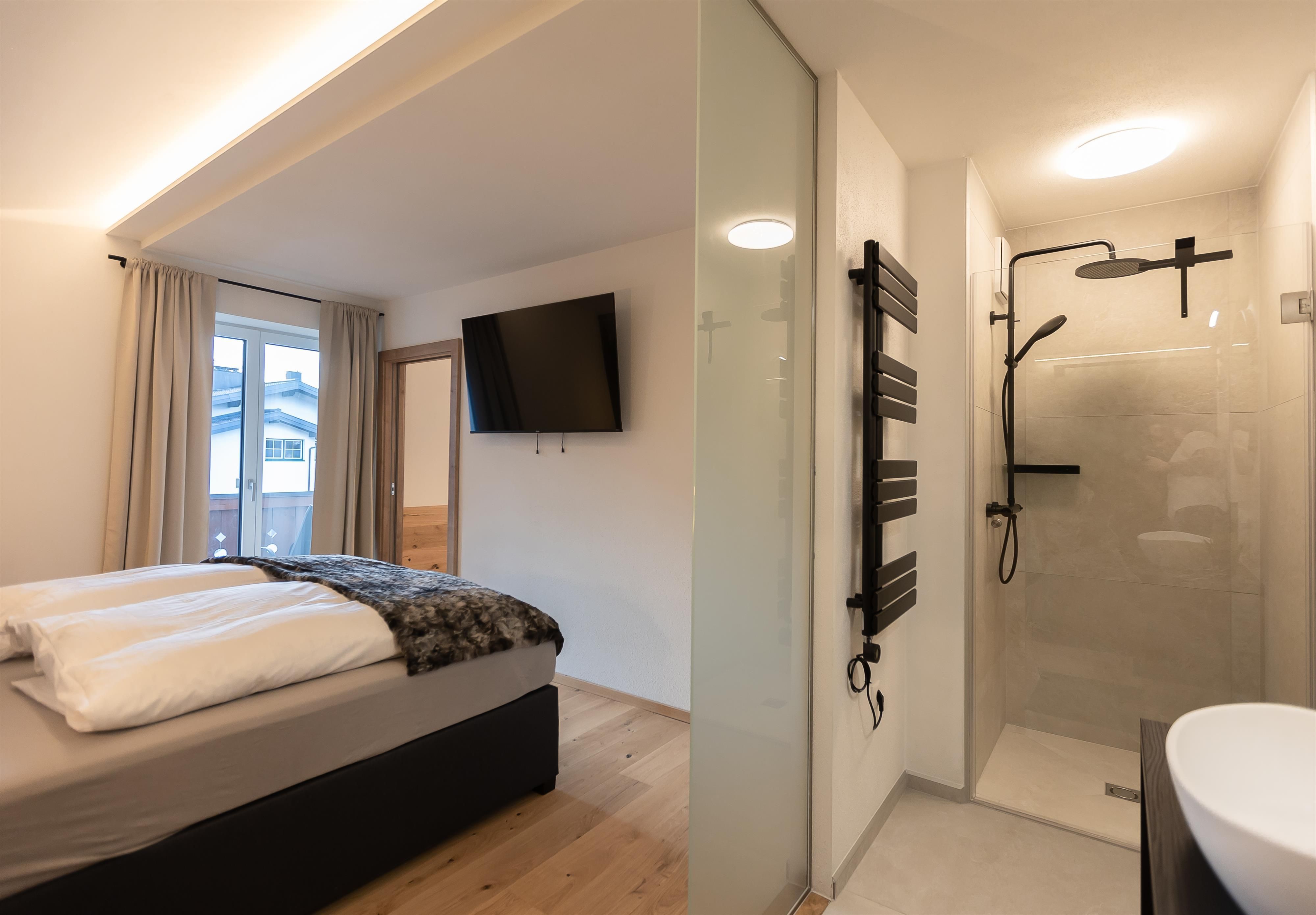 Unser Deluxe Apartment Snowy für 2-3 Personen verfügt über ein komfortables Boxspringbett, offens Badezimmer mit Regendusche, moderne eingerichtete Küchenzeile, Essbereich, Schlafcouch, Balkon, großer Smart TV, WIFI, seperates WC.