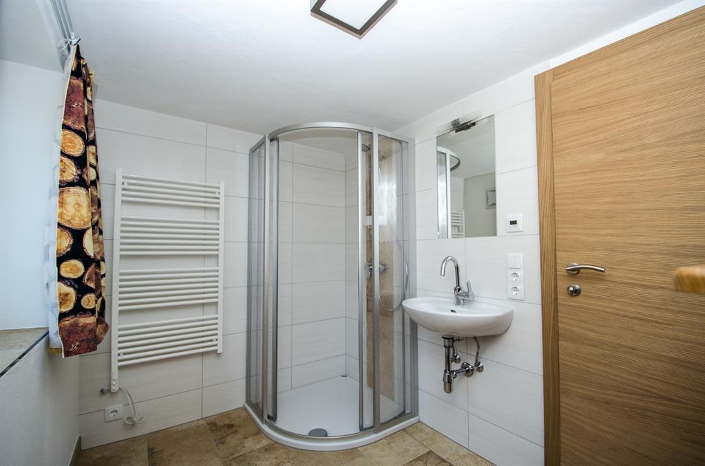 * Badezimmer mit Dusche, Waschbecken und Handtuchtrockner