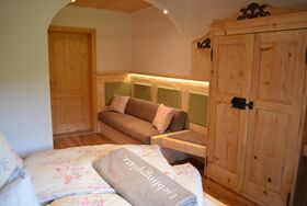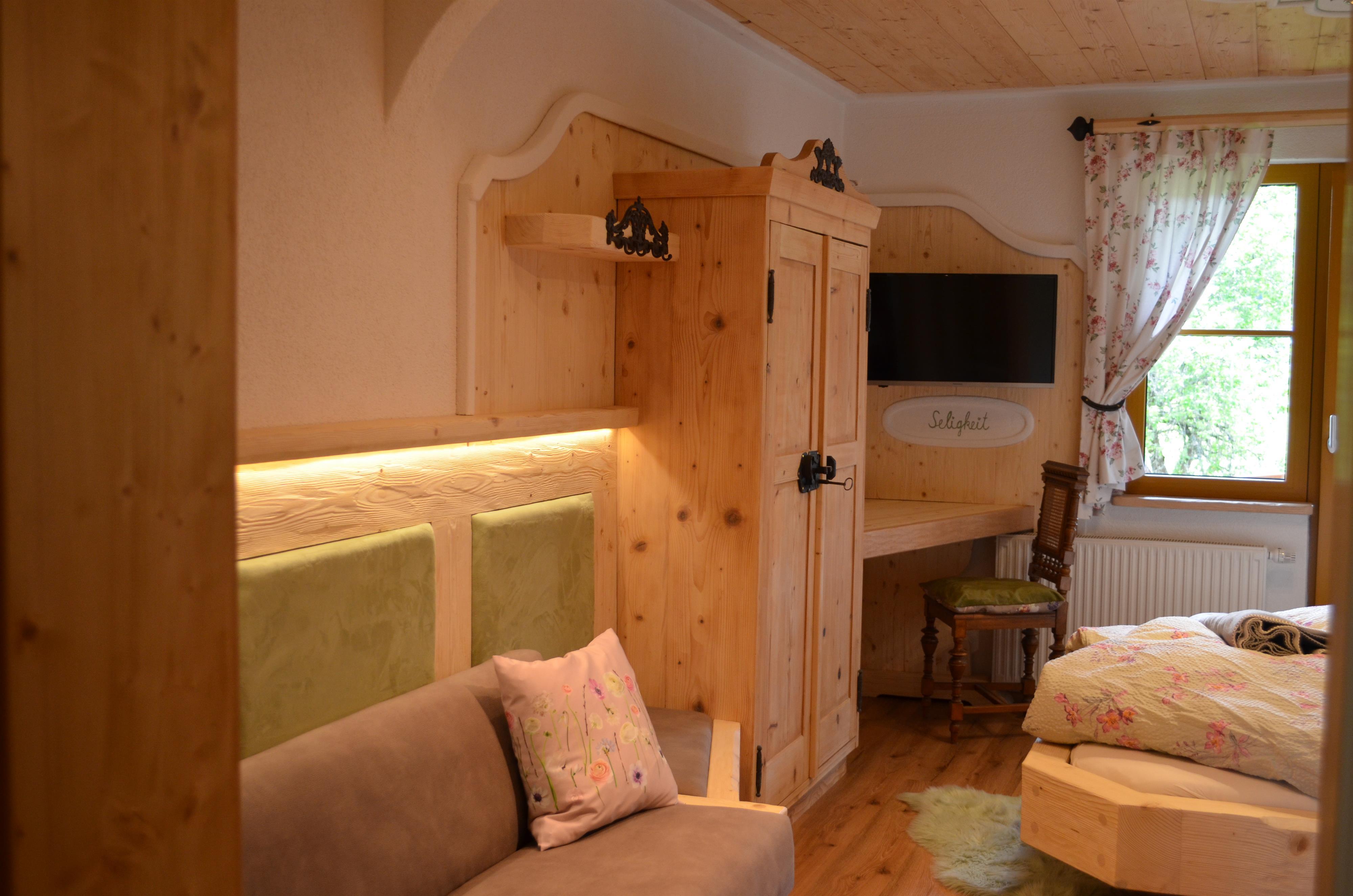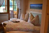 Gemütliches Vollholz-Zimmer, liebevoll eingerichtet mit Holz- und Glaselementen. Kleiner Balkon mit Garten- und Bergblick. Doppelbett, Bad, WLAN und TV. Neu renoviert – ideal für entspannte Tage in Faistenau.