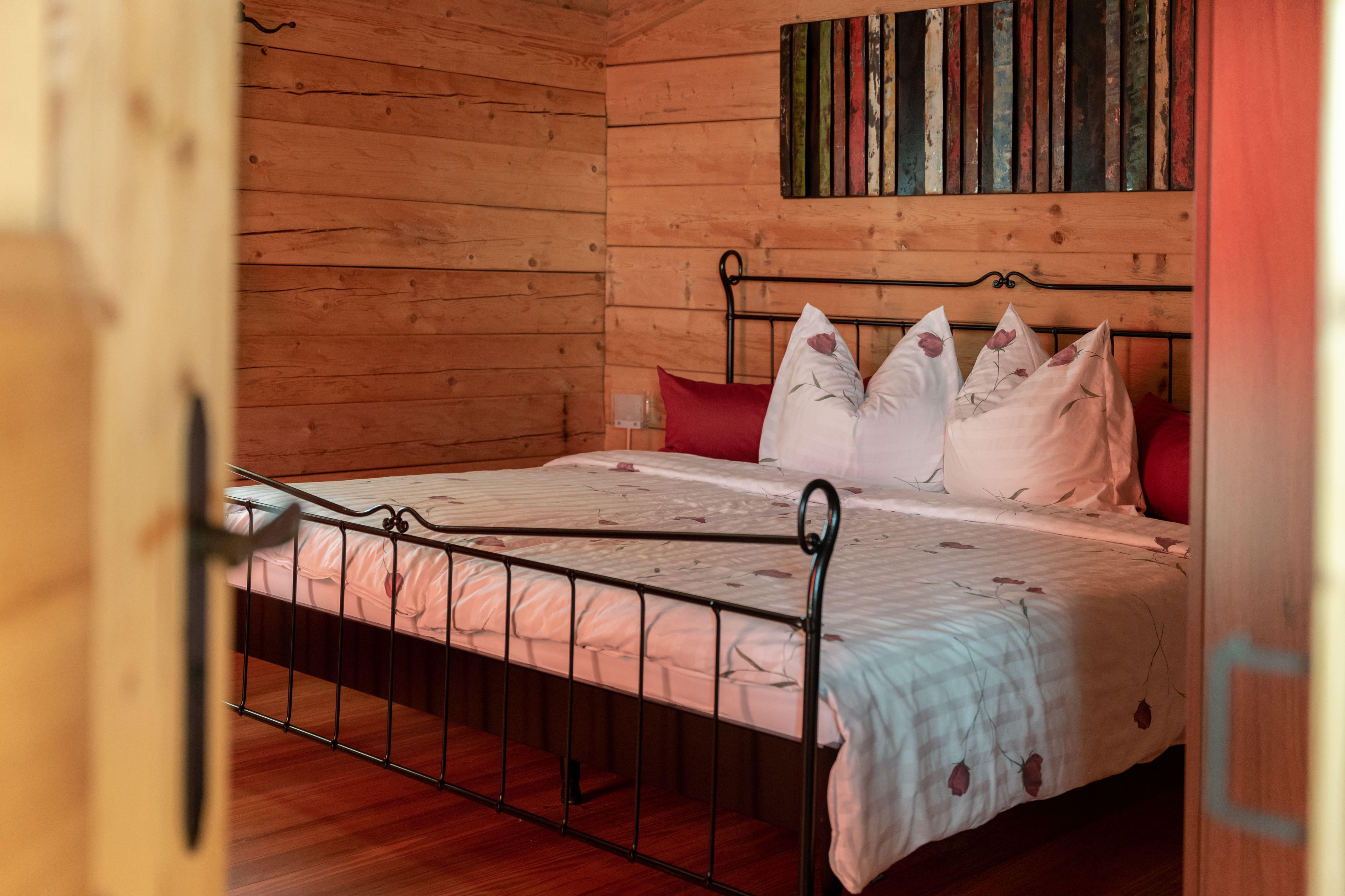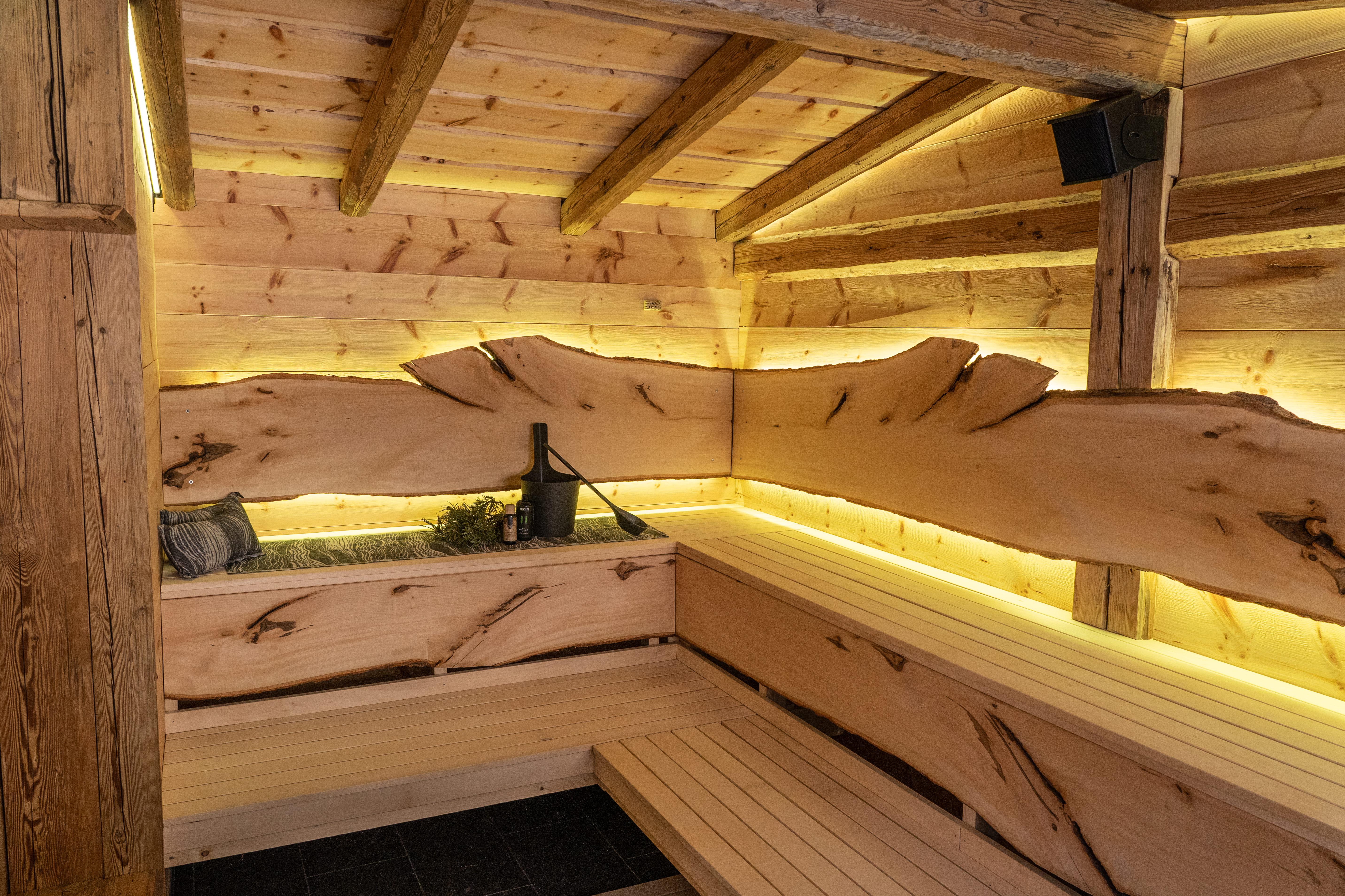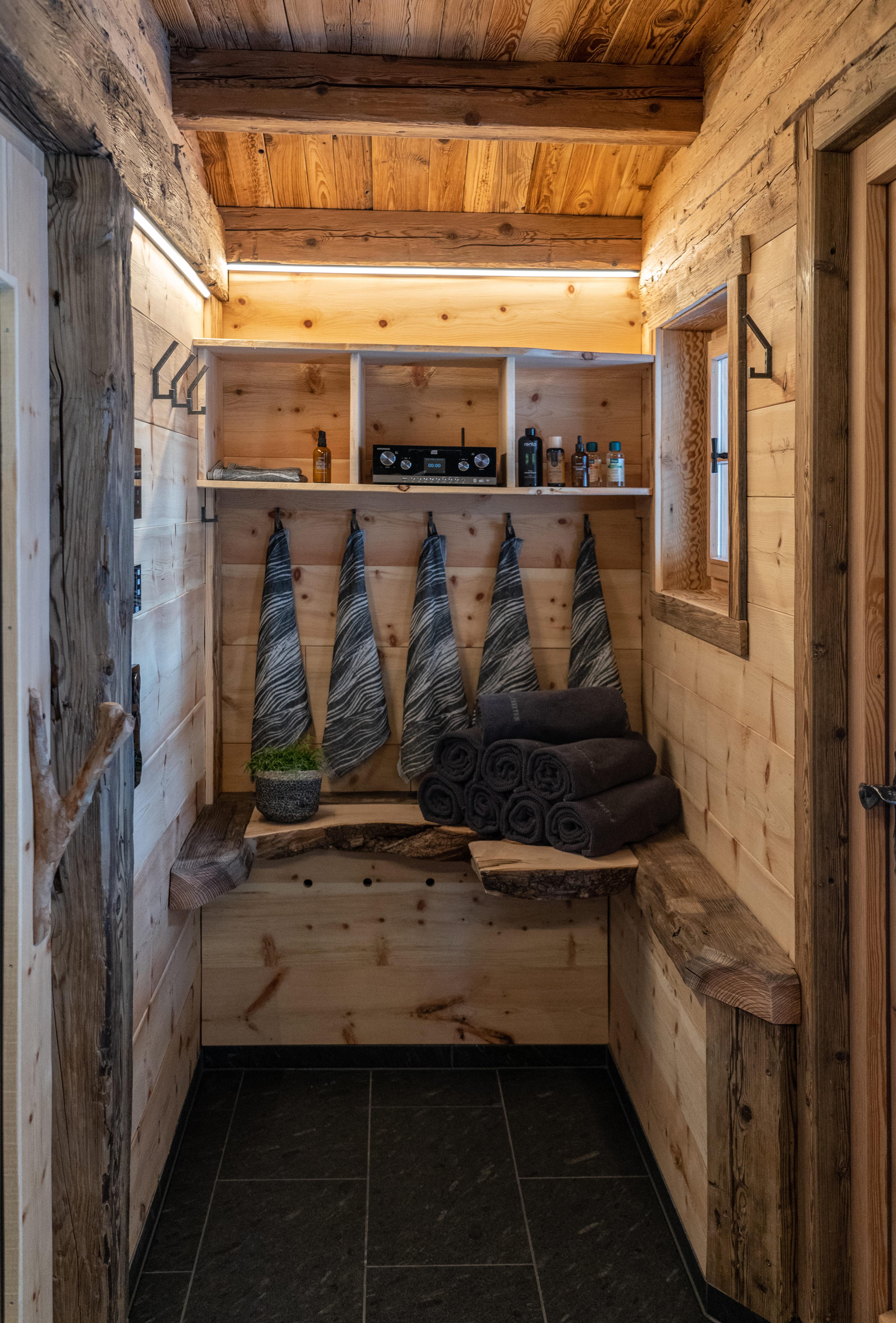 Zusätzlich ein Zirbenholz-Saunahaus für 8 Personen an. Wir haben es im gleichen Stil wie unser Haus erbaut.
