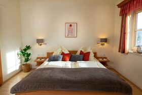 1 großes, helles Schlafzimmer mit Doppelbett und Ausziehcouch