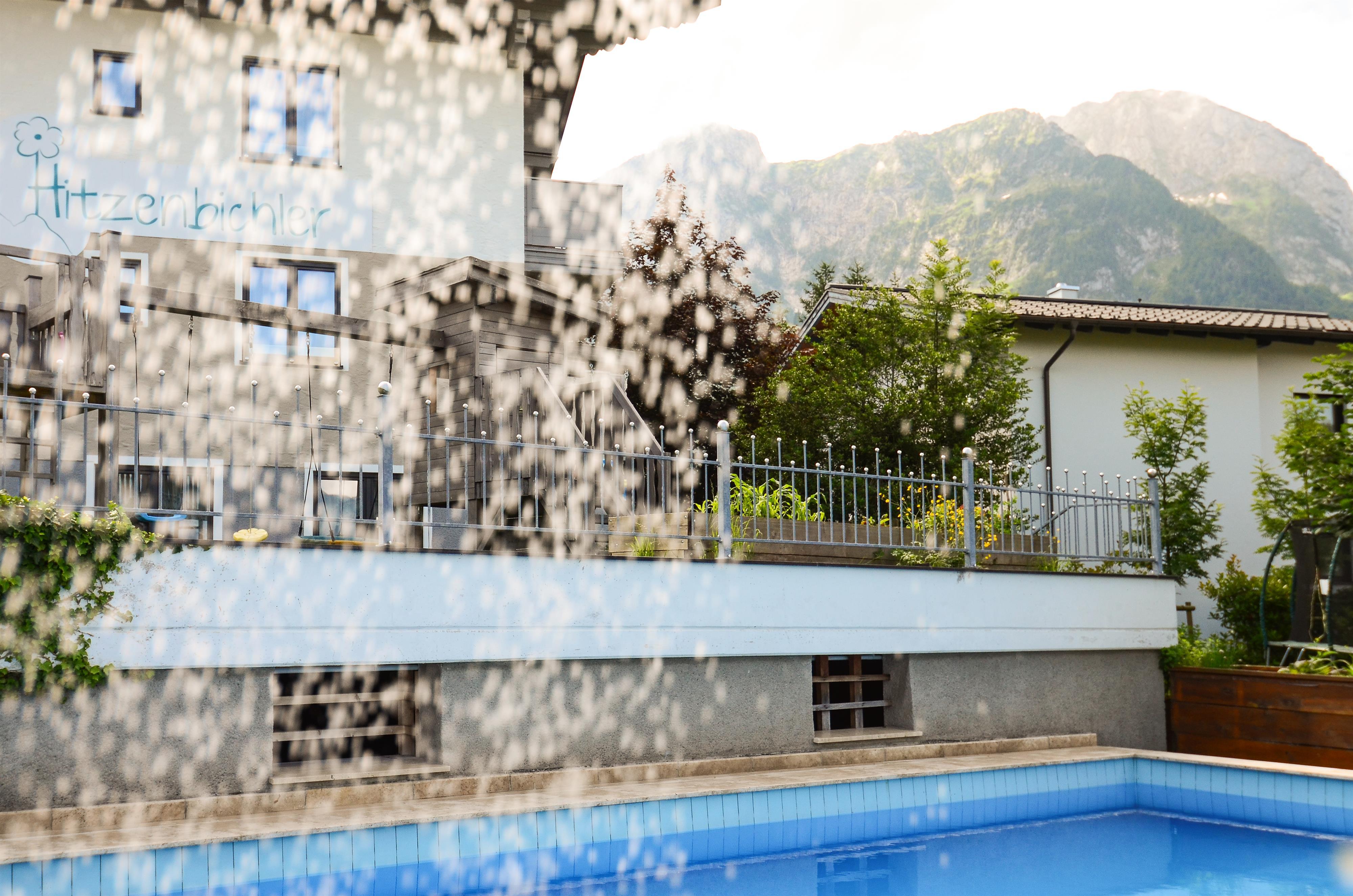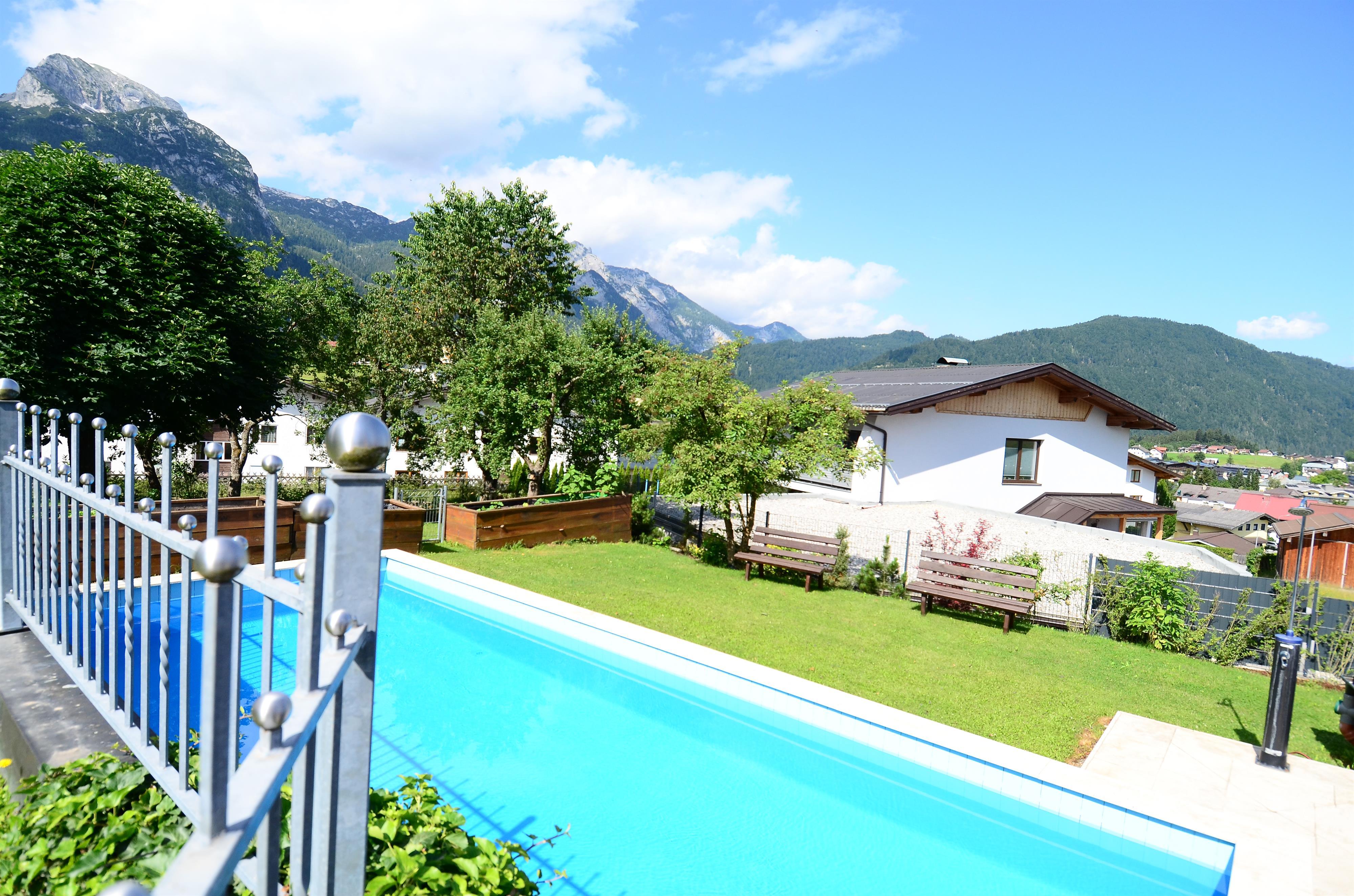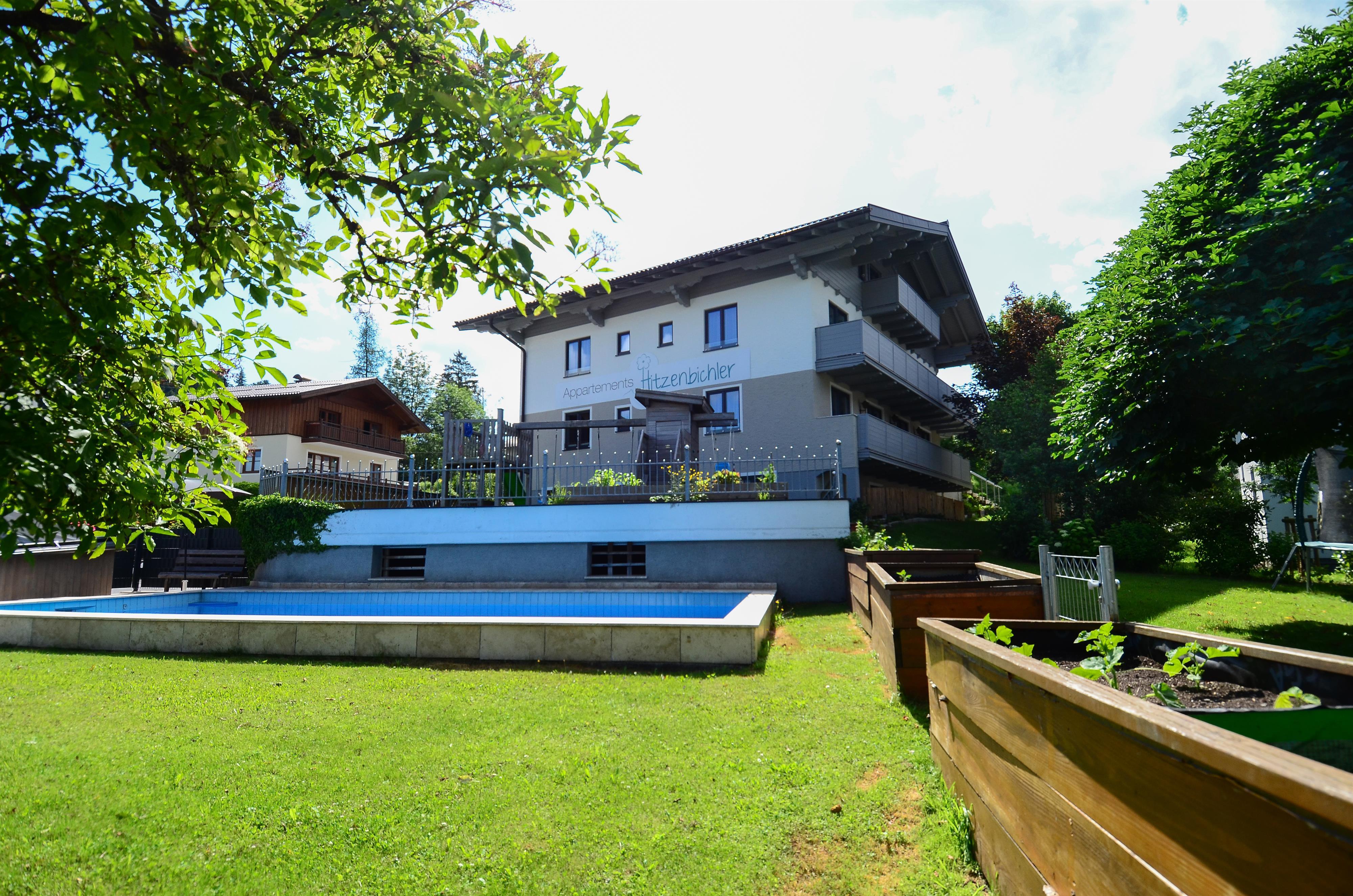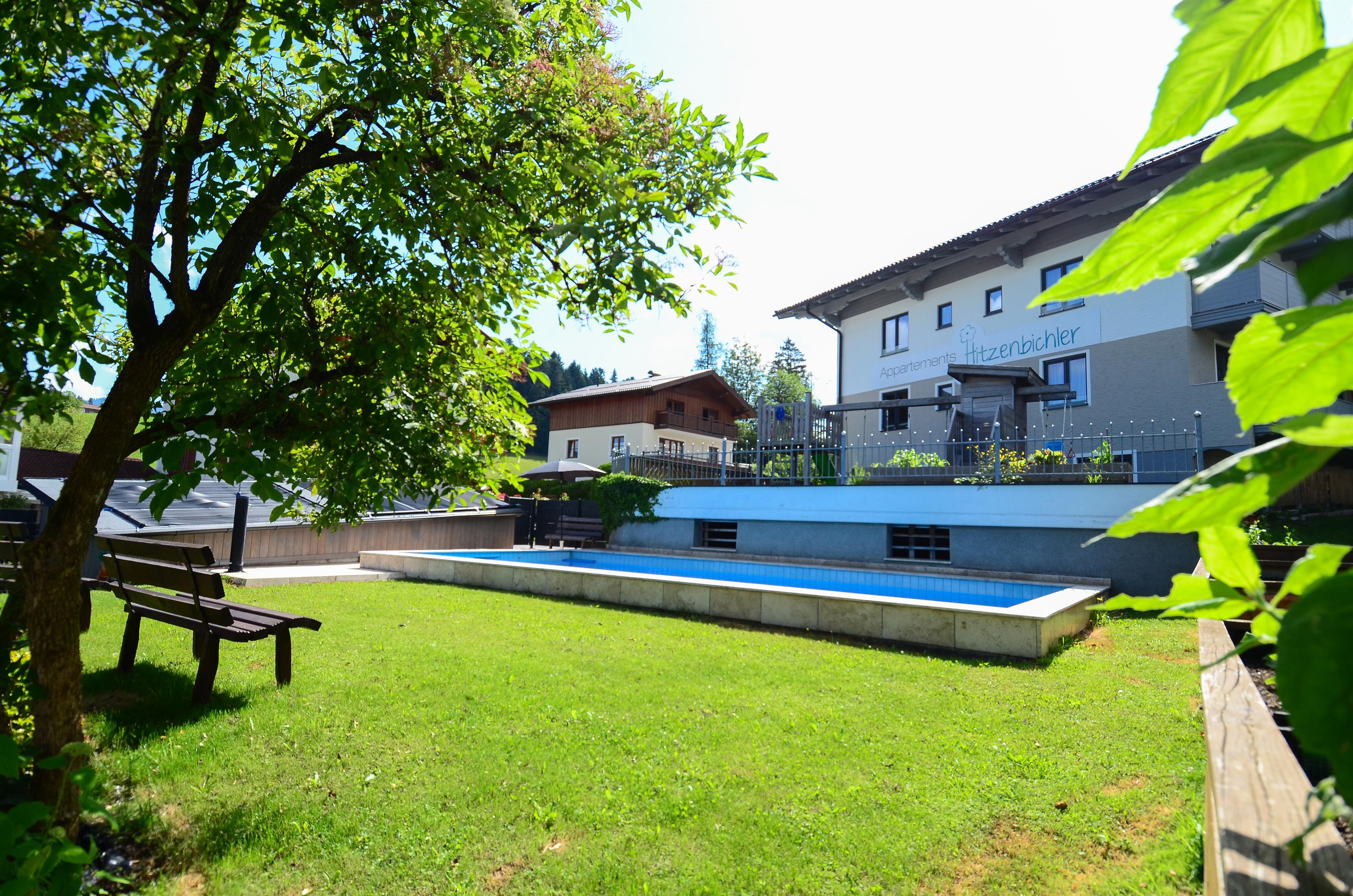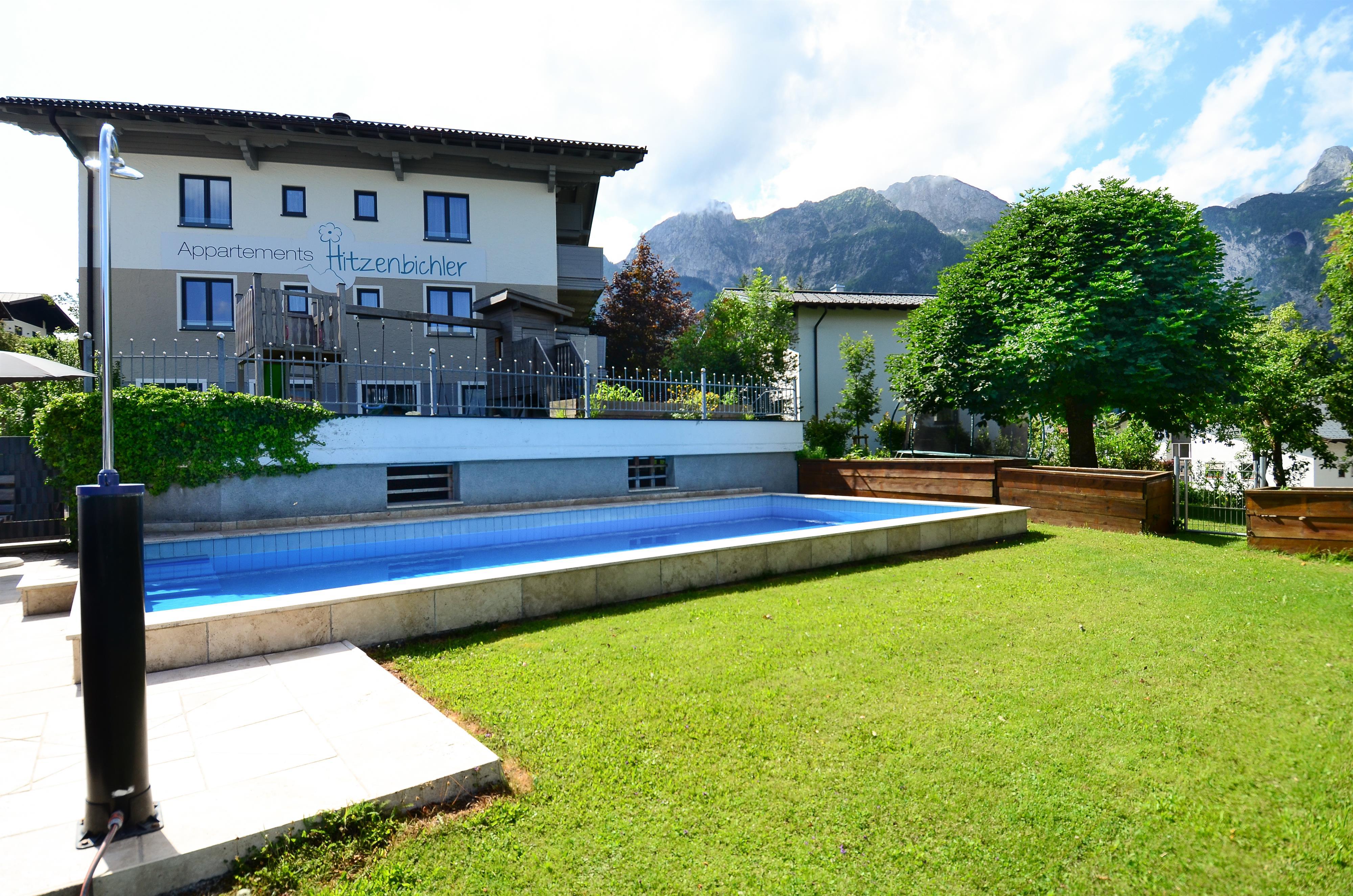Unser Garten mit großem Pool, Liegewiese und Kinderspielplatz lädt im Sommer zum Verweilen und Entspannen ein.