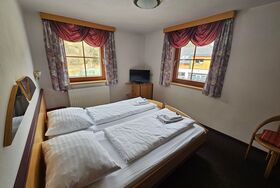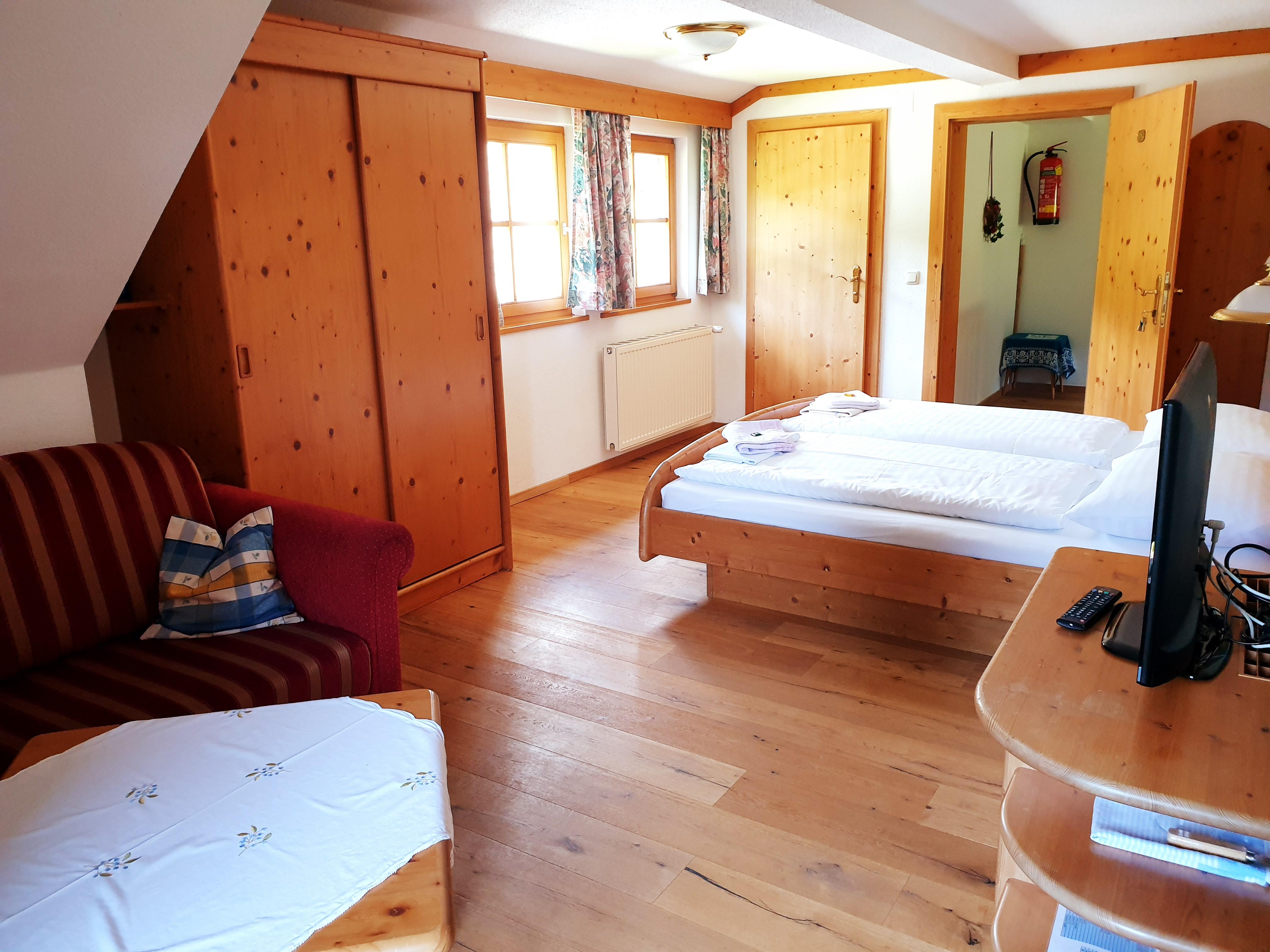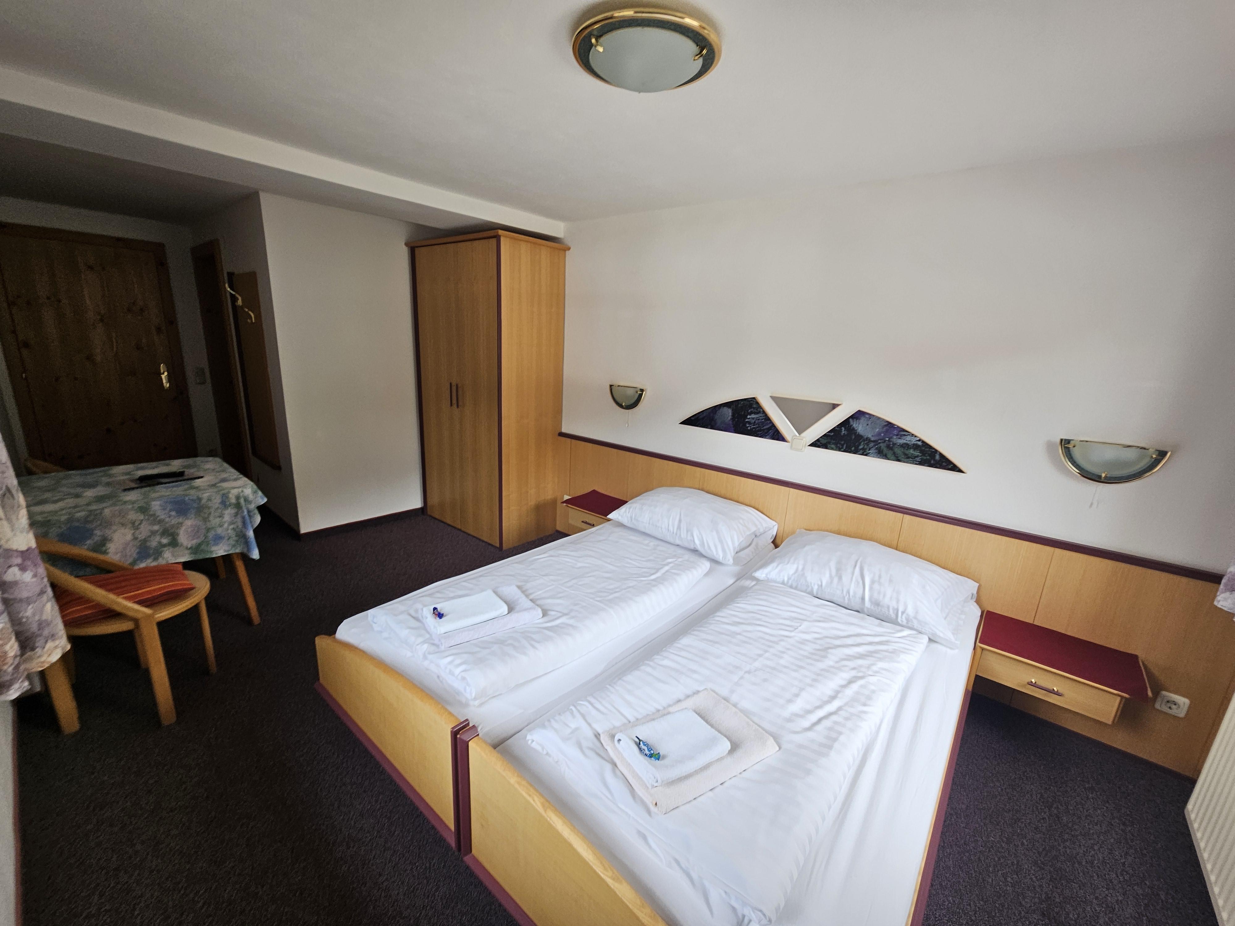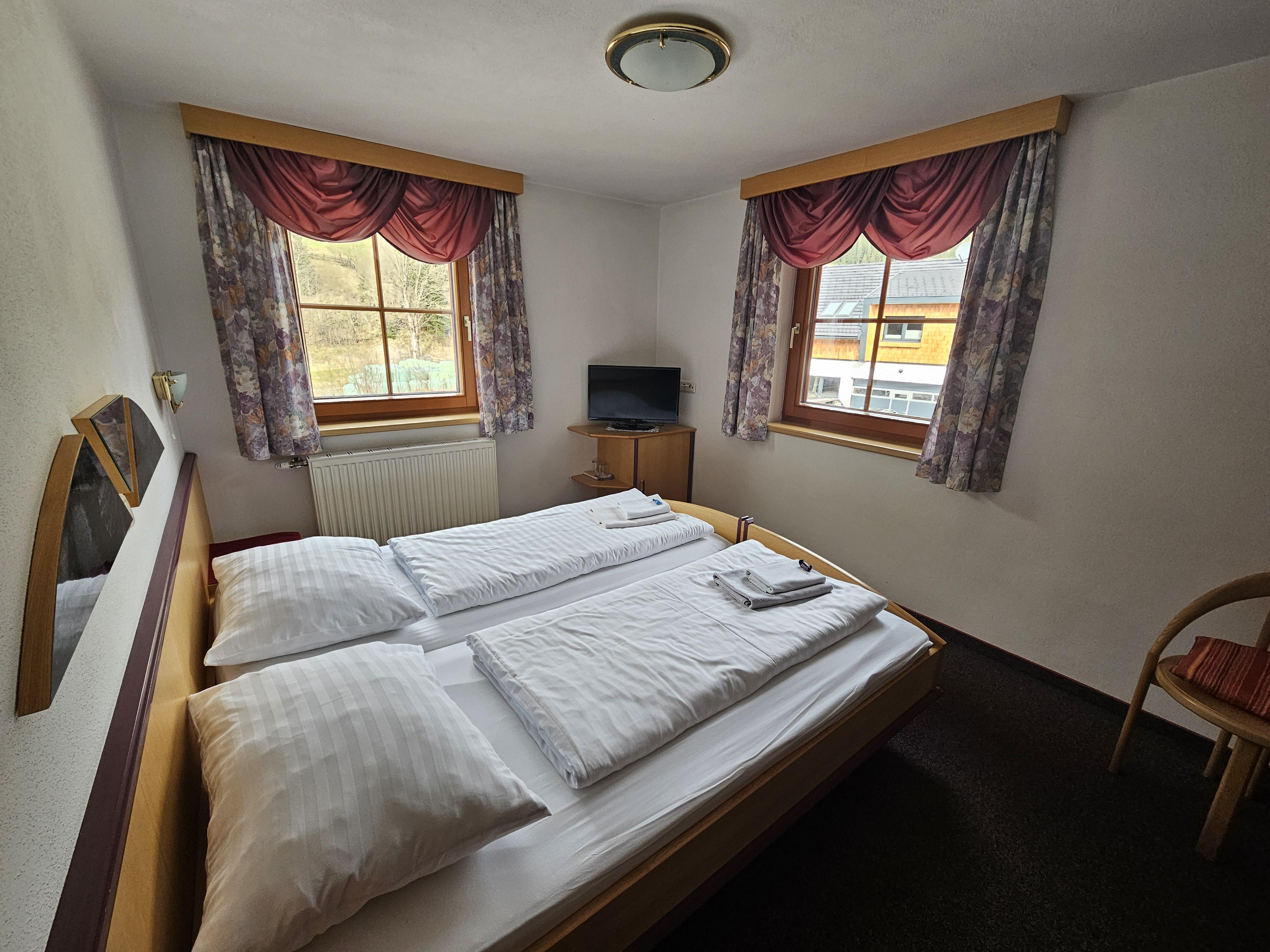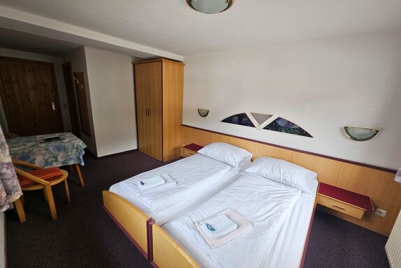 Komfortzimmer Sonnenblume (104/105) Komfortables ruhiges Doppelzimmer mit DU/WC, Flatscreen-Sat-TV, Kühlschrank, Telefon, gratis W-Lan im Zimmer, Haartrockner und Hotelsafe, Blick in das westliche Göriachtal. Auf Wunsch Halbpension mit Menüwahl.