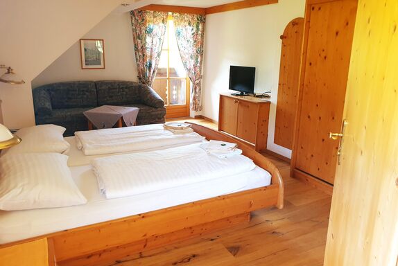 Komfortzimmer Wildkirsche (107/110) 3-Sterne Doppelzimmer, komfortabel und ruhig, mit DU/WC, gemütlicher Ausziehcouch, Balkon, Flatscreen-Sat-TV, Kühlschrank, Telefon, gratis W-Lan (WIFI) im Zimmer, Haartrockner und Hotelsafe, Blick in das südliche und westliche Göriachtal. Auf Wunsch Halbpension mit Menüwahl.