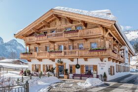 Unser Haus liegt in einer Seitenstraße, ca. 100m vom Ortszentrum entfernt mit großem Garten, Spielplatz, angrenzender großer Wiese und freiem Blick zum Wilden und Zahmen Kaiser.