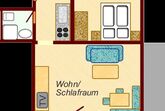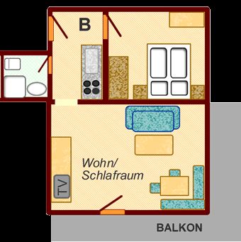 ca. 46m² groß bestehend aus Küchenzeile, 1 Doppelschlafzimmer, Wohnschlafzimmer mit Ausziehcouch, Dusche und WC, großer Balkon