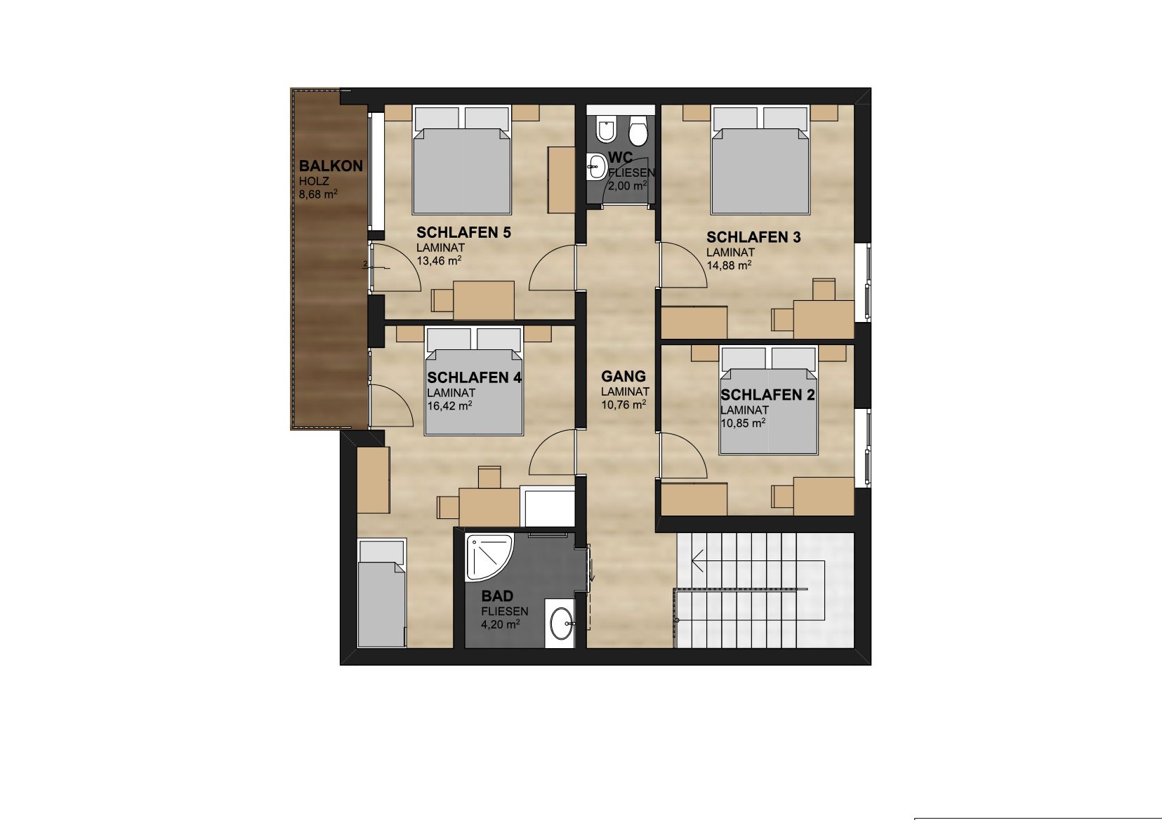 Einrichtung: 4 Schlafzimmer für 2 Personen, 1 Schlafzimmer für 4 Personen, 2 Bäder mit Dusche und WC