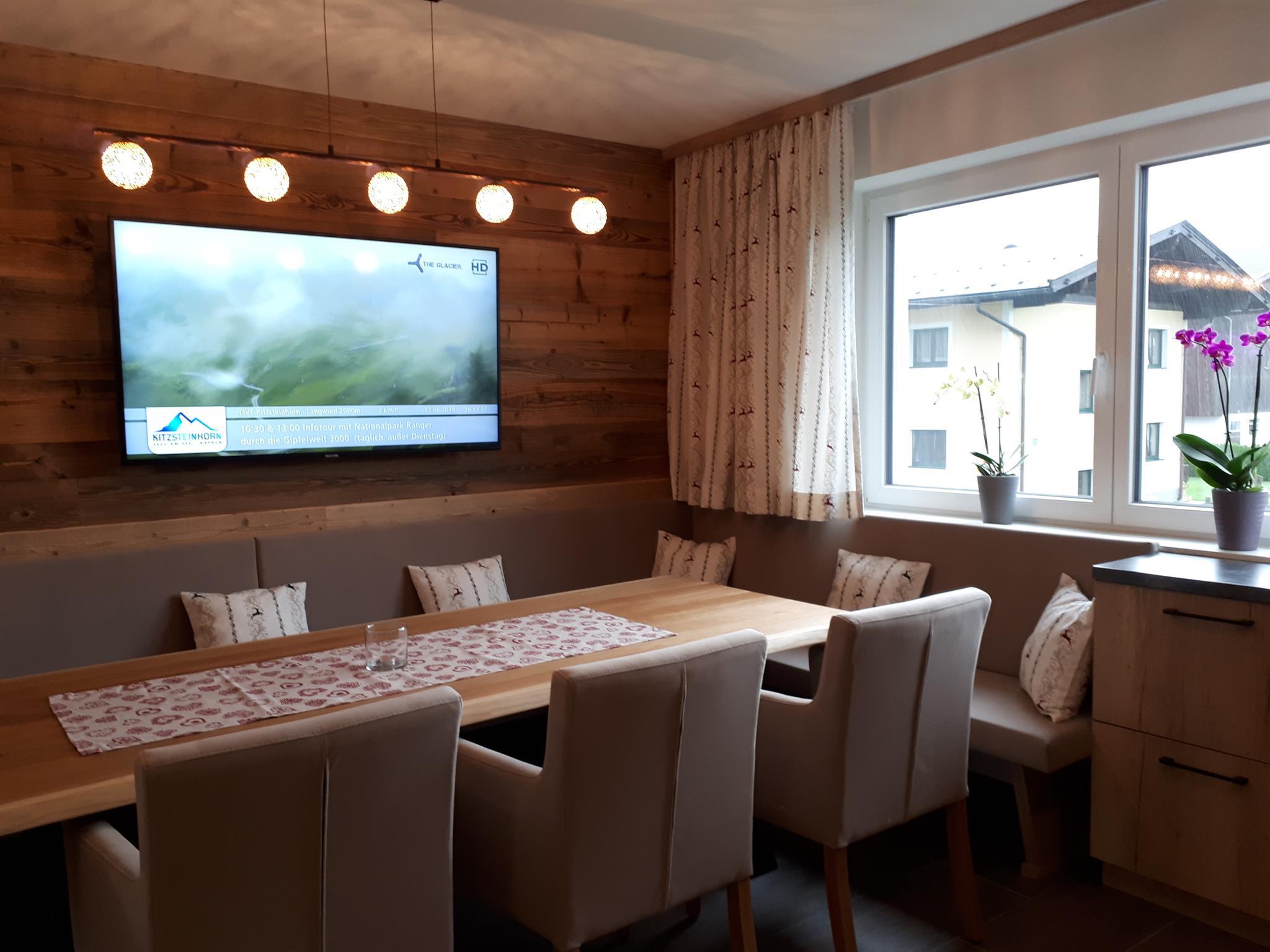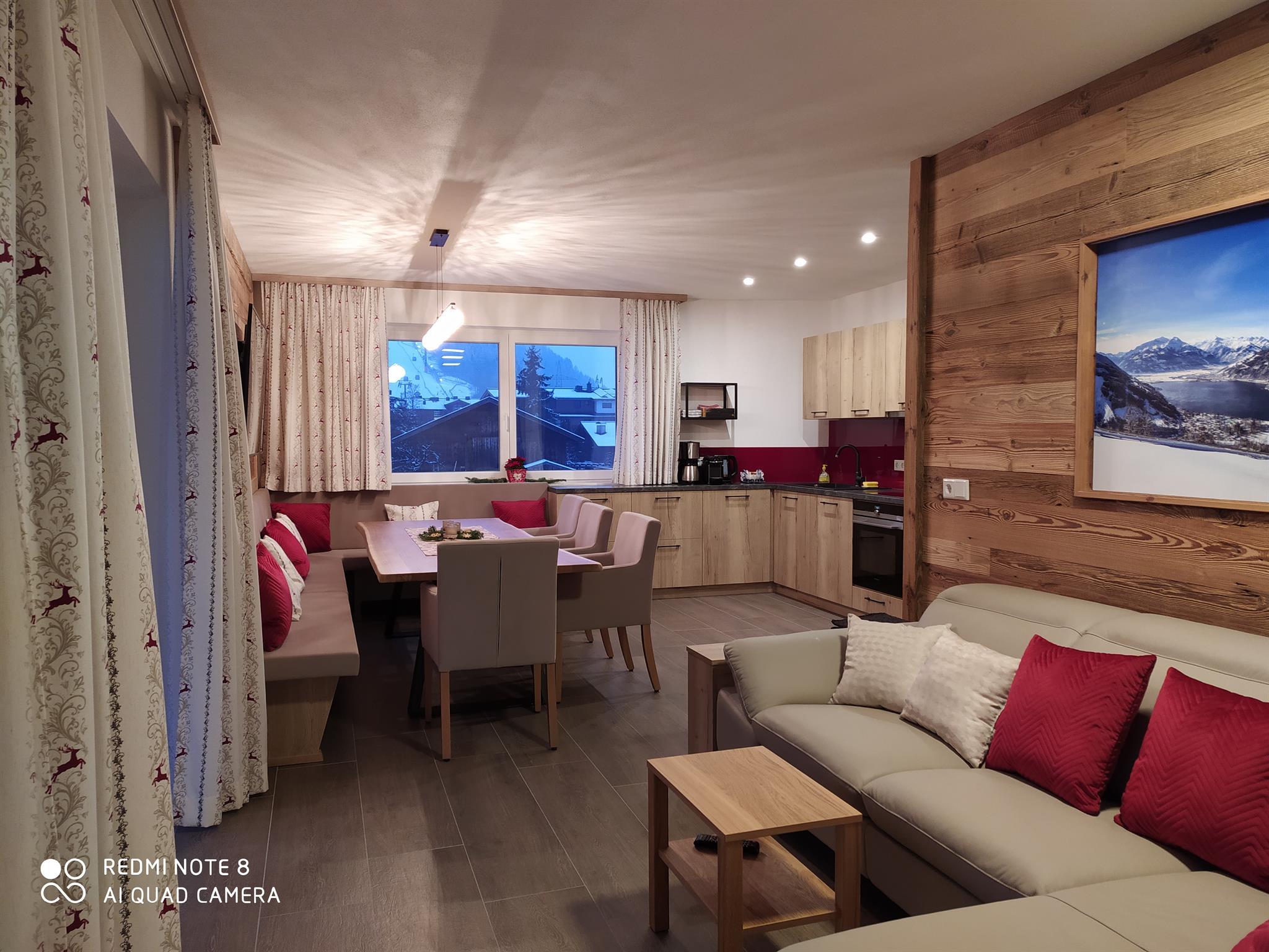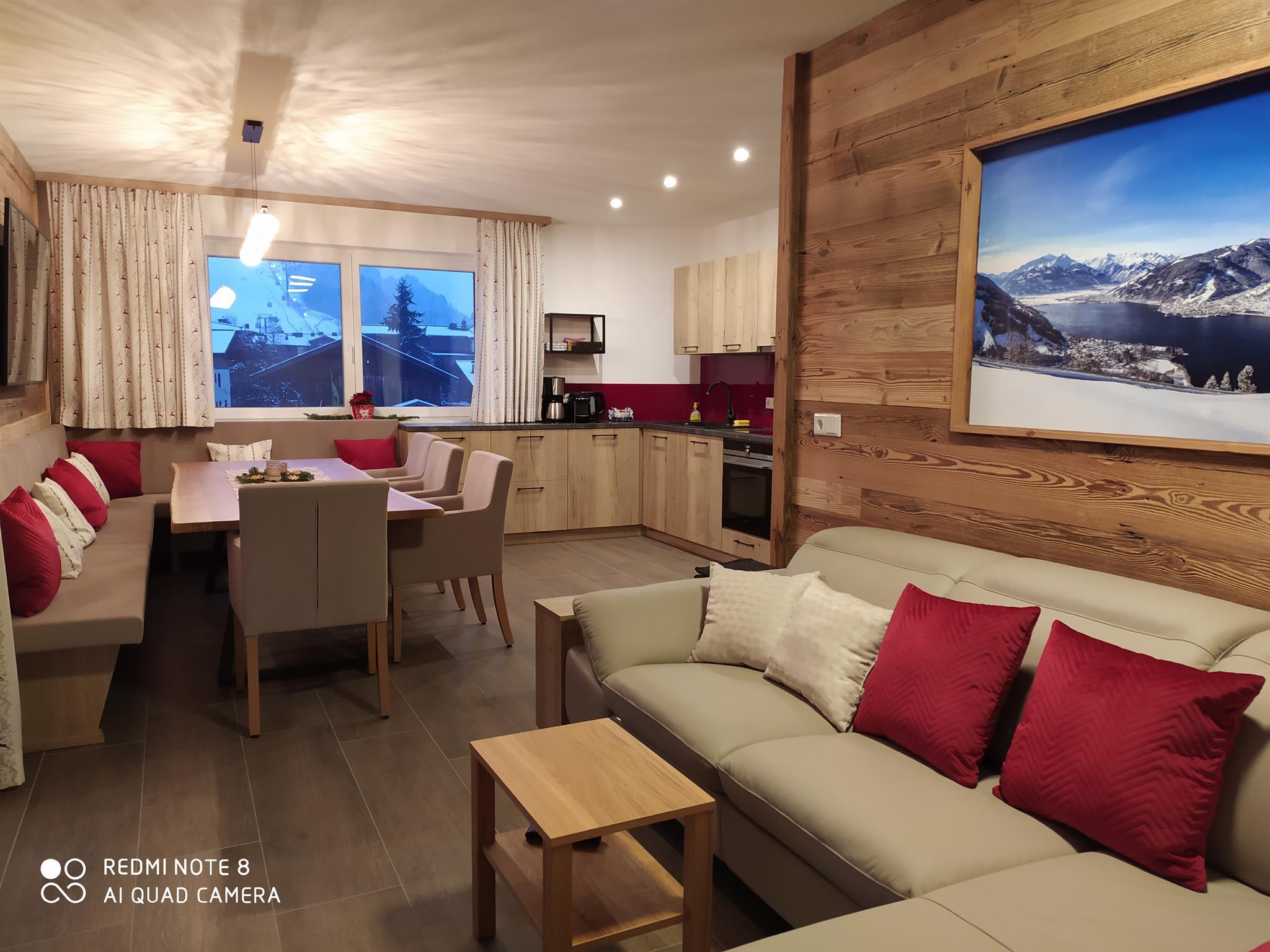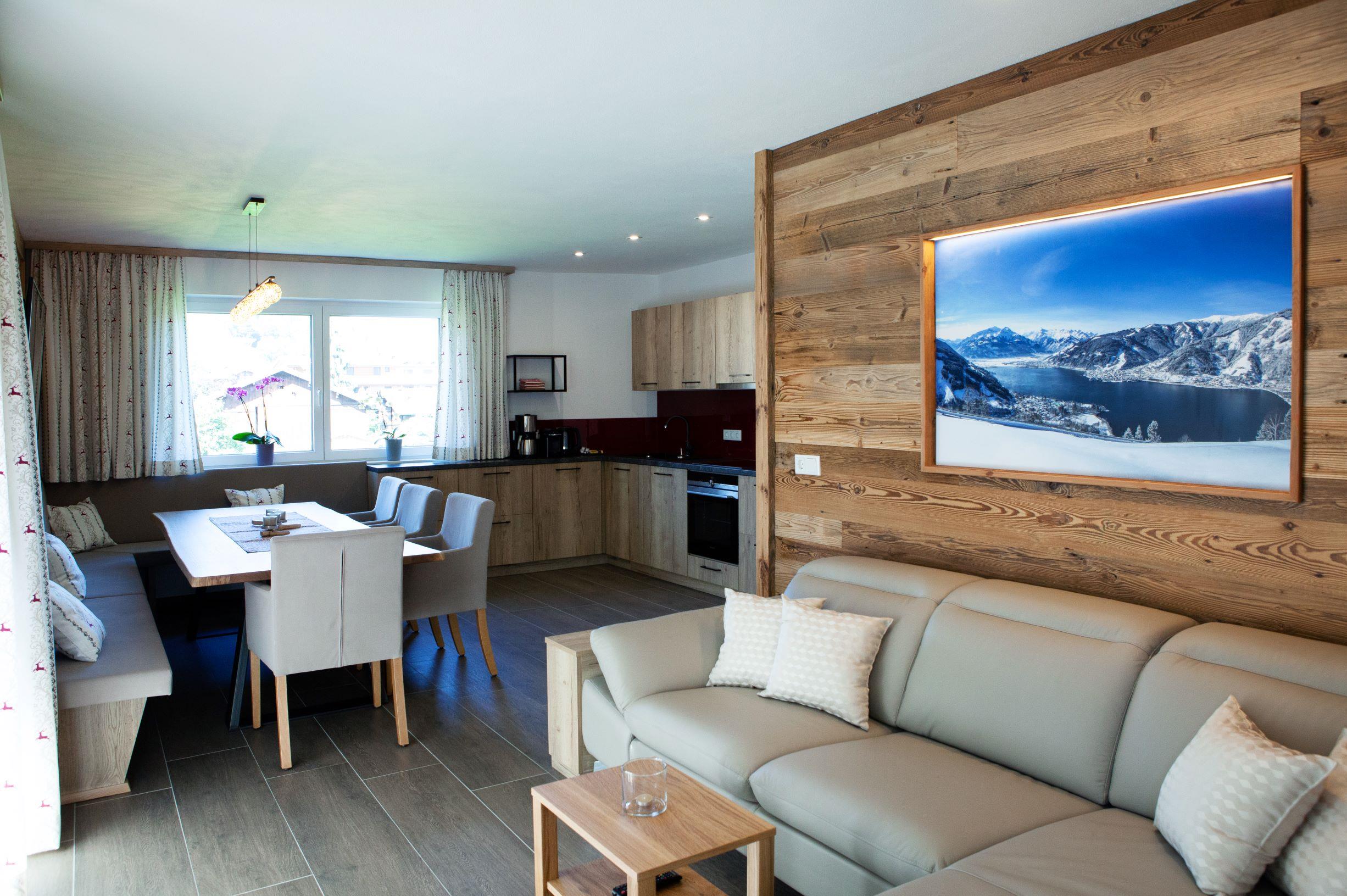... zuhause in den Bergen ... Die Panorama Lodge Kitzsteinhorn erstreckt sich über zwei Etagen im 1. Stock und Dachgeschoss unseres Neubaus. Auf ca. 95 m² finden bis zu 8 Personen bequem Platz. Im 1. Stock befindet sich eine geräumige, moderne, voll ausgestattete Wohnküche mit Balkon; im Dachgeschoss 3 Schlafzimmer (2 Doppel-, ein 4-Bettzimmer), 2 Badezimmer sowie ein weiterer Balkon. Die Einrichtung im eleganten, alpenländischen Ambiente strahlt österreichische Gemütlichkeit aus. Wir haben großen Wert auf regionale, natürliche Einrichtungsmaterialien gesetzt, die ein angenehmes Wohnklima erzeugen. Alle Zimmer sind mit Flat-TV ausgestattet. Parkplatz und WiFi, Handtücher und Bettwäsche sind inklusive.