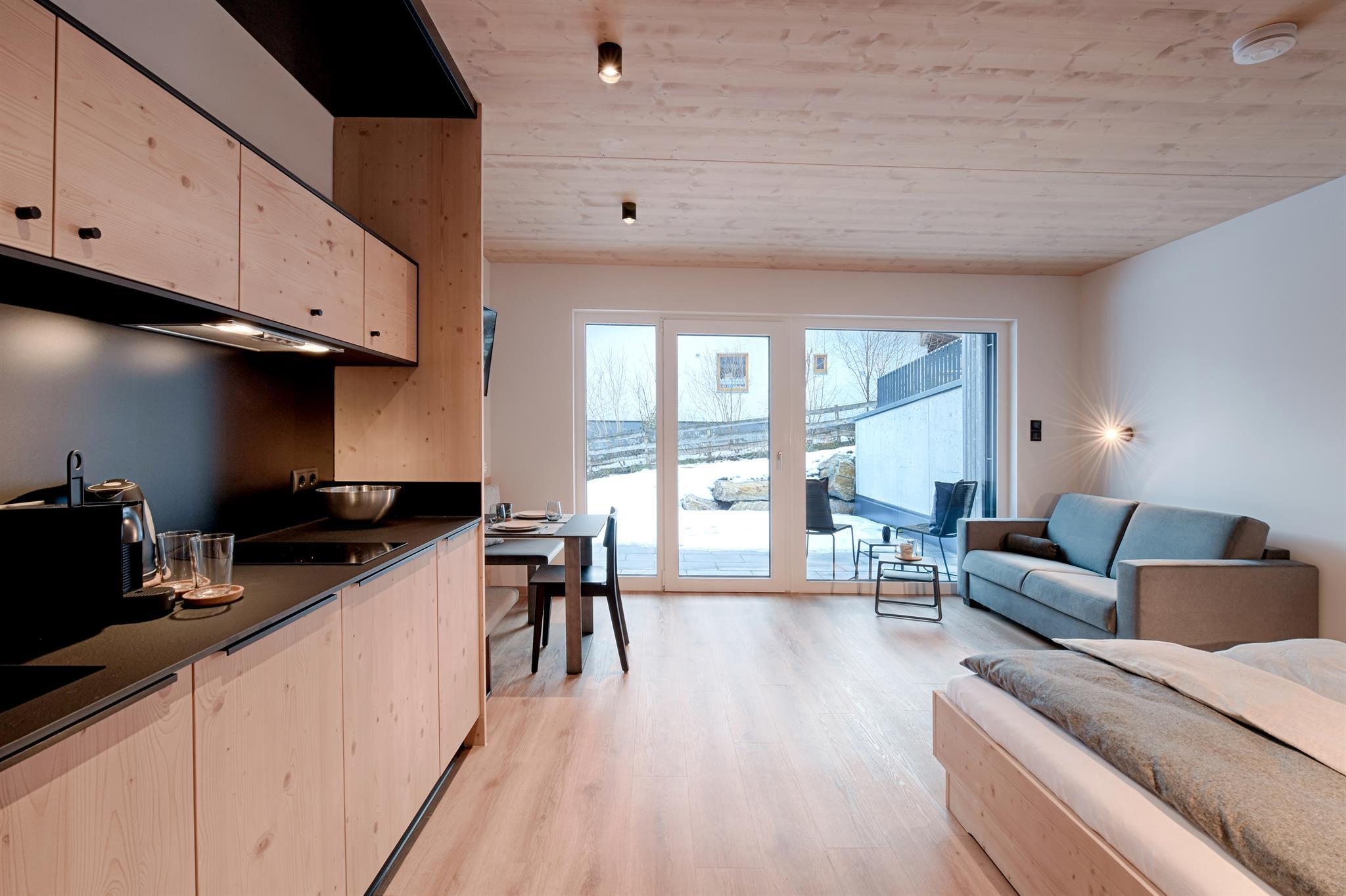 Klare, hochwertige, lichtdurchflutete, minimalistische Apartments mit großen Fensterfronten für den optimalen Ausblick auf unsere wunderschönen Berge und Skipisten! - direkt vor der Türe!