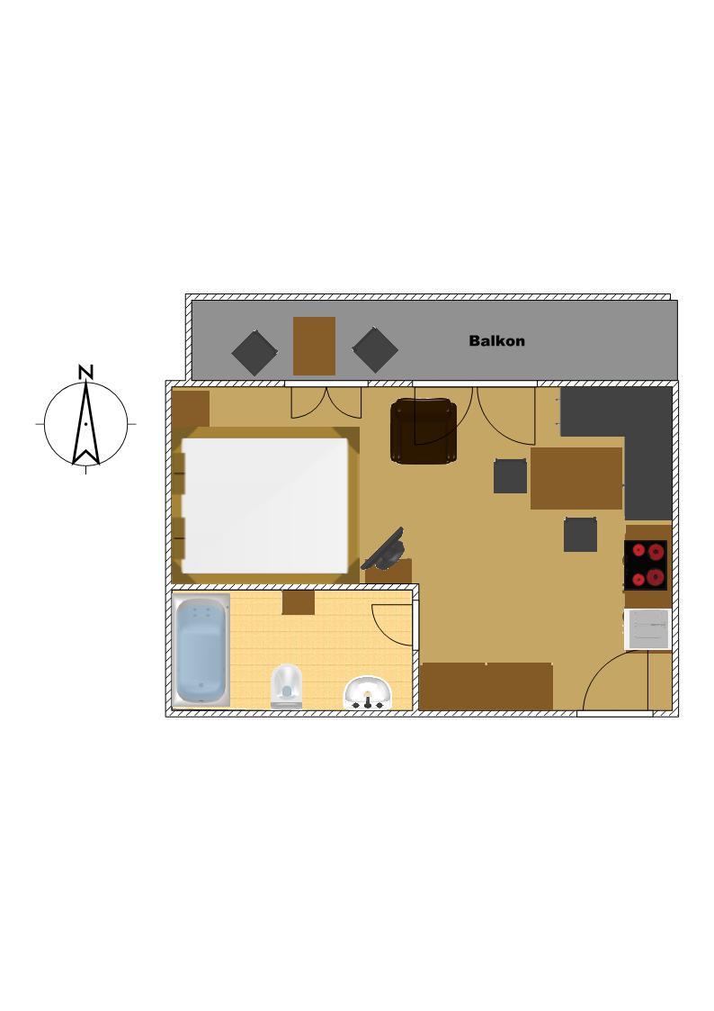 ca. 25 m², Wohn-Schlafraum für 2-3 Personen mit einem Doppelbett, einem Ausziehsofa, Kochnische, Sitzecke, Bad mit Dusche und Wanne, Kabel-TV, W-LAN, Balkon