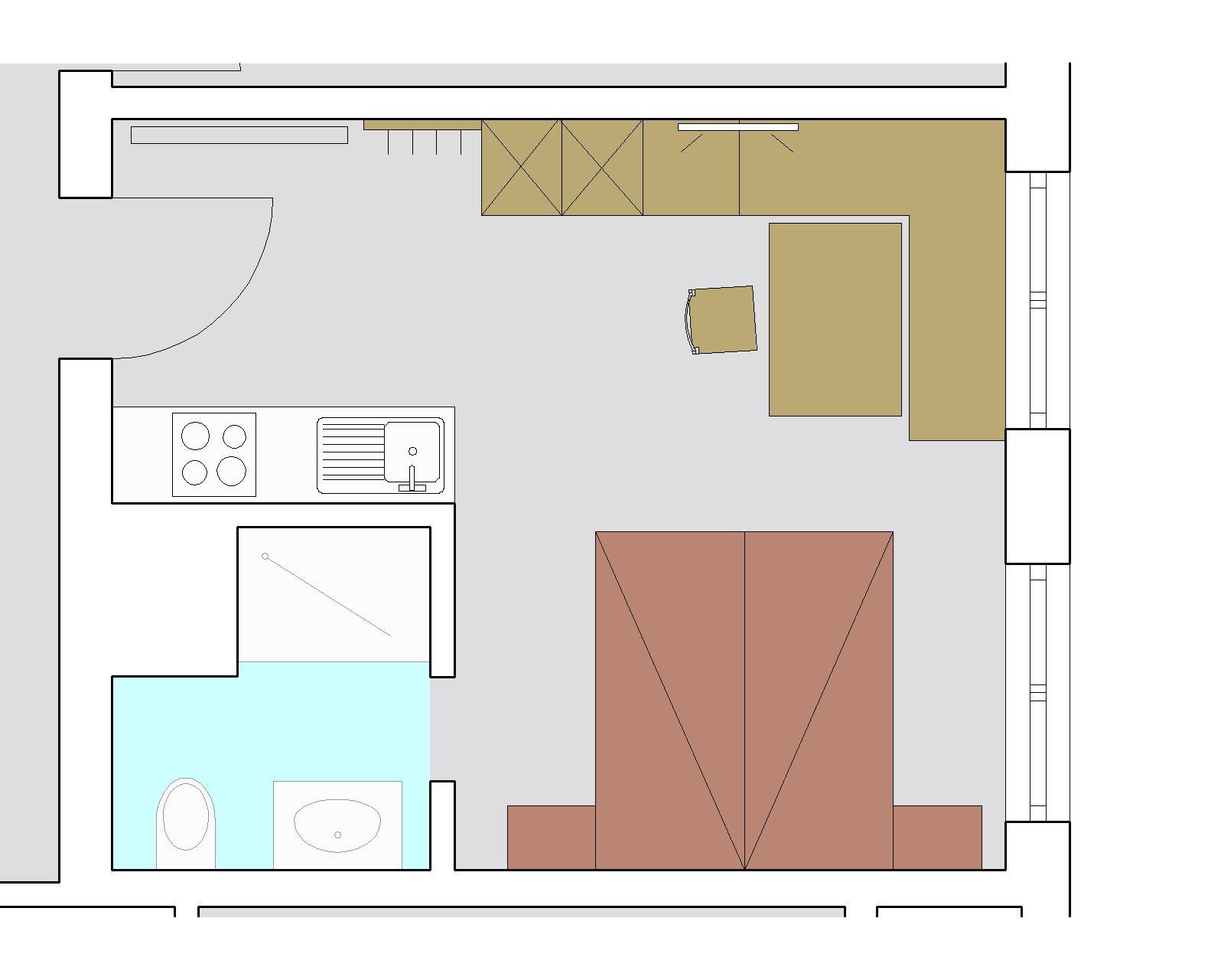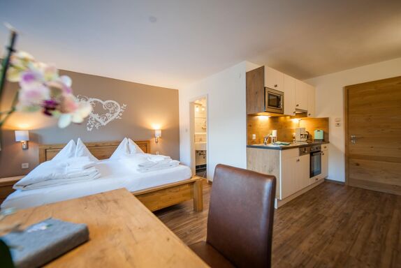 Das Studio verfügt über eine komplett ausgestattete Küche, Kühlschrank, E-Herd, Backrohr, Geschirrspüler, Spüle, Essplatz und Geschirr. Doppelbett, DU/WC, gratis Internet und Kabel TV.