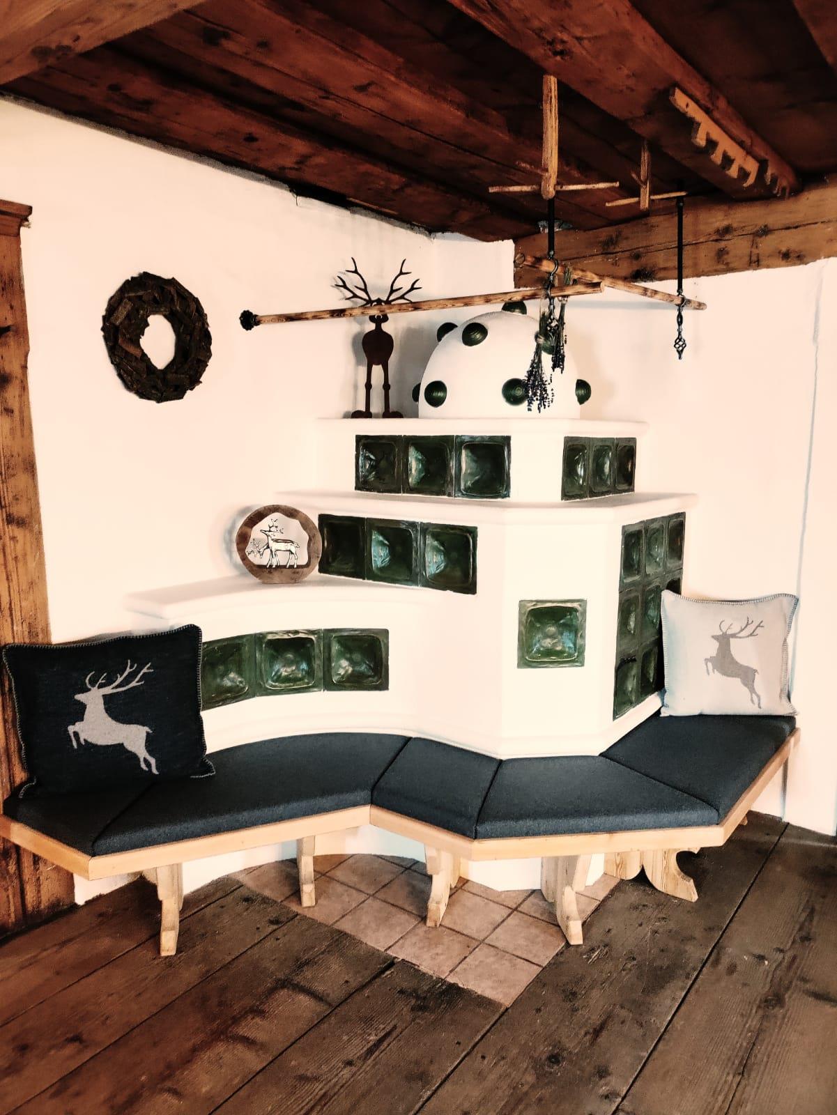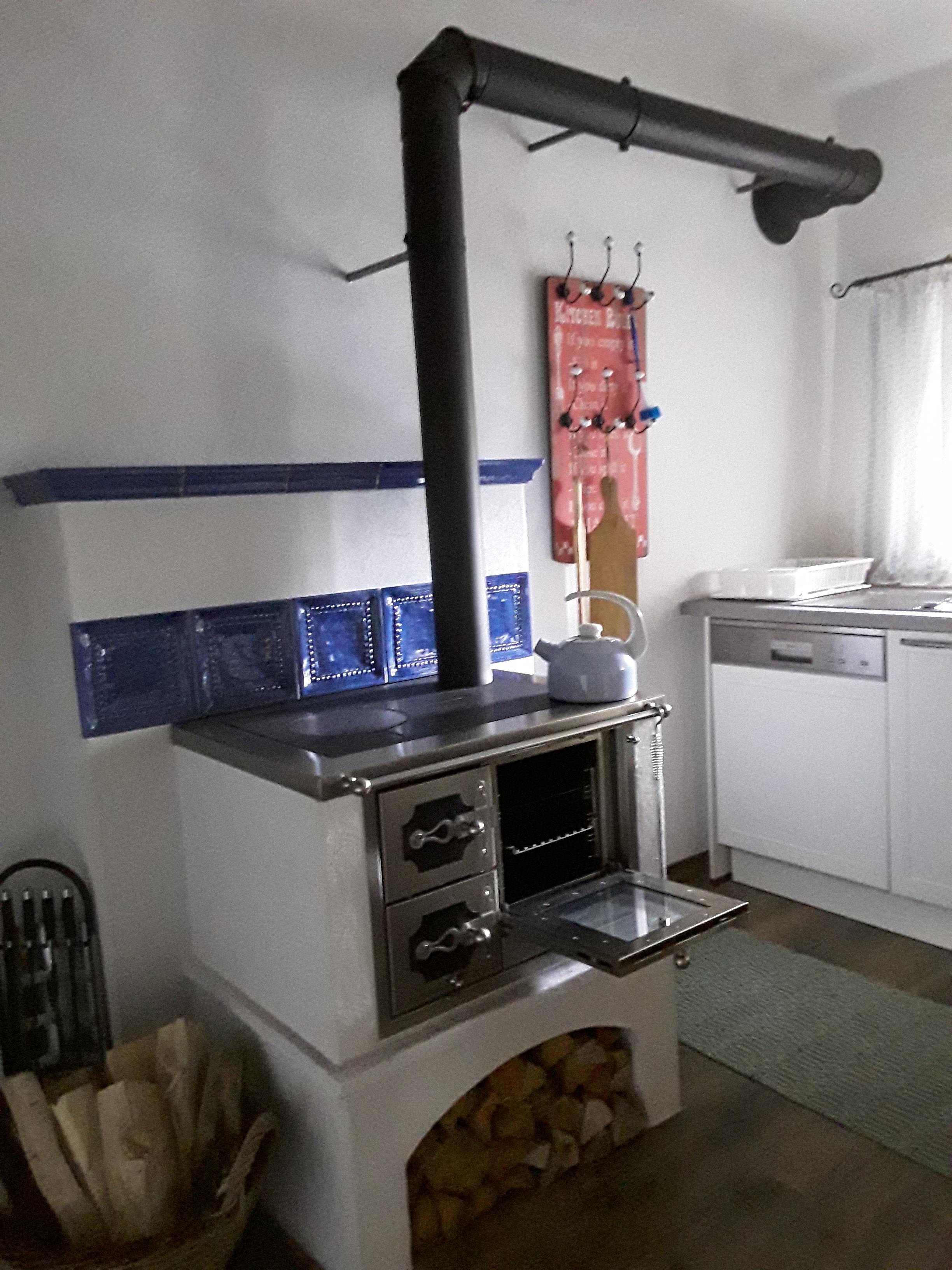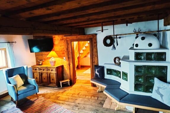 Im Erdgeschoß ist die komplett ausgestattete Küche mit Holzofen, eine heimelige Stube mit Kachelofen, Sofa und FLAT-TV
