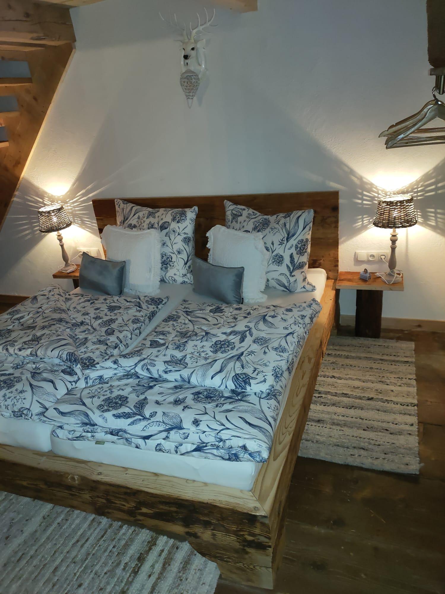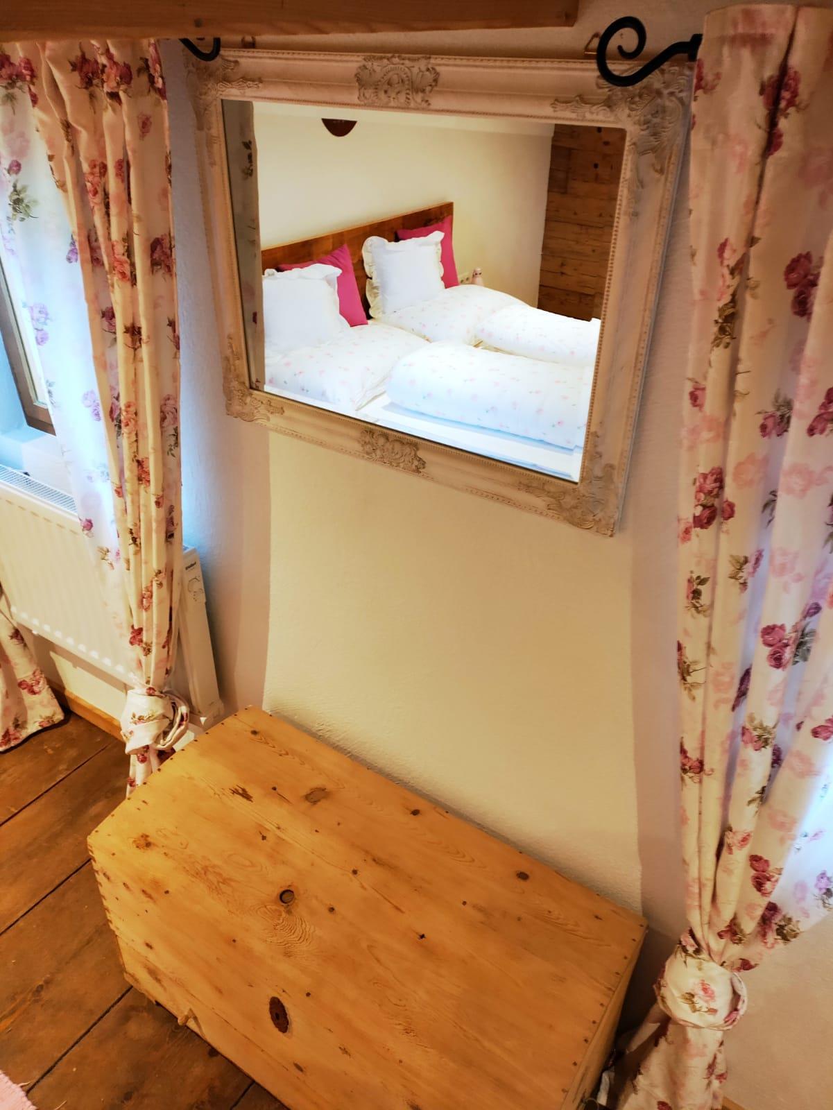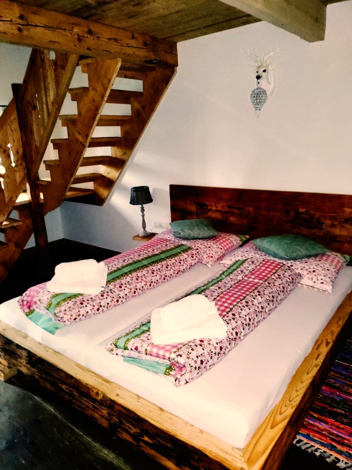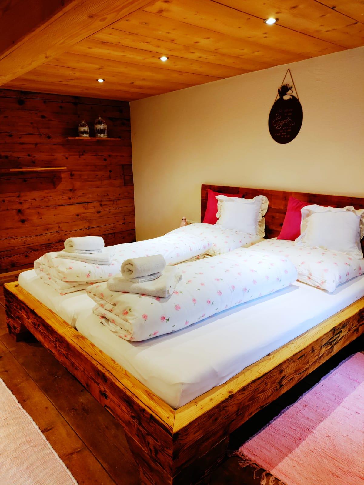 Im zweiten Stock befinden sich die anderen beiden Doppelzimmer mitDoppelbetten aus Altholz, ein Badezimmer mit Dusche/WC und ein großzügiggestaltetes Vorhaus mit Lese Ecke, Sofa und FLAT-TV