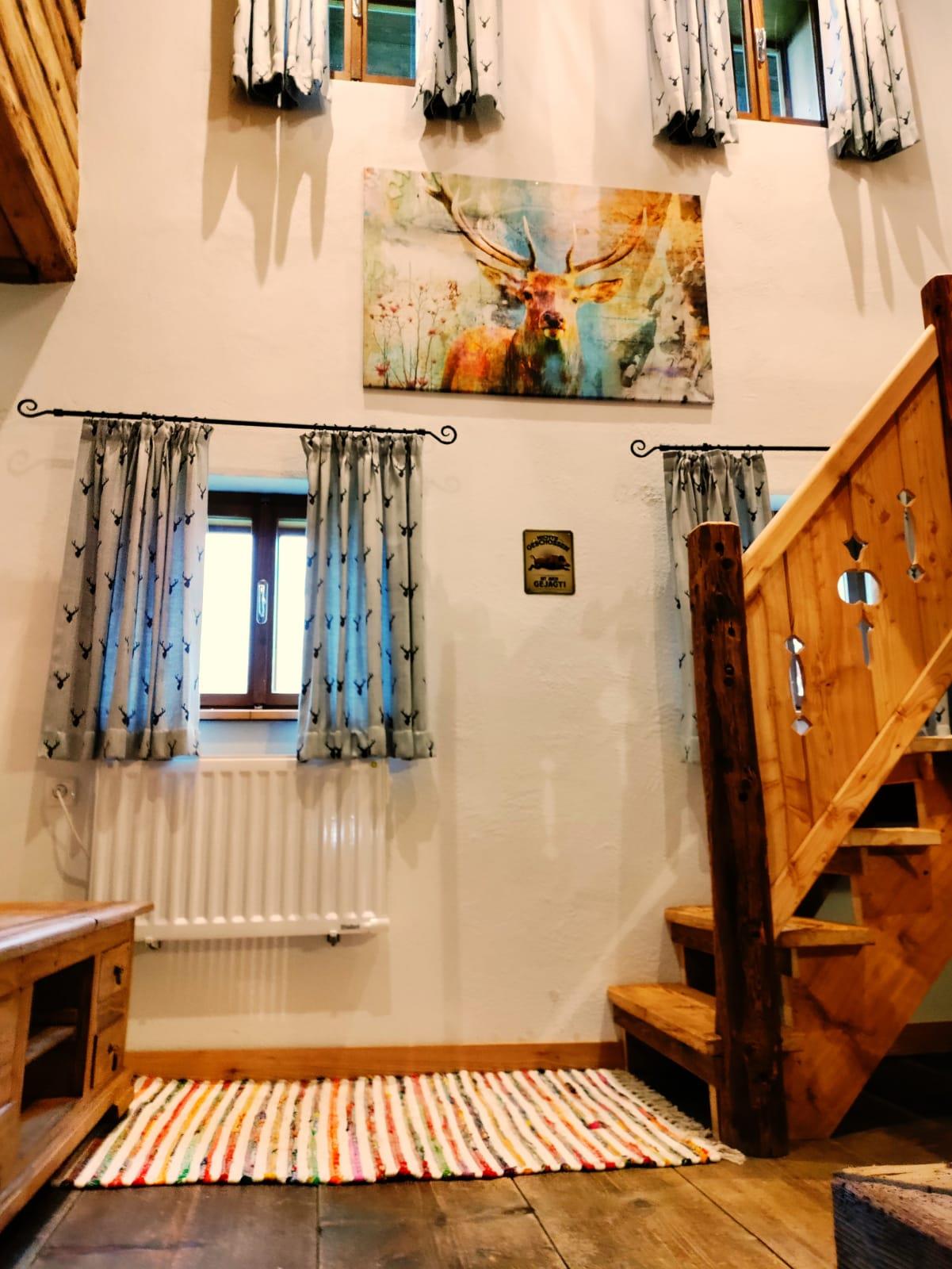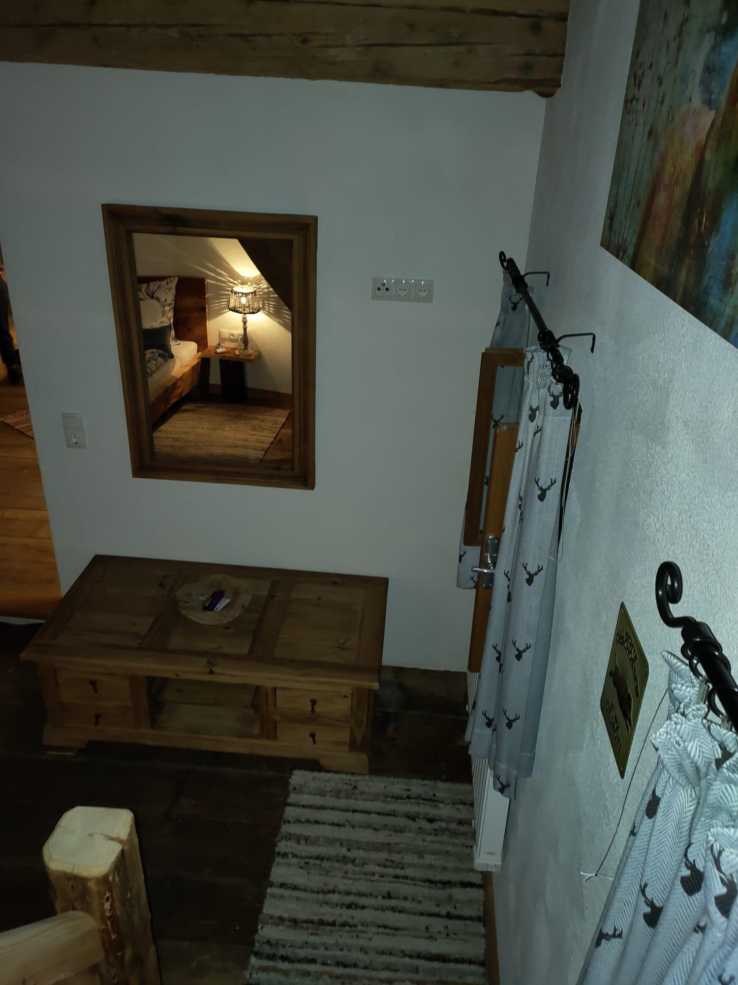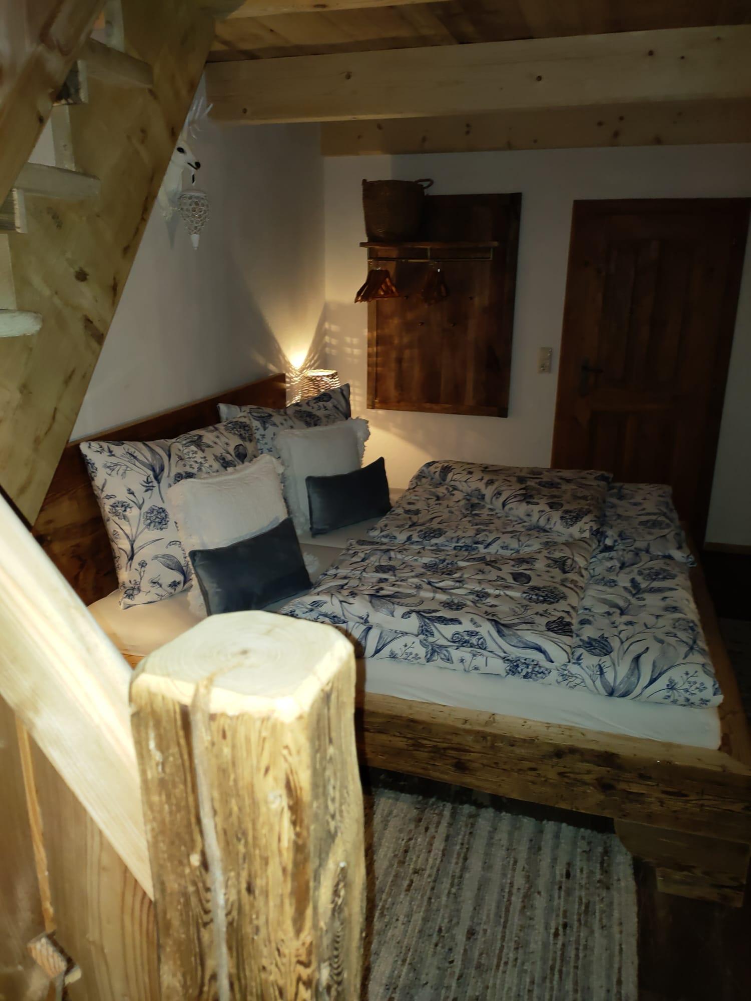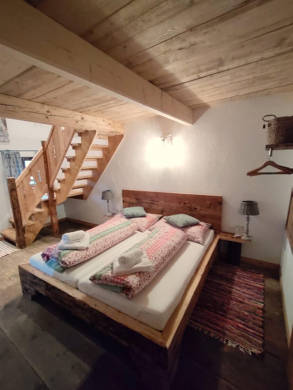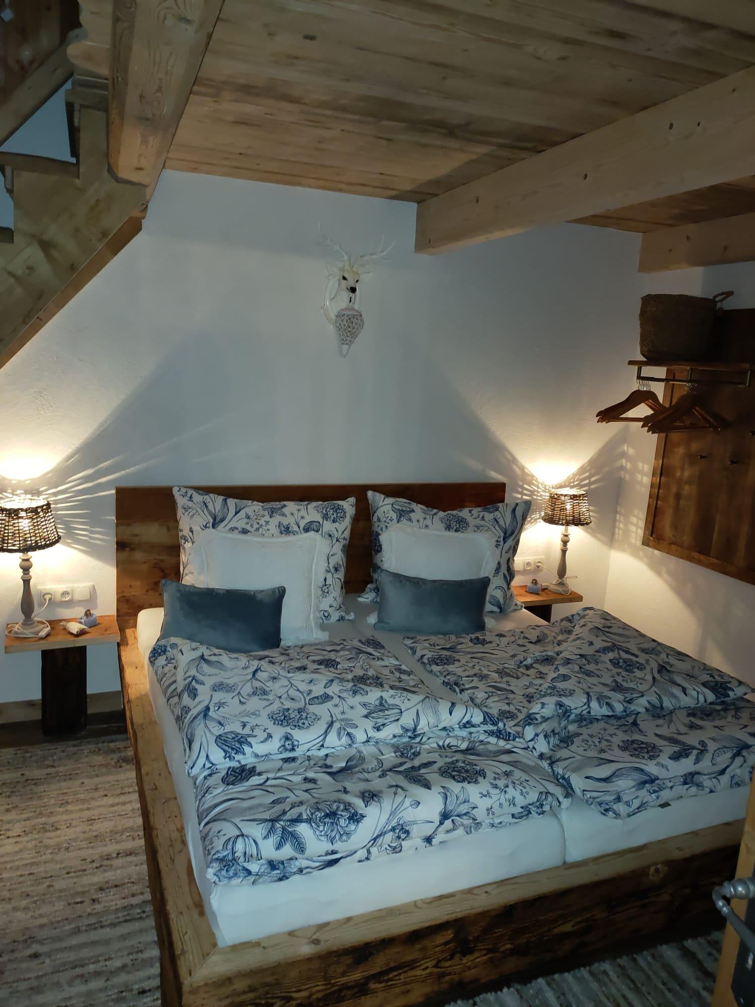 Im zweiten Stock befinden sich die anderen beiden Doppelzimmer mitDoppelbetten aus Altholz, ein Badezimmer mit Dusche/WC und ein großzügiggestaltetes Vorhaus mit Lese Ecke, Sofa und FLAT-TV