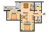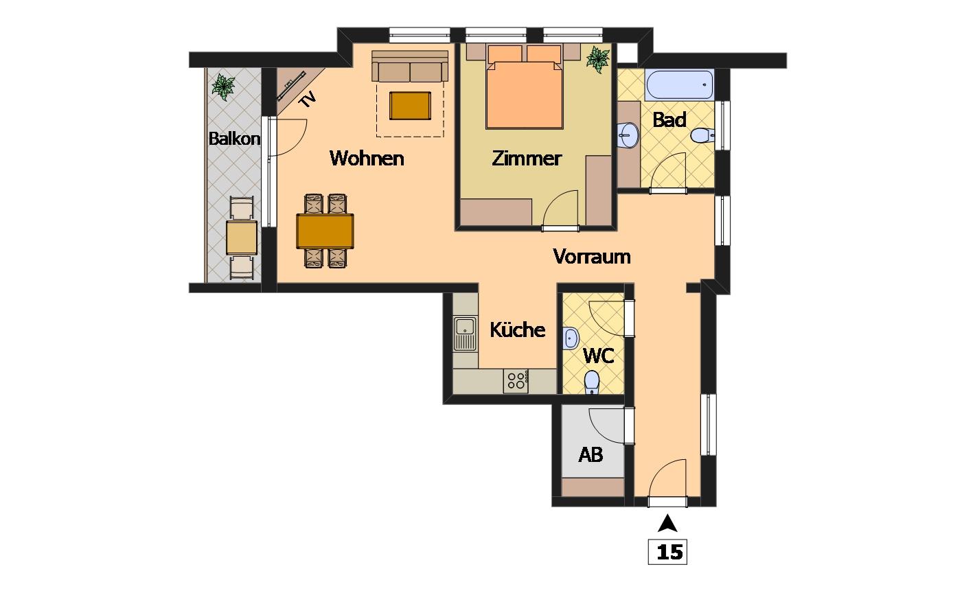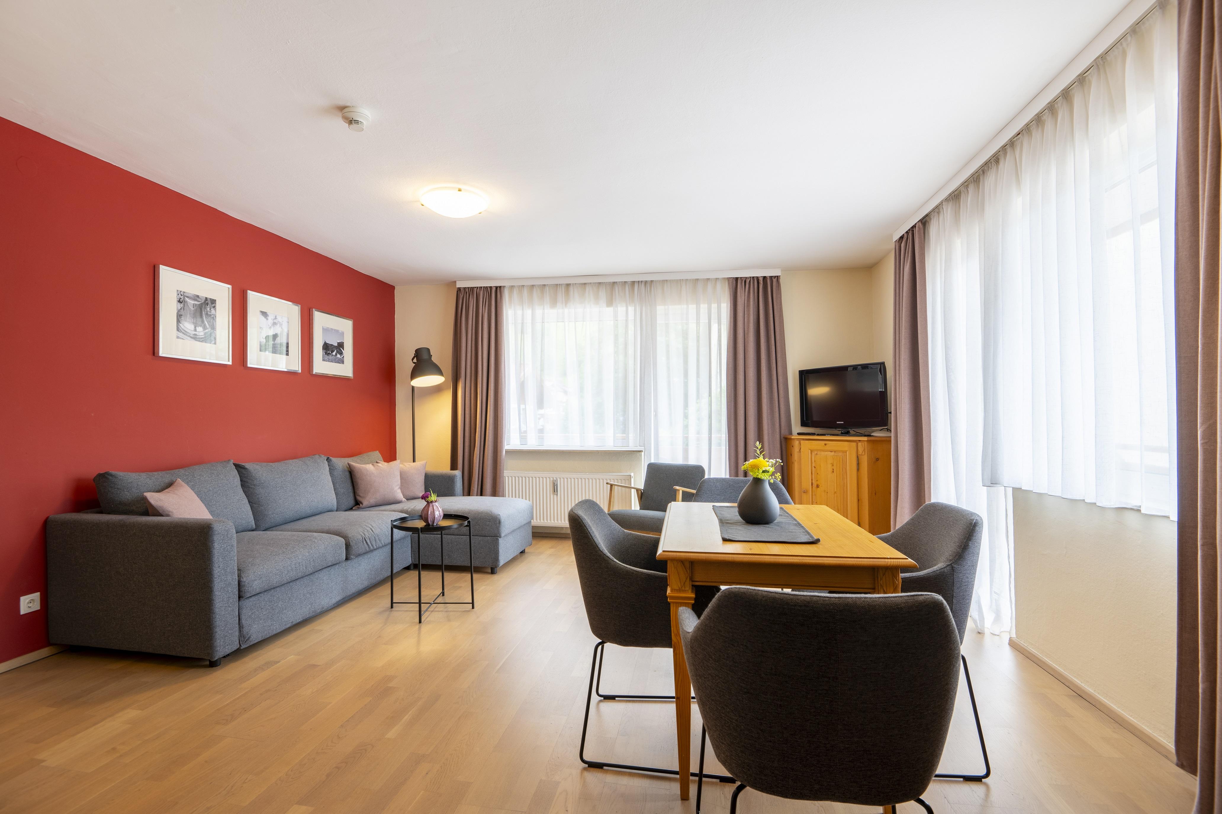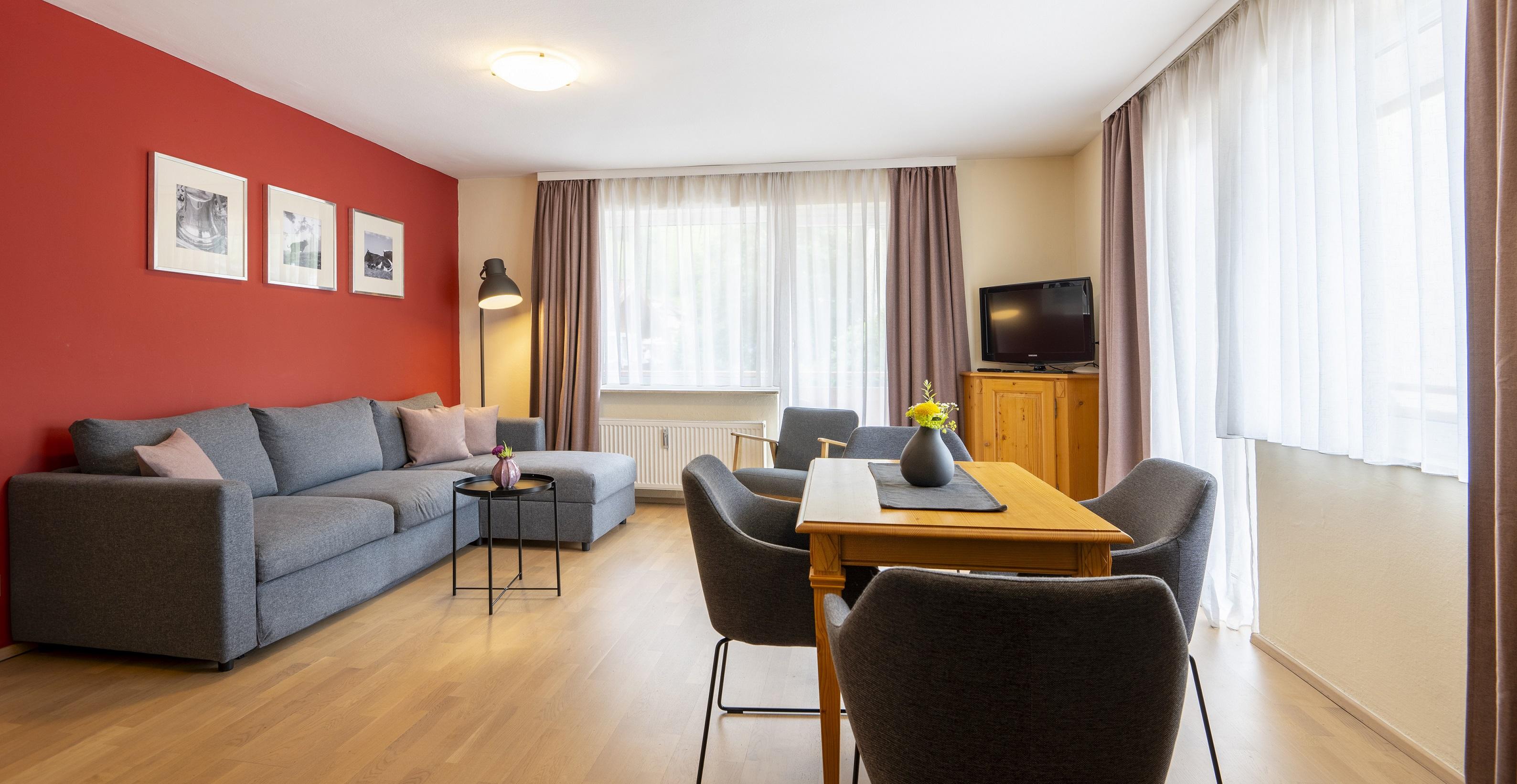 Appartement mit 65 m², großer Wohnraum mit vollausgestatteter Küchenzeile und Doppelcouch, Schlafzimmer mit Ehebett, Ankleideraum, Badezimmer mit WC, getrenntes separates WC, TV, Telefon, W-LAN, Balkon