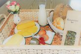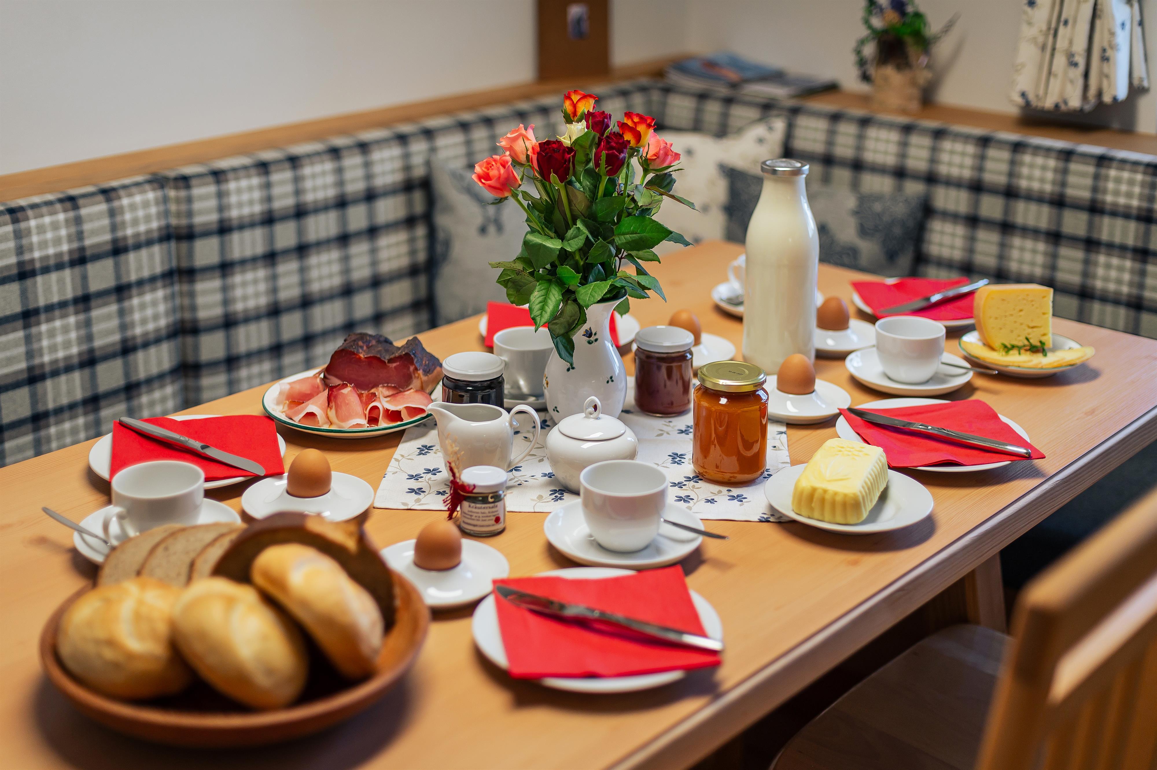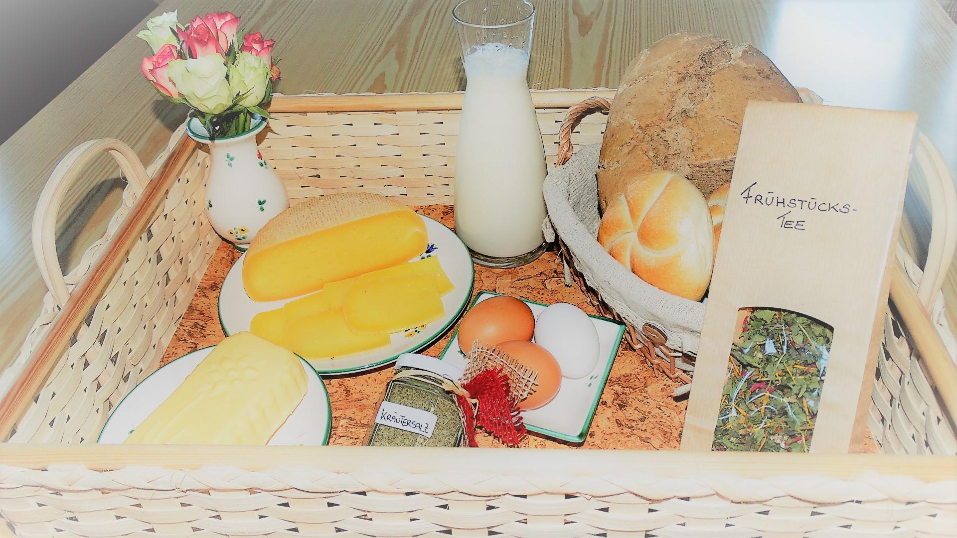 Zum Frühstück bieten wir Ihnen einen Frühstückskorb, gefüllt mit unseren selbsterzeugten Produkten (Butter, Käse, verschiedenen Marmeladen, Speck, Brot, Eier, Milch, Brötchen, verschiedenen Teemischungen) zum Genießen im Appartement an. Sie können die Produkte frei nach Ihren Wünschen wählen.