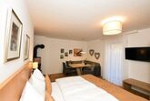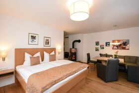 Romantik und Gemütlichkeit für Zwei: Kombinierter Wohn-Schlafbereich mit Kaminofen, gemütlicher Sitzecke mit Mühlsteintisch, großem Flatscreen mit Kabel-TV, komplett ausgestattete Küche, Bad mit Dusche, WC, Radio, Kosmetikspiel, Fön und Infrarotkabine. 20m² große Terrasse. Mit eigenem Zugang unsere Garten.