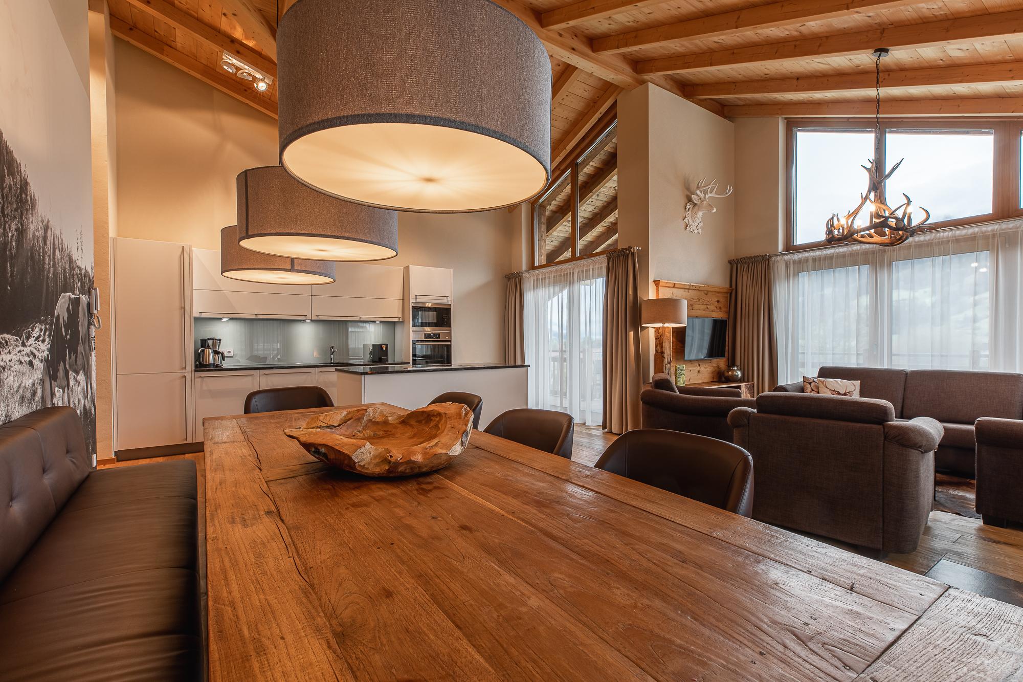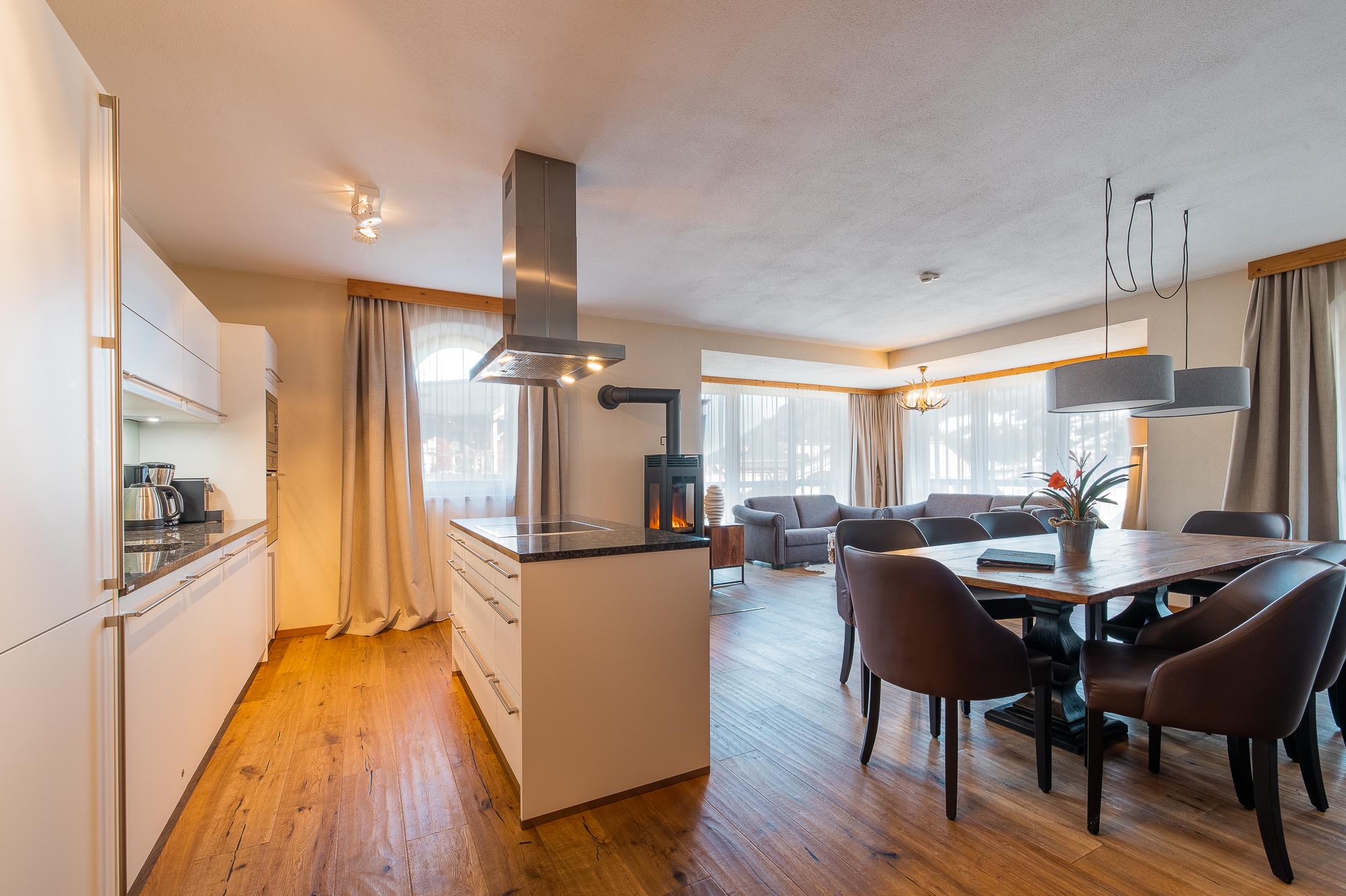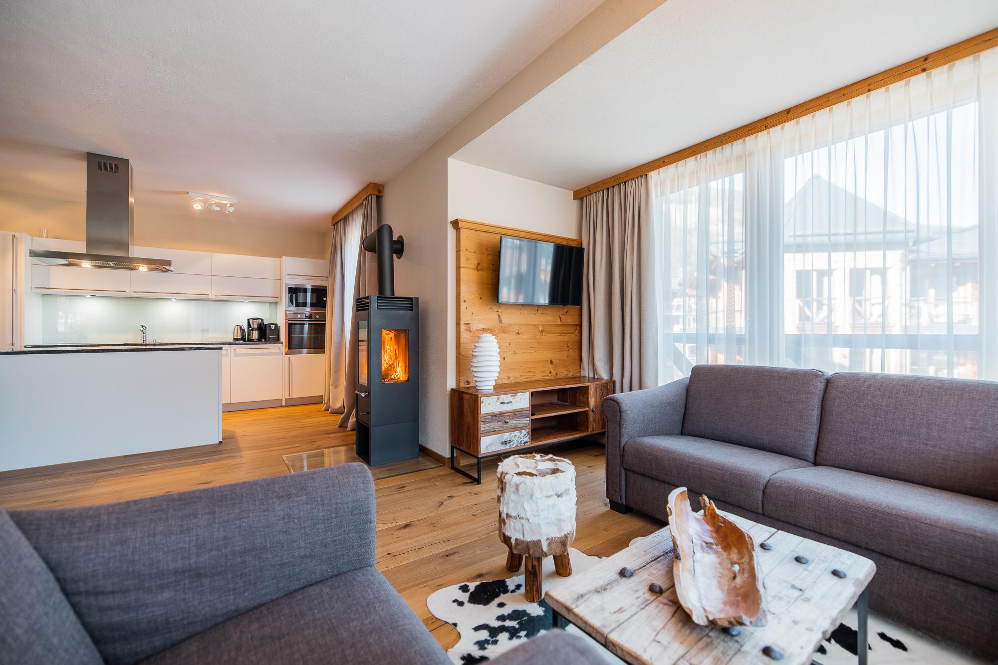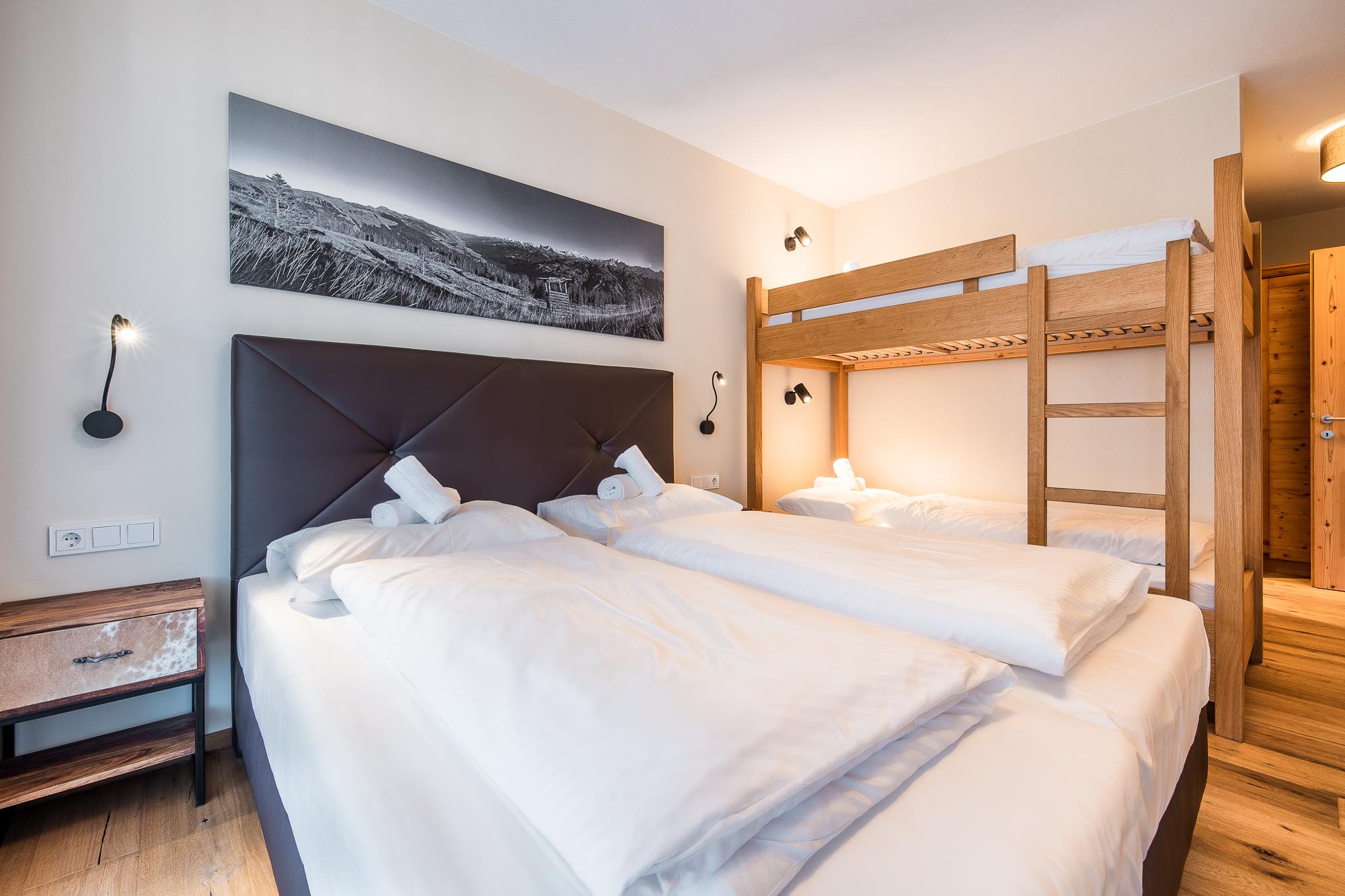 Das großzügige Apartment bietet eine Terrasse oder einen Balkon. Das geschmackvolle und gemütliche Wohnzimmer ist teilweise mit einer komfortablen Schlafcouch für 2 Personen (auf Anfrage; EUR 15,00 pro Person/Tag; Bezahlung vor Ort), LCD Flat-TV, Video on Demand und mit einem Kamin ausgestattet. Die hochwertige, offene Küche mit Kochinsel bietet viel Komfort und ist neben Markengeräten auch noch mit Wasserkocher, Filterkaffe- und Espressomaschine, Toaster, Küchenutensilien und Geschirr ausgestattet. Die 4 Schlafzimmer verfügen über je ein King Size-Boxspringbett und Flat-TVs. In einem der vier Schlafzimmer befindet sich ein zusätzliches Stockbett. Es gibt drei hochwertige Badezimmer wovon sich in einem eine Badewanne befindet.