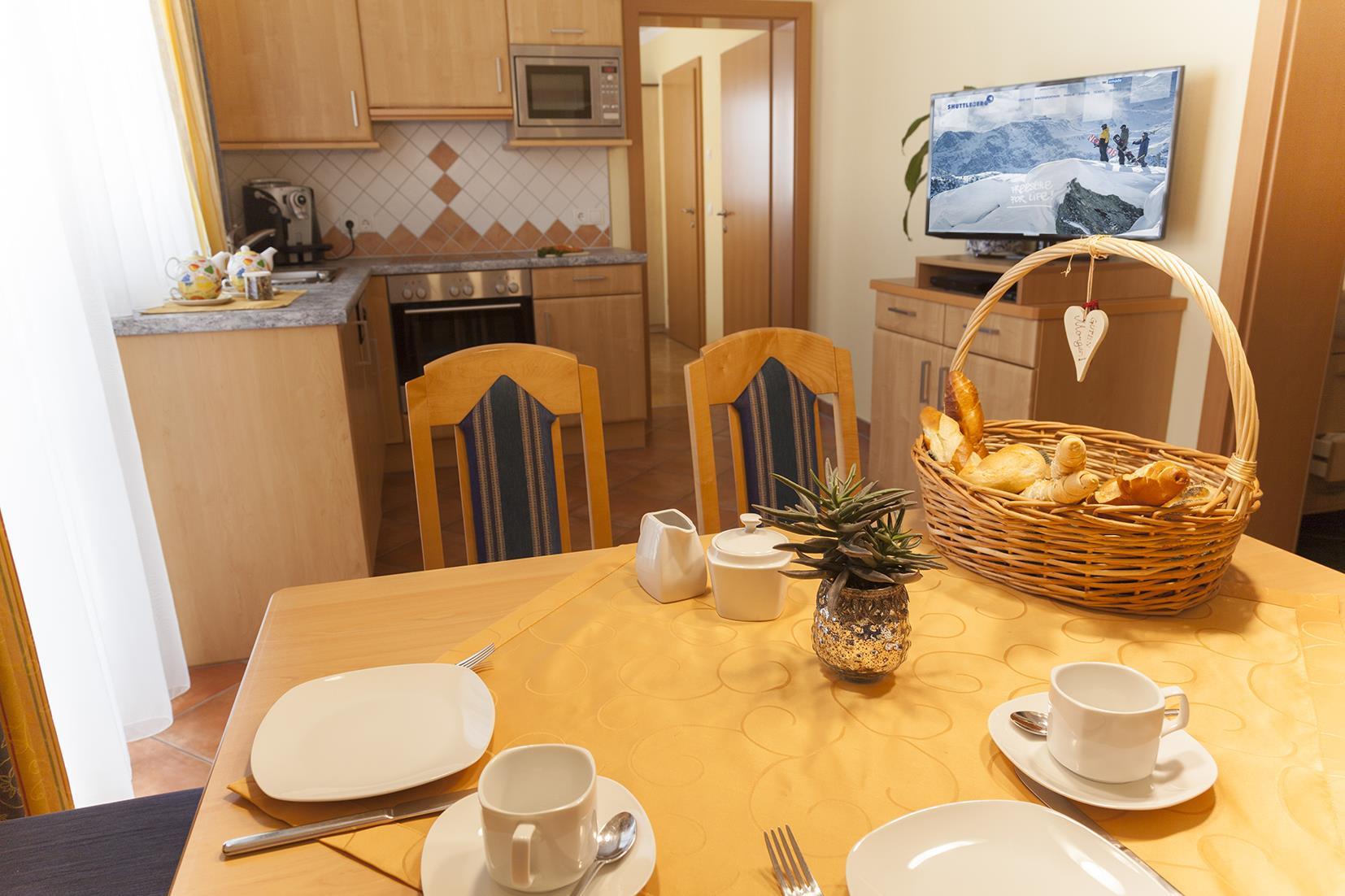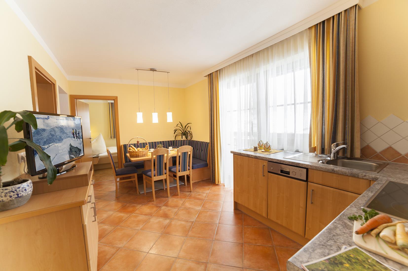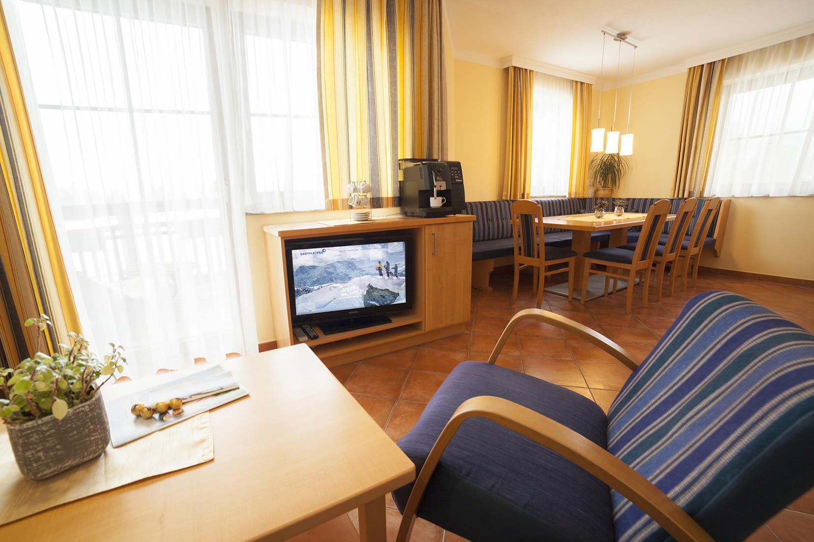 Unser Doppel-Appartement 117m² verfügt über 4 Doppelzimmer mit Allergiker geeigneten Betten, Korkboden und Außen-Jalousien, einen großen Wohnraum bestehend aus einer Küche mit komfortabler Ausstattung (Mikrowelle, Backröhre, Ceranfeld, Geschirrspüler, Kaffeevollautomat, Eierkocher, Toaster, Wasserkocher sowie sämtliches Zubehör), einer großen Essecke (für 10 Personen), einen Wohnbereich mit gemütlichem Sofa, 2x Internetanschluss, TV/DVD, einen zweiten Wohnraum mit einer gemütlichen Wohnecke und TV (2.te Küche), 2xDusche/ 2xWC getrennt und zwei Balkone (1x südseitig und 1x ostseitig). Eigener Skischuhraum mit Schuhtrockner und Parkplatz. Skidepot direkt gegenüber den Bergbahnen. Bettwäsche und Handtücher sind inkludiert.
