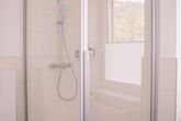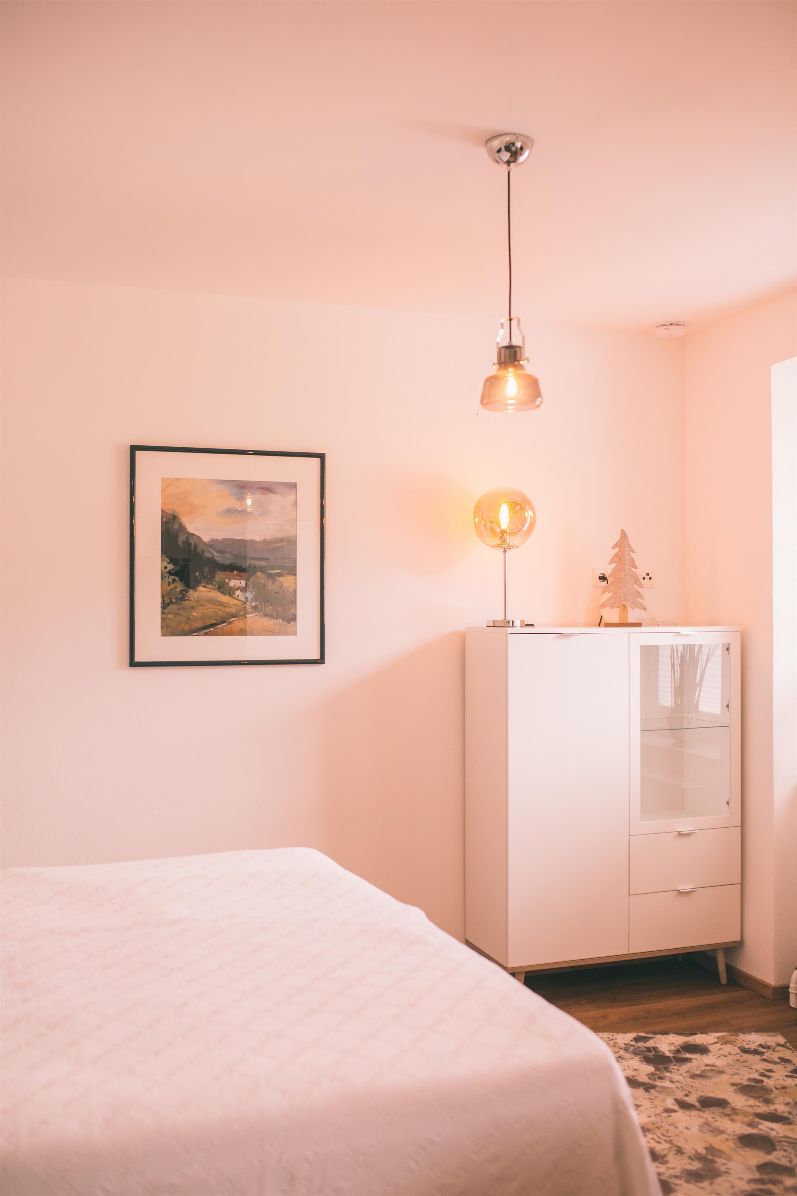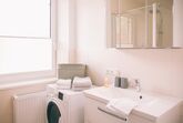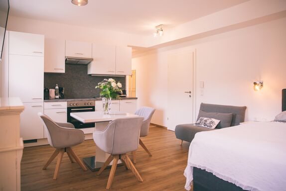 Unser 35qm Apartment (ab 112 €/Nacht und Apartment) ist hell und freundlich gestaltet. Es ist für maximal 3 Personen geeignet (Zustellbett). Es besitzt ein geräumiges Duschbad mit einer großen Dusche, WC und Waschtrockner. Die Gäste haben eine eigene Küche inkl. Backofen, Kühl- und Gefrierschrank, Ceran-Kochfeld und Kapsel-Kaffeemaschine.