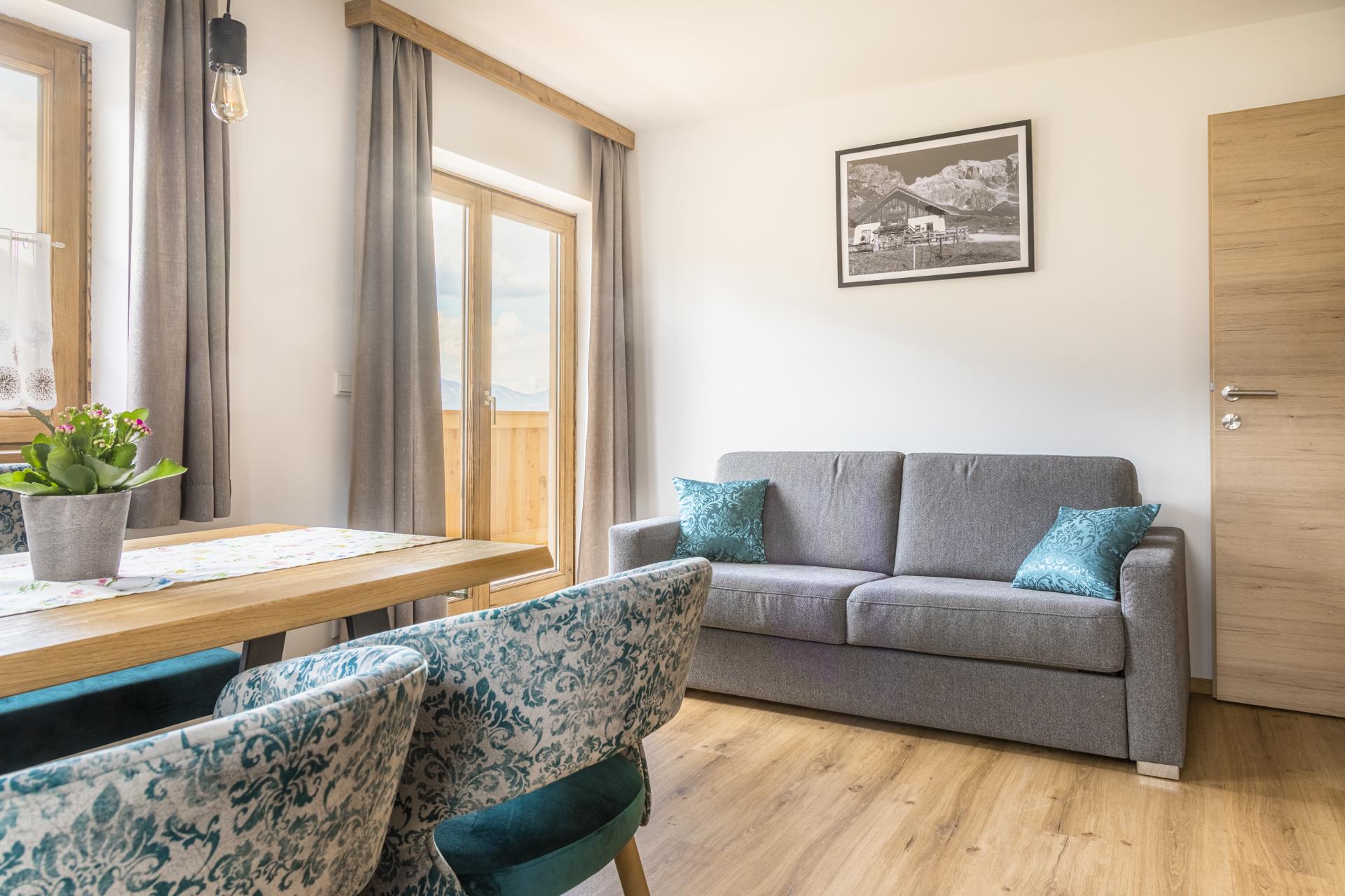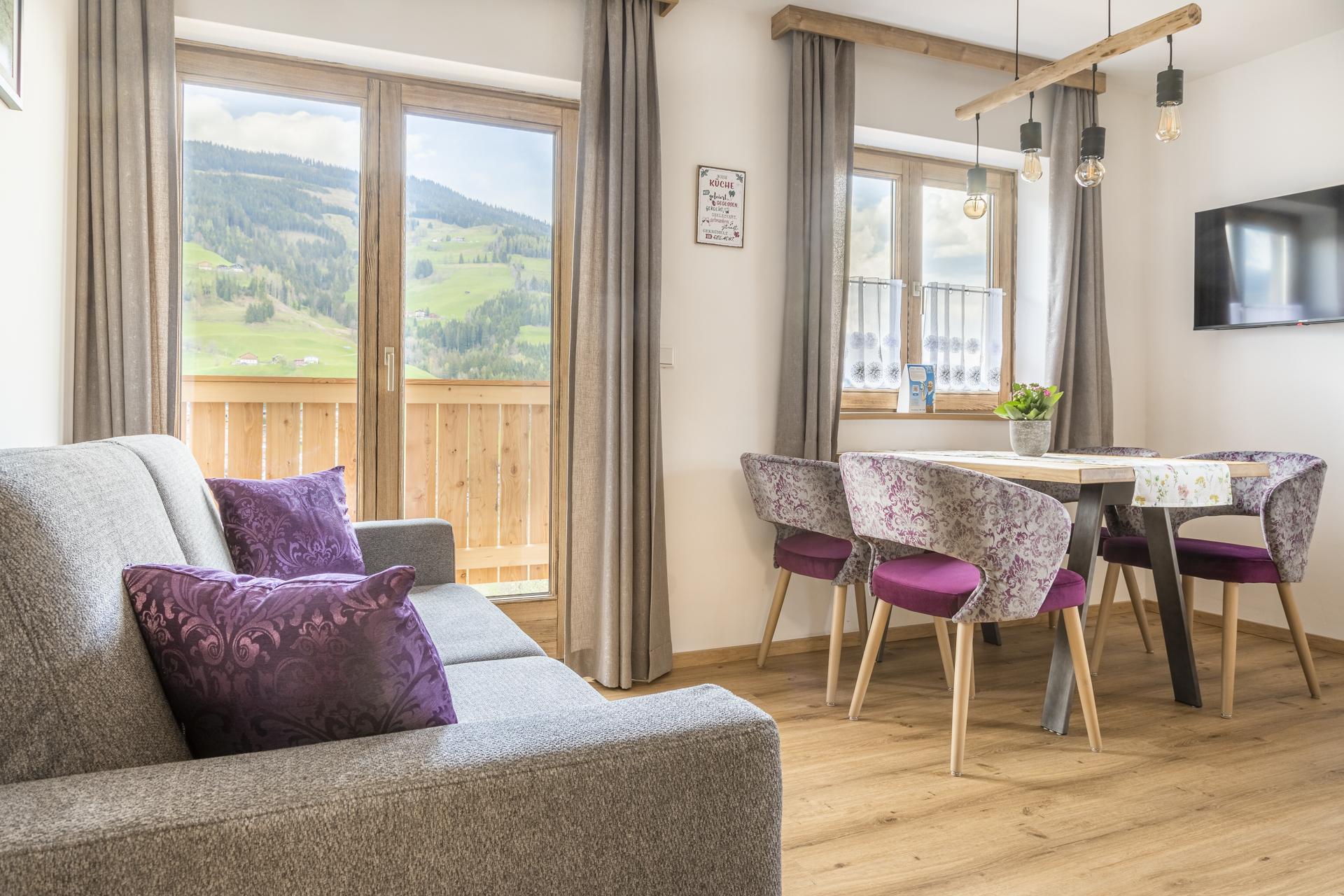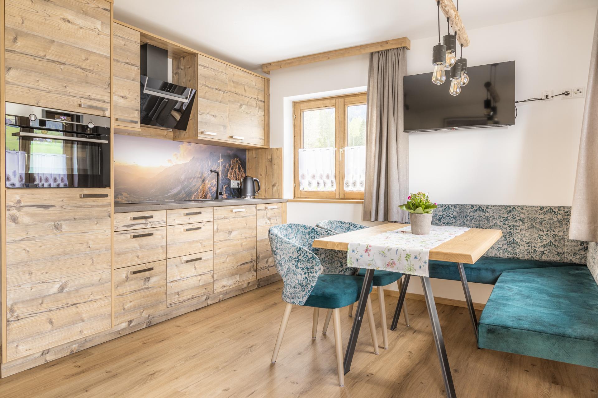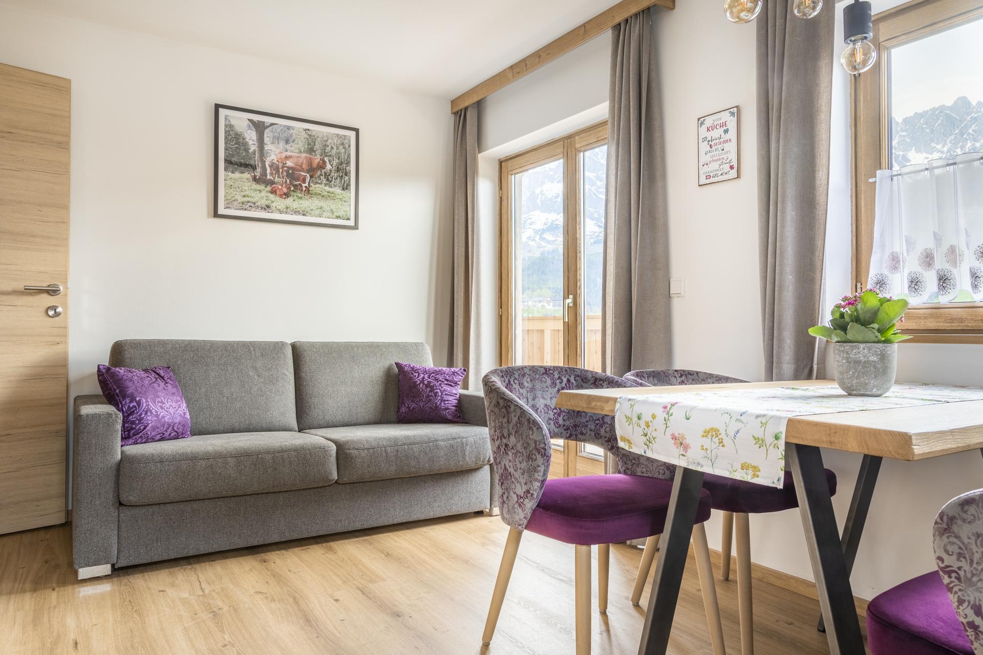 Unsere neu gestaltete Ferienwohnung „Weitsicht“ bietet, wie der Name schon verrät, eine herrliche Weitsicht über das Tal mit Blick in Richtung Nachbarort Bischofshofen. Mit ca. 35 qm bietet sie Platz für bis zu vier Personen, ideal für Familien oder Paare. Die modern, rustikal gestaltete Wohnung besteht aus einem Schlafzimmer für zwei Personen mit Doppelbett und einem Wohnbereich mit Ausziehcouch und Schlafmöglichkeit für zwei Personen. Zudem verfügt die Ferienwohnung „Weitsicht“ über ein Badezimmer mit Dusche und eine separate Toilette. Die Küche im Wohnbereich bietet Ihren Gästen einen Elektroherd, Backofen, Mikrowelle, Kaffeemaschine, Wasserkocher, Toaster und auch eine Geschirrspülmaschine.